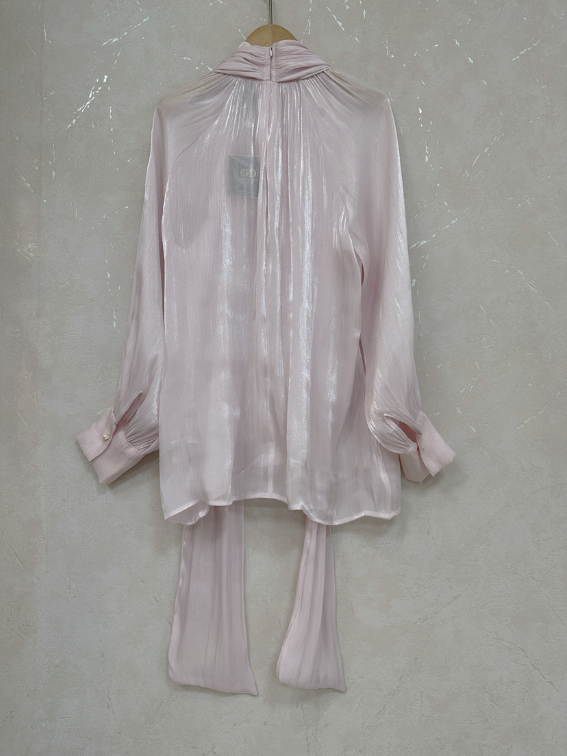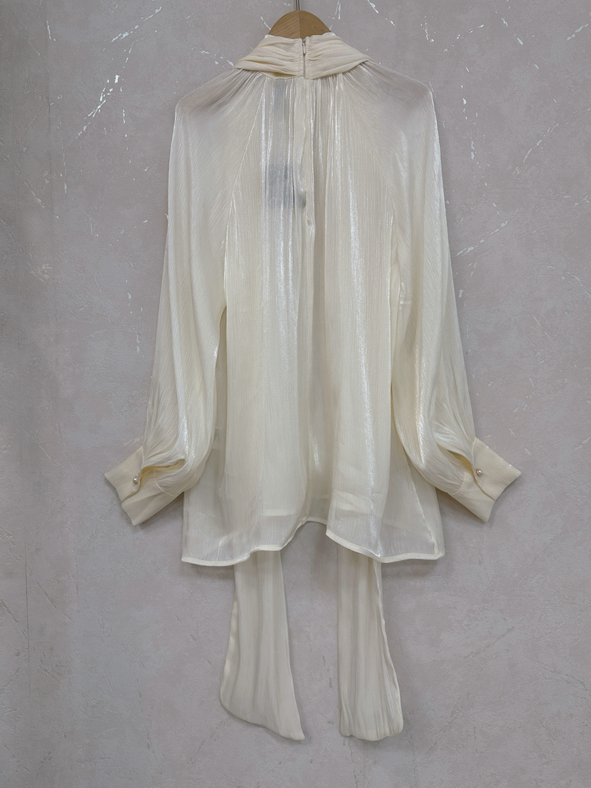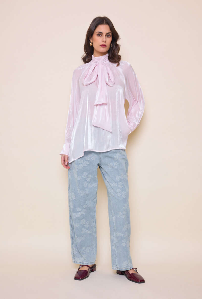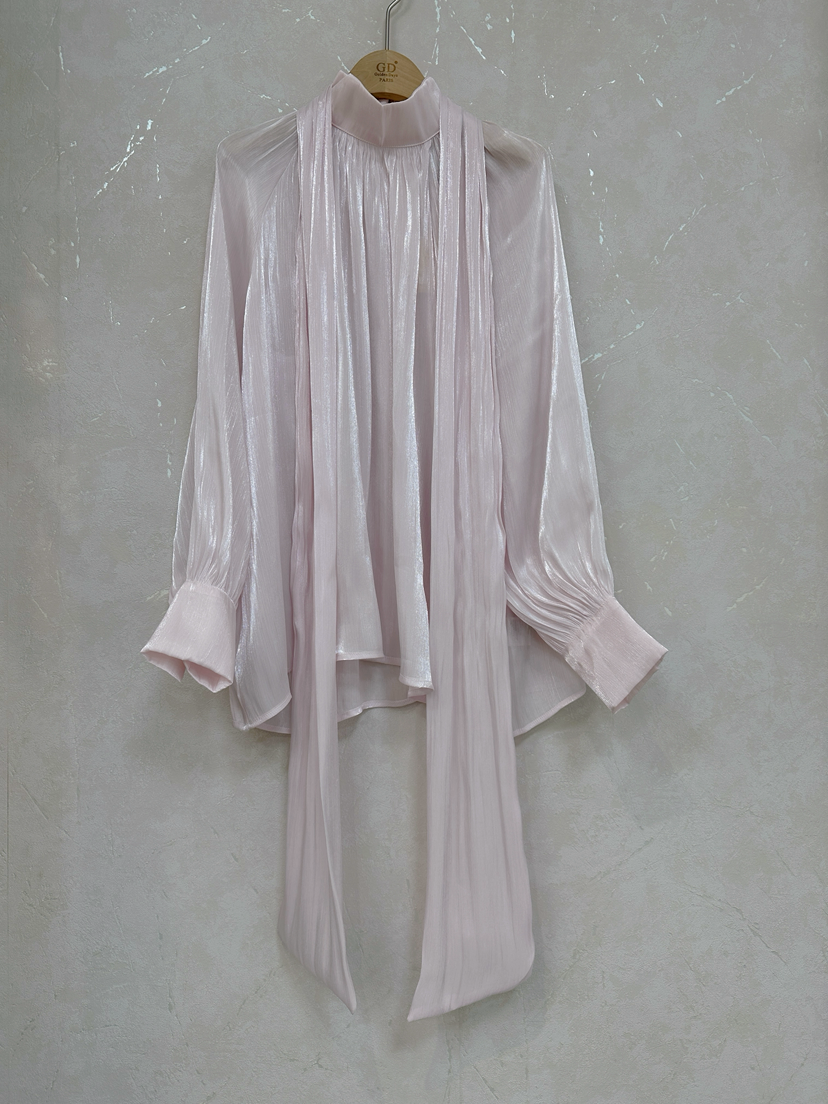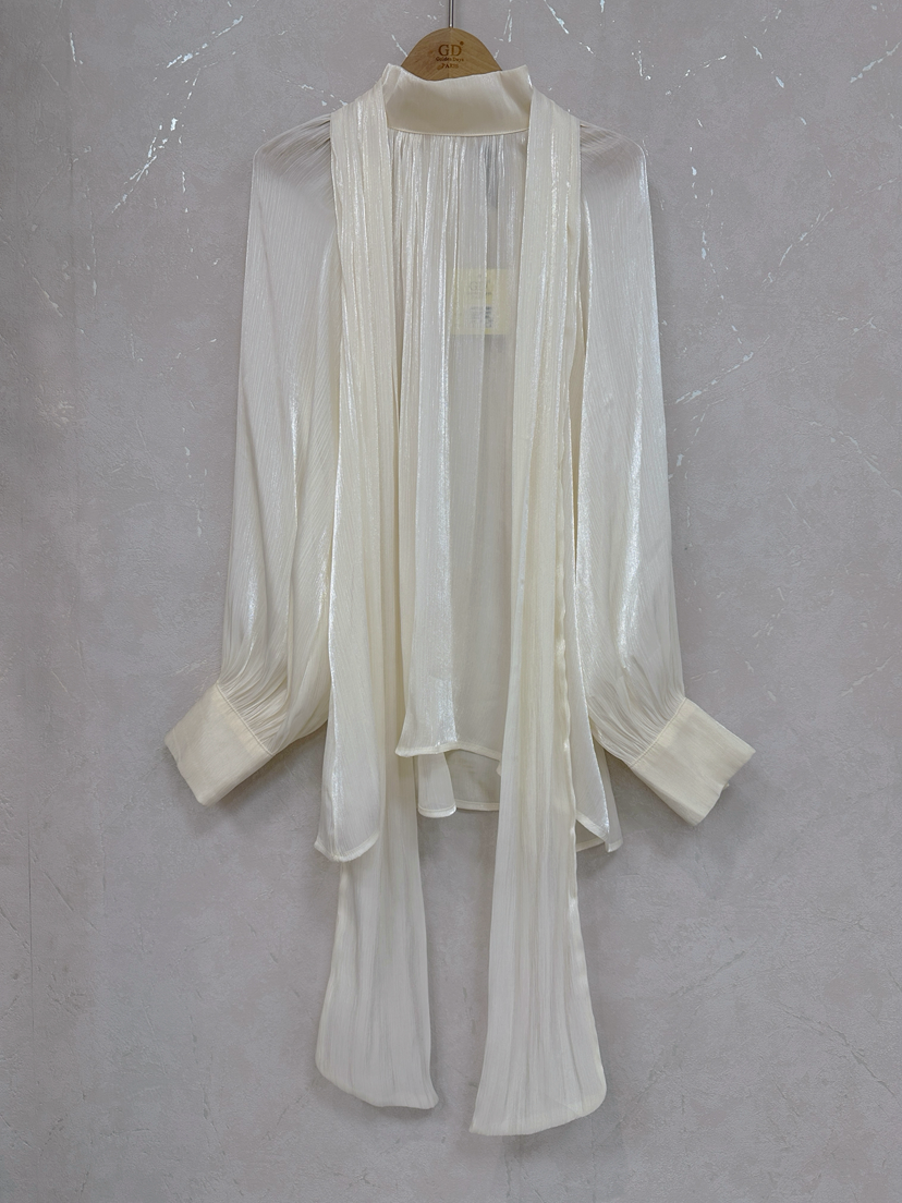 Efektowna koszula o luźnym kroju z połyskującego materiału w kolorze czekoladowym. Stójka i długie bufiaste rękawy dodają jej elegancji i wyjątkowego stylu.