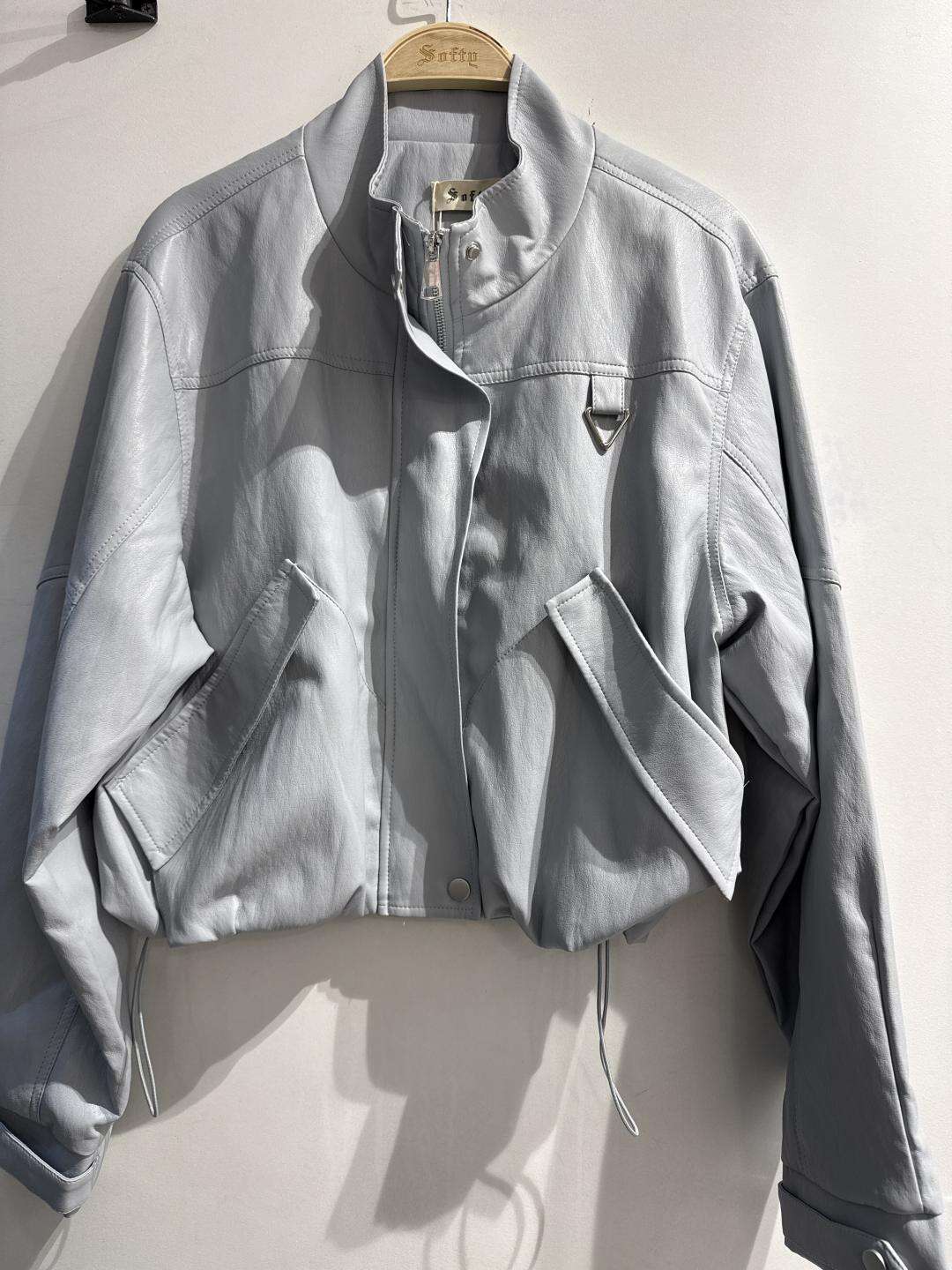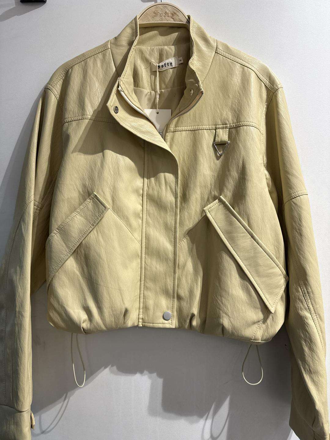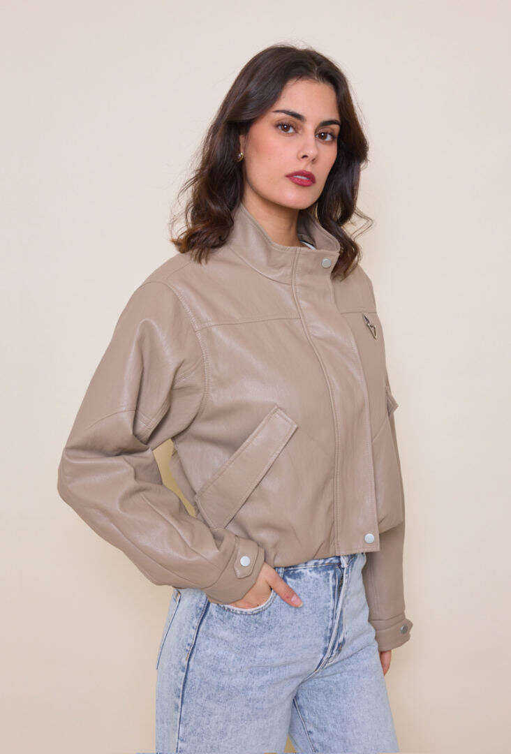 Krótka, modna kurtka o oversize’owym kroju, zapinana na suwak i napy, z praktycznymi kieszeniami i regulowanym dołem.