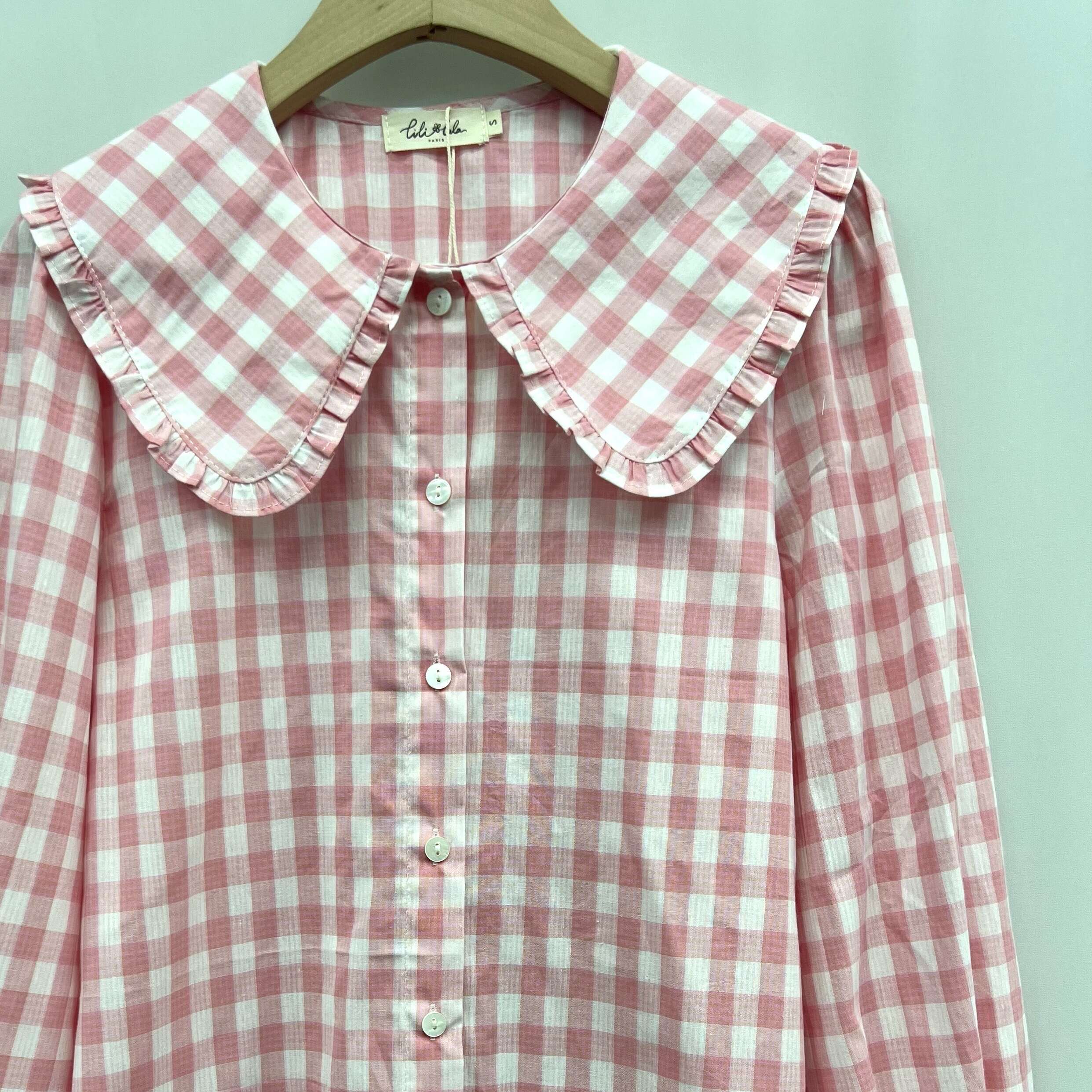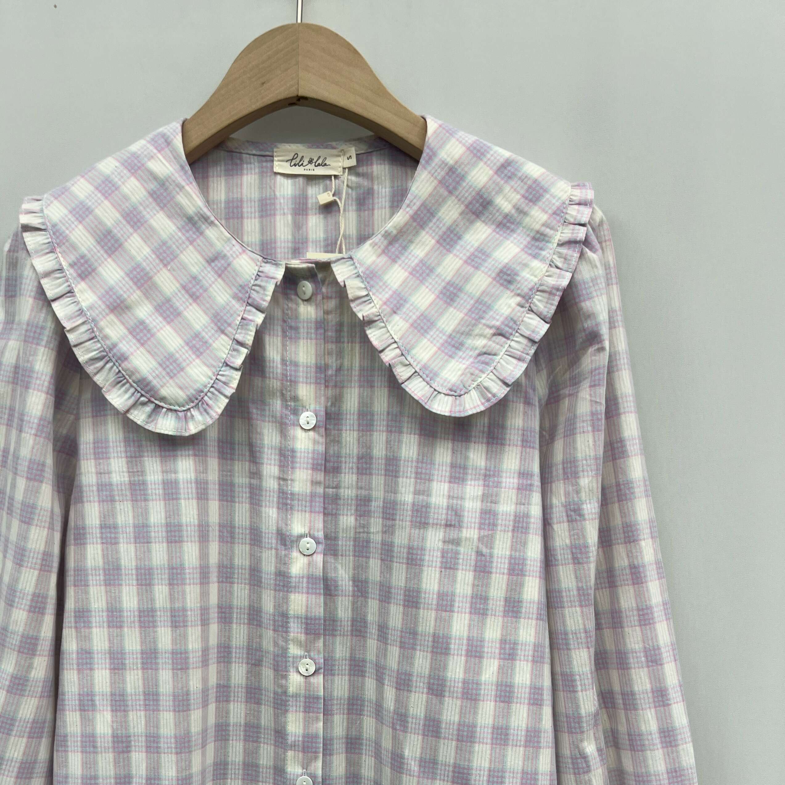 Stylowa koszula w delikatną kratkę z szerokim, falbaniastym kołnierzem. Lekki materiał zapewnia wygodę i kobiecy wygląd na co dzień.