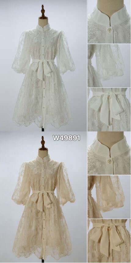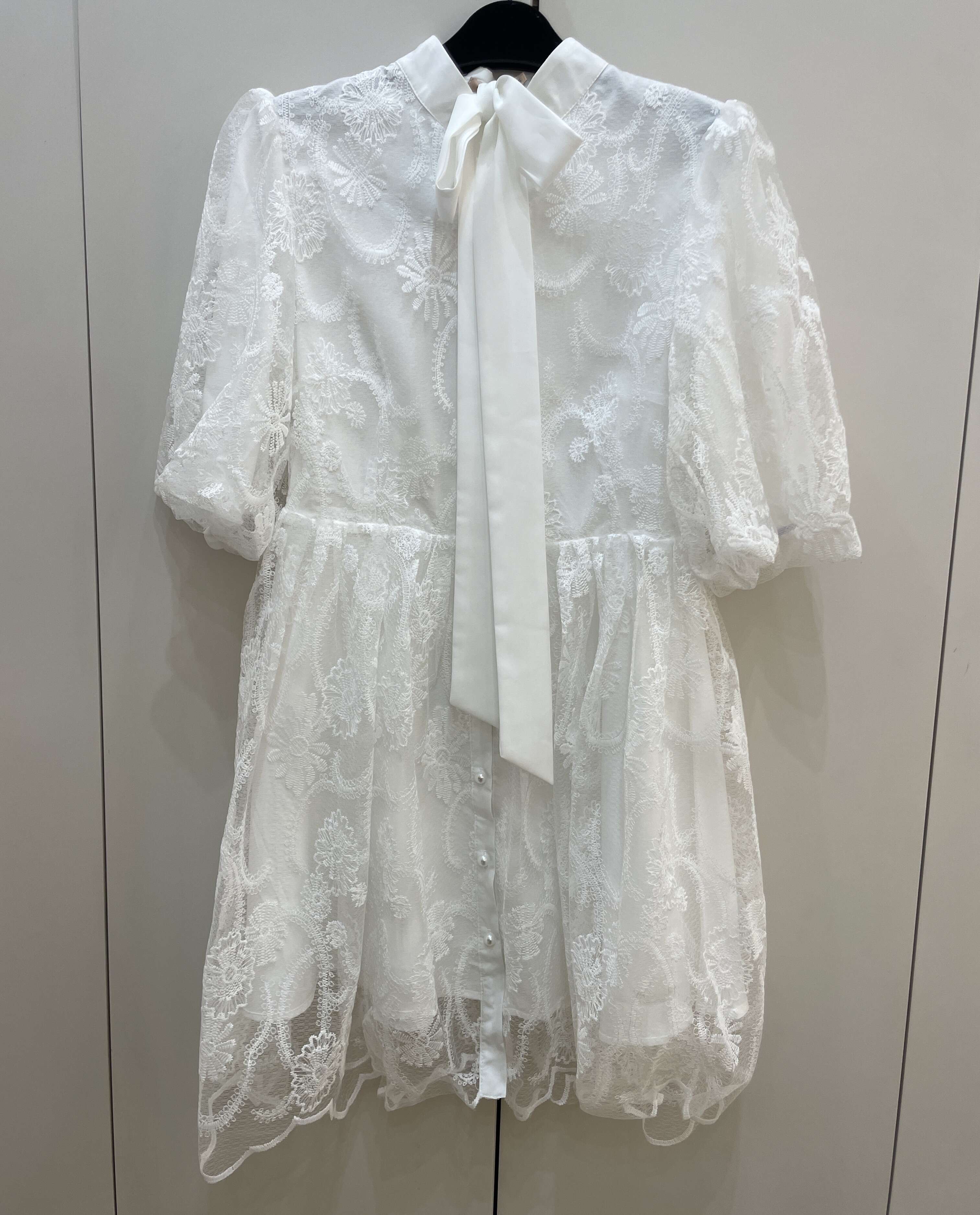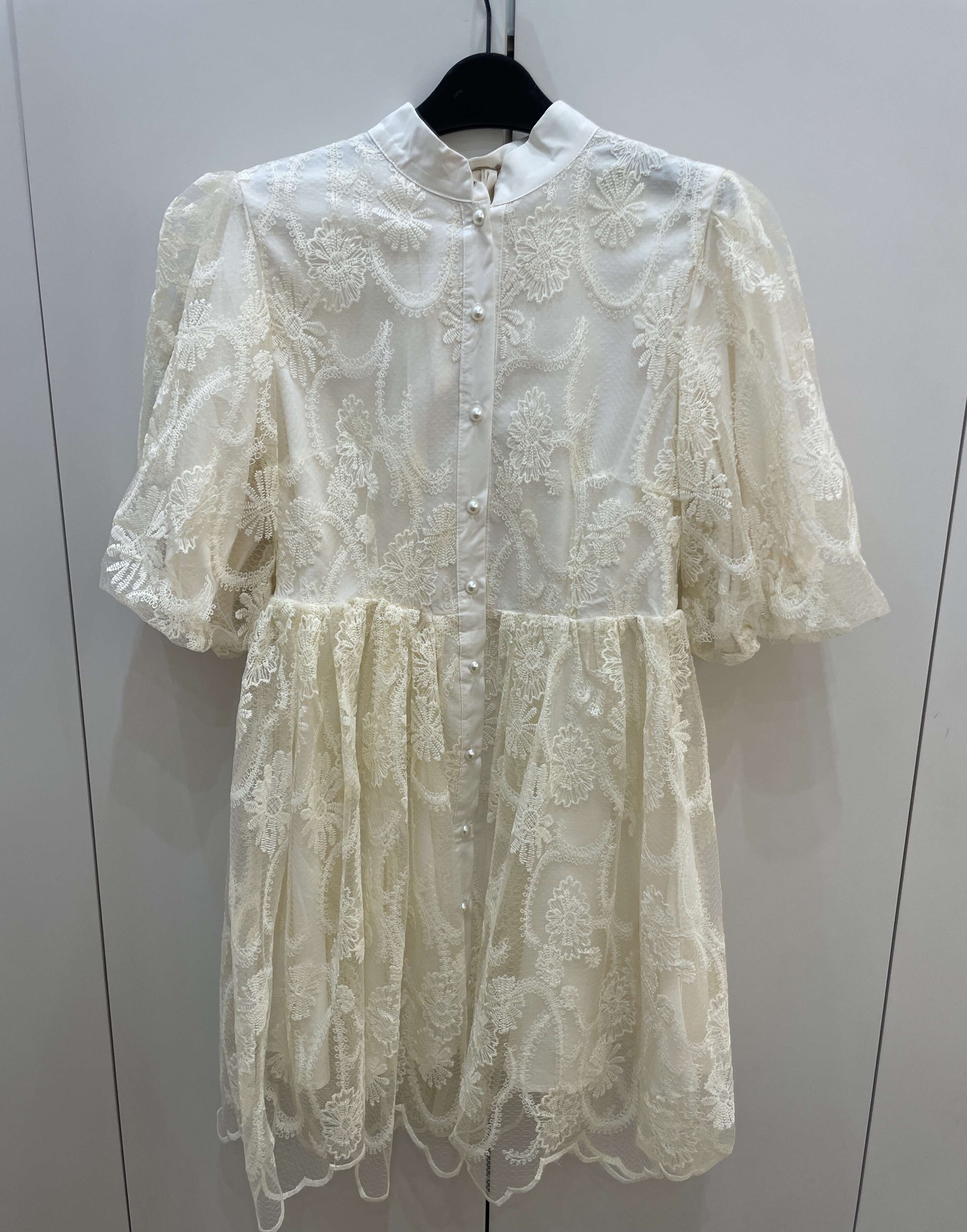 Zwiewna sukienka z delikatnej koronki, z eleganckimi bufkami i perłowymi guzikami. Idealna na wyjątkowe okazje.
