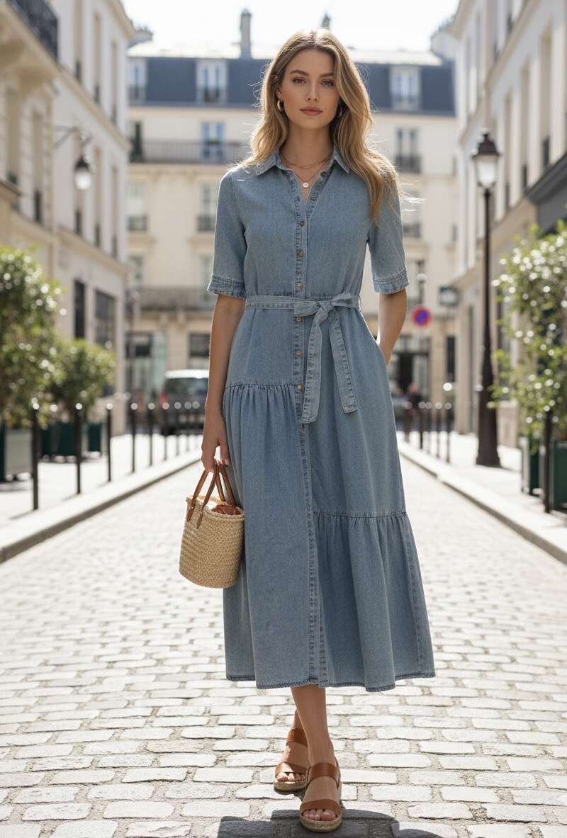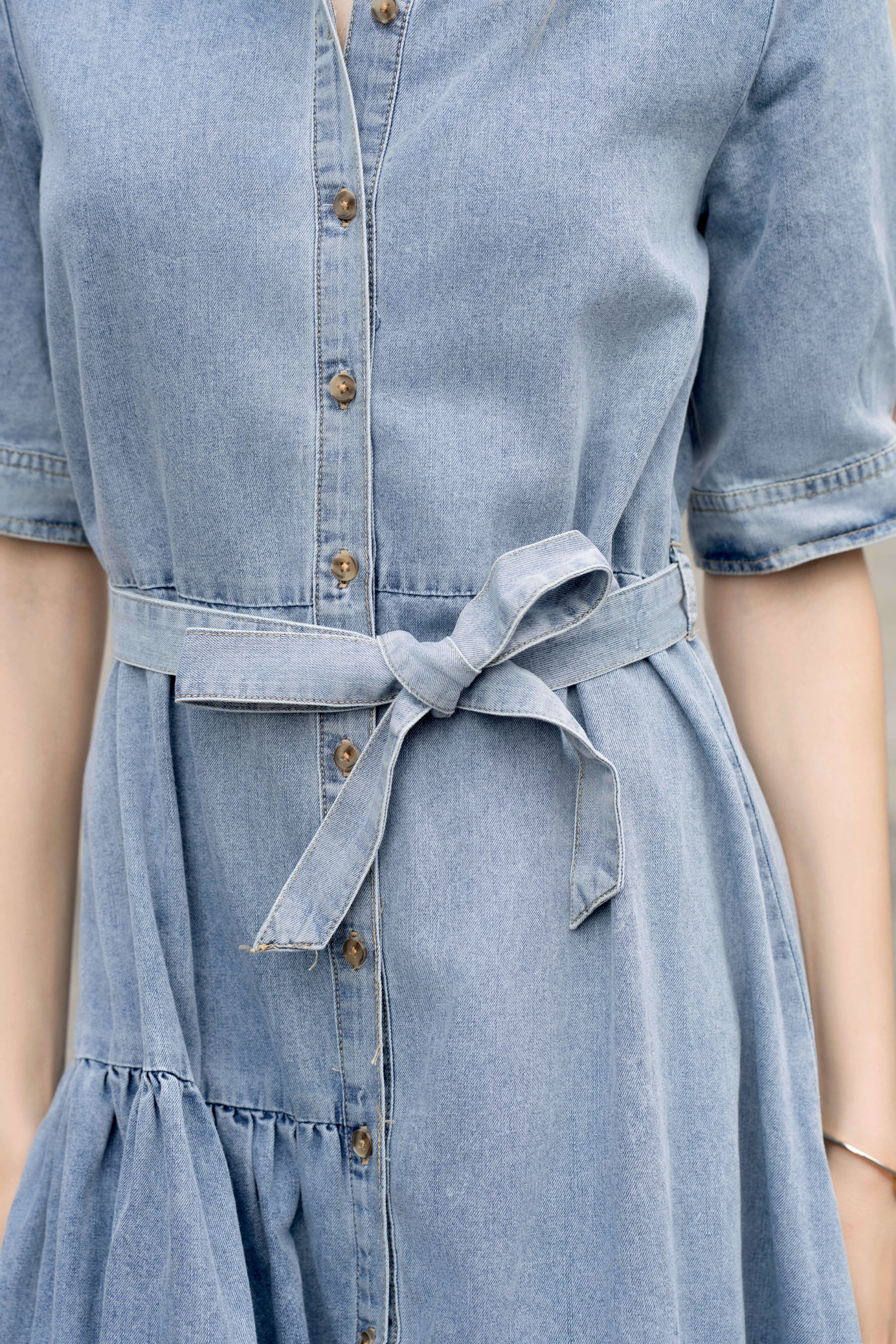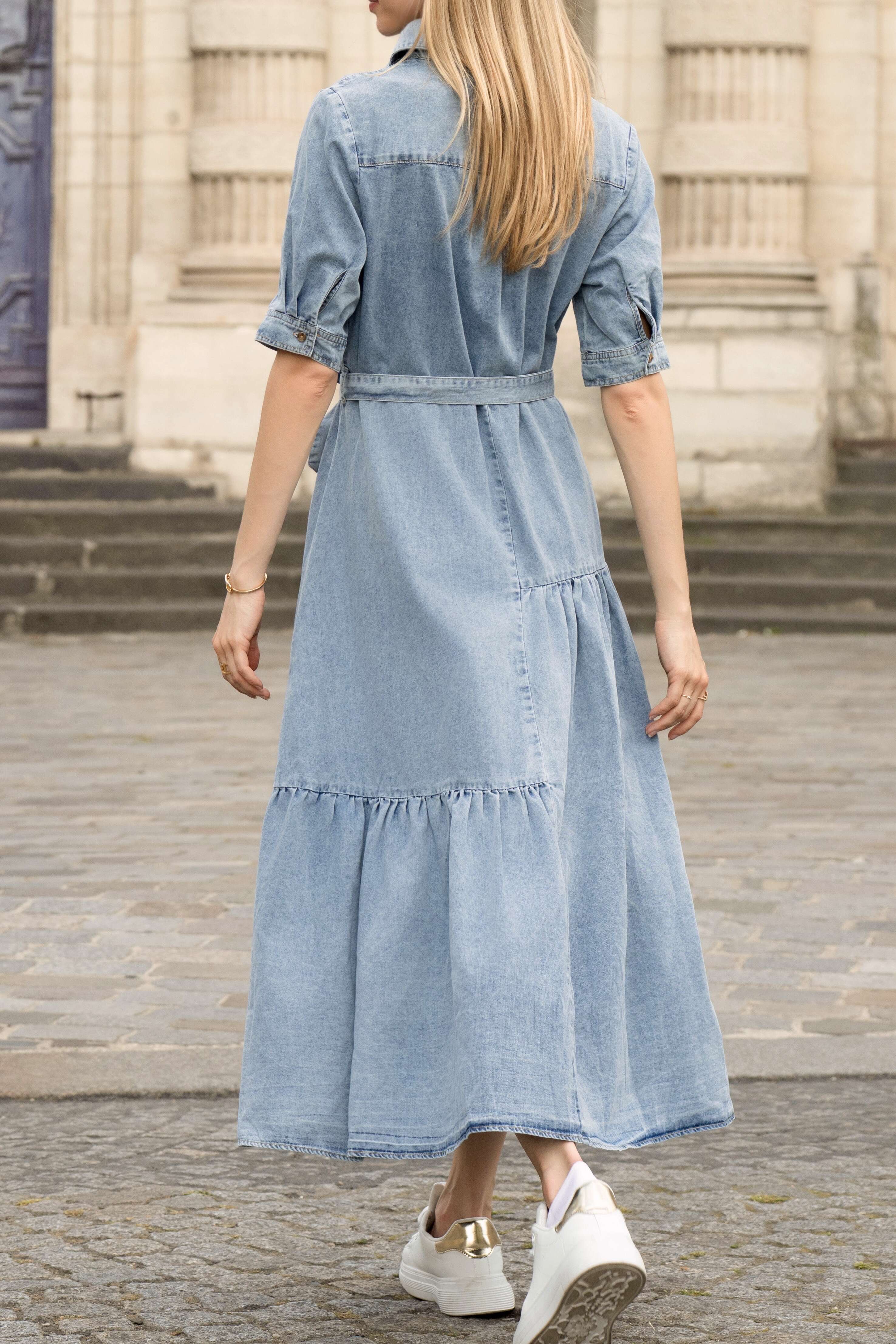 Jeansowa sukienka o koszulowym kroju, wiązana w pasie, zapewniająca wygodę i modny look na co dzień.