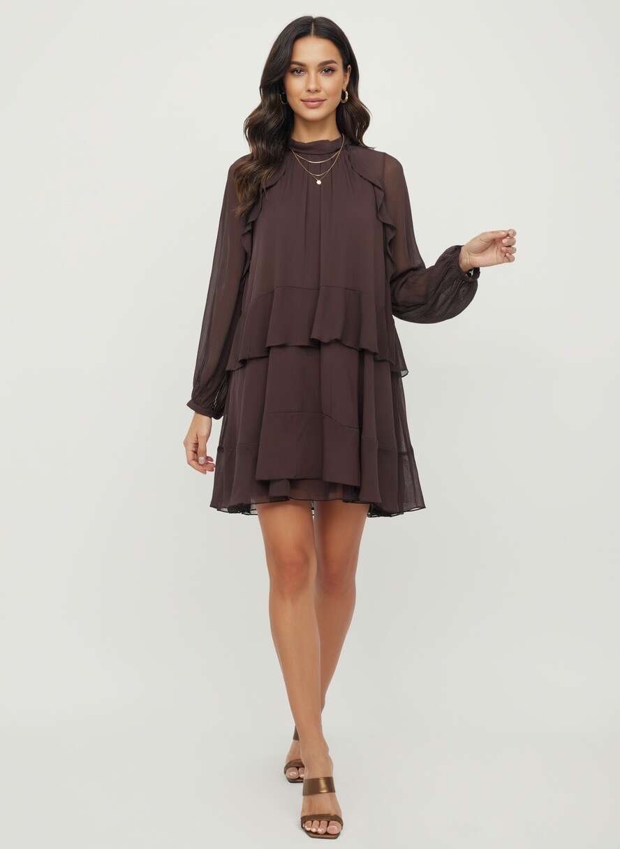 Sukienka LIBRETTO to bestsellerowy model dedykowany klientkom ceniącym wygodę i modny wygląd. Dostępna w głębokim, czekoladowym oraz eleganckim bordowym kolorze, idealnie wpisuje się zarówno w codzienne, jak i wyjątkowe stylizacje. Zwiewny, warstwowy krój z delikatnymi falbanami subtelnie podkreśla sylwetkę i zapewnia swobodę ruchów, a długie, transparentne rękawy dodają lekkości. Wysokiej jakości materiał sprawia, że sukienka prezentuje się ekskluzywnie, a jej uniwersalność pozwala na noszenie do pracy, na przyjęcia czy spotkania rodzinne. Szeroki wybór rozmiarów gwarantuje dopasowanie do różnych typów sylwetek, co czyni ten model świetnym wyborem do sprzedaży hurtowej.
