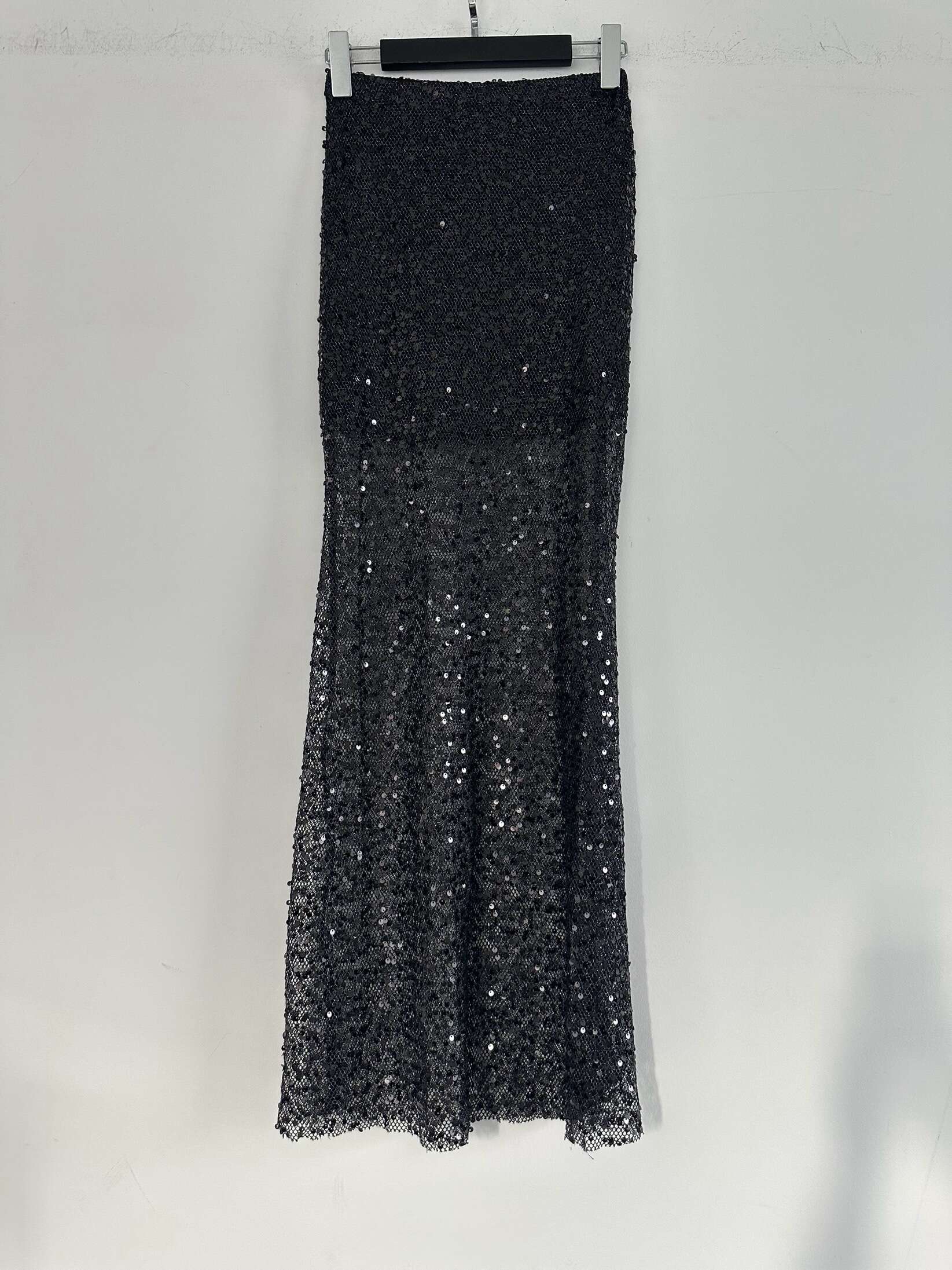 Długa, czarna spódnica z transparentną warstwą ozdobioną cekinami – błysk, zmysłowość i wyjątkowy styl na specjalne okazje.