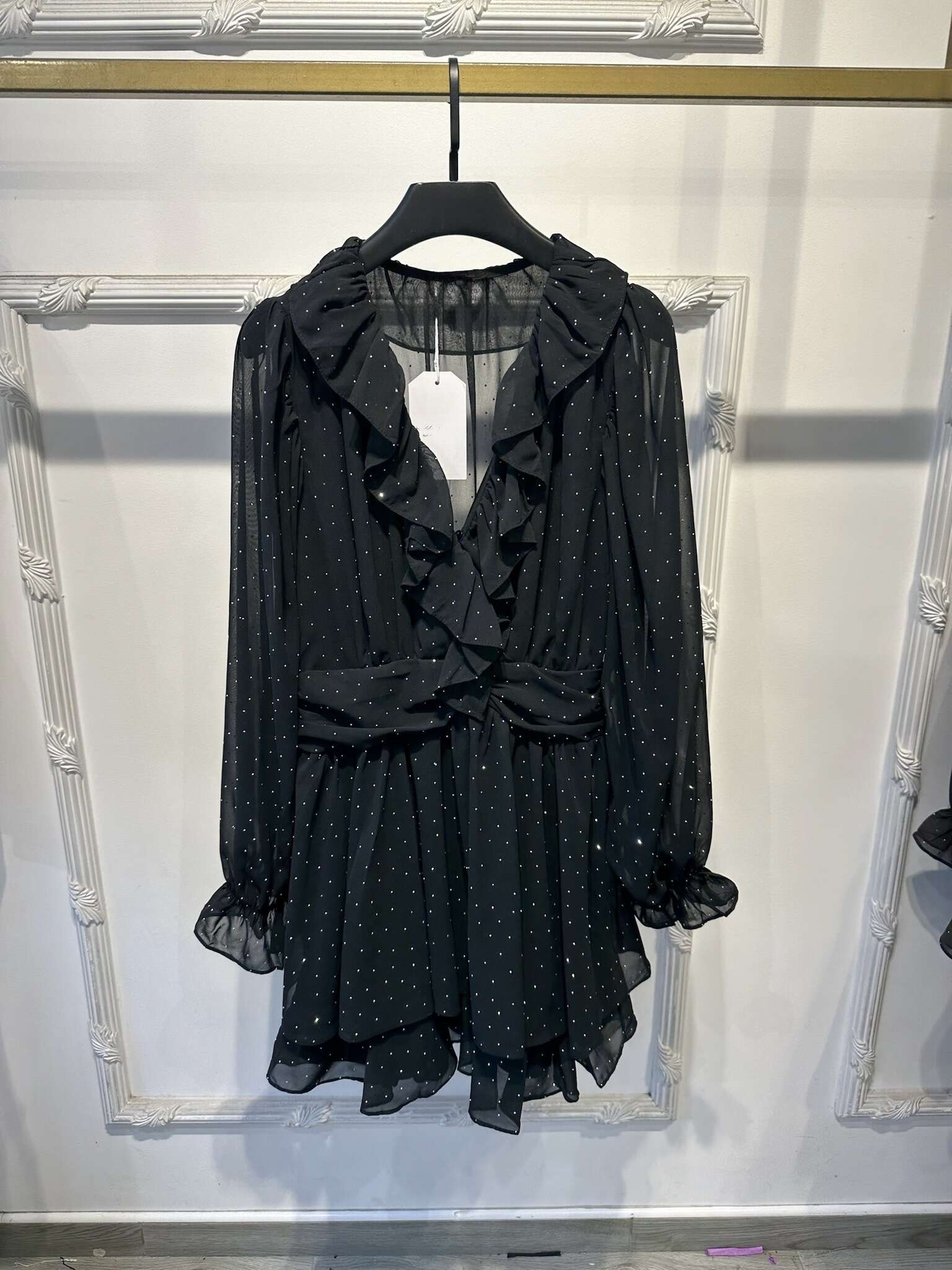 Zwiewna sukienka mini z falbanami i delikatnym wzorem w kropki – połączenie kobiecej lekkości i elegancji, idealna na wiele okazji.