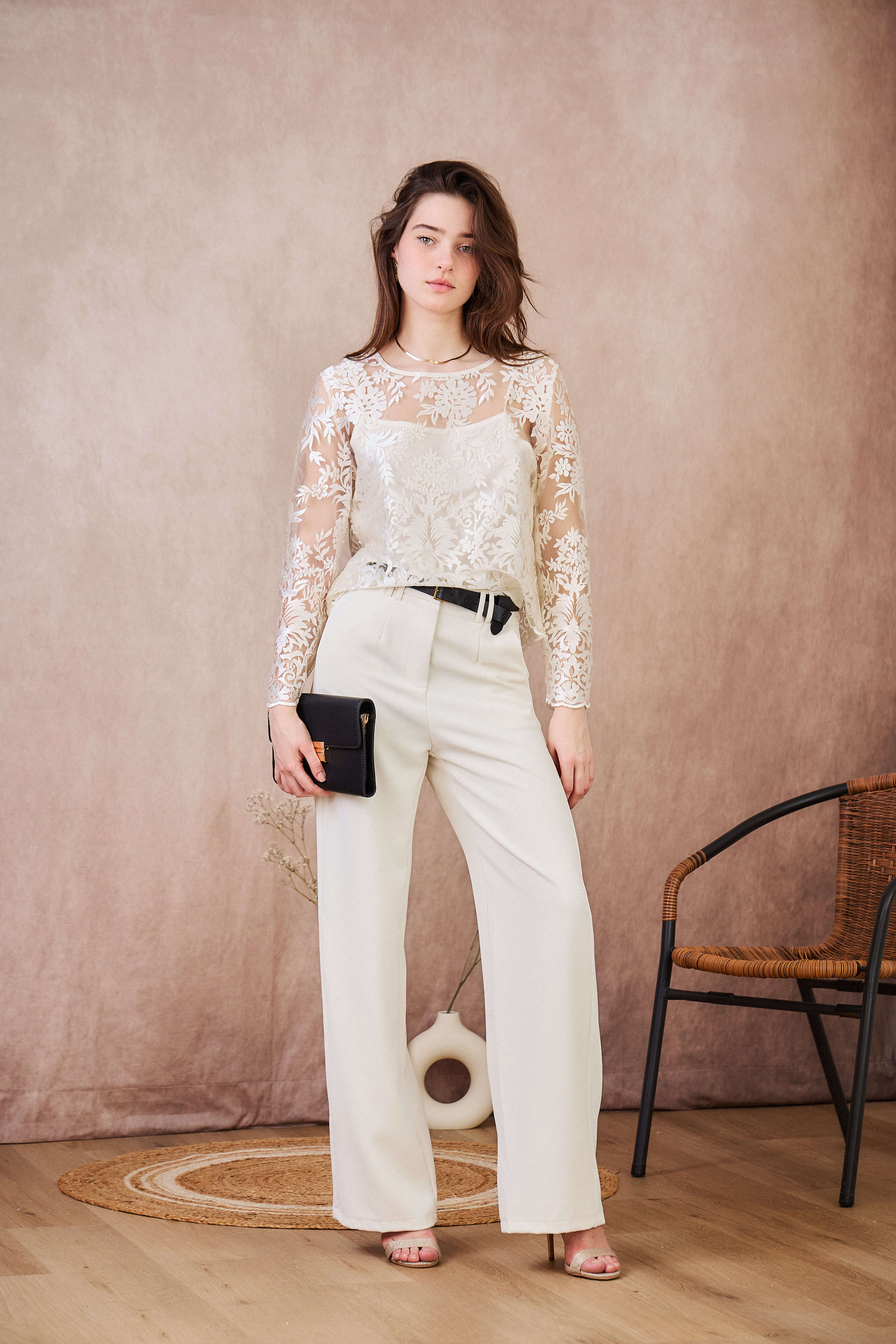 Subtelna bluzka z transparentnego materiału z haftowanym motywem roślinnym, elegancka i wygodna, idealna na wyjątkowe okazje.
