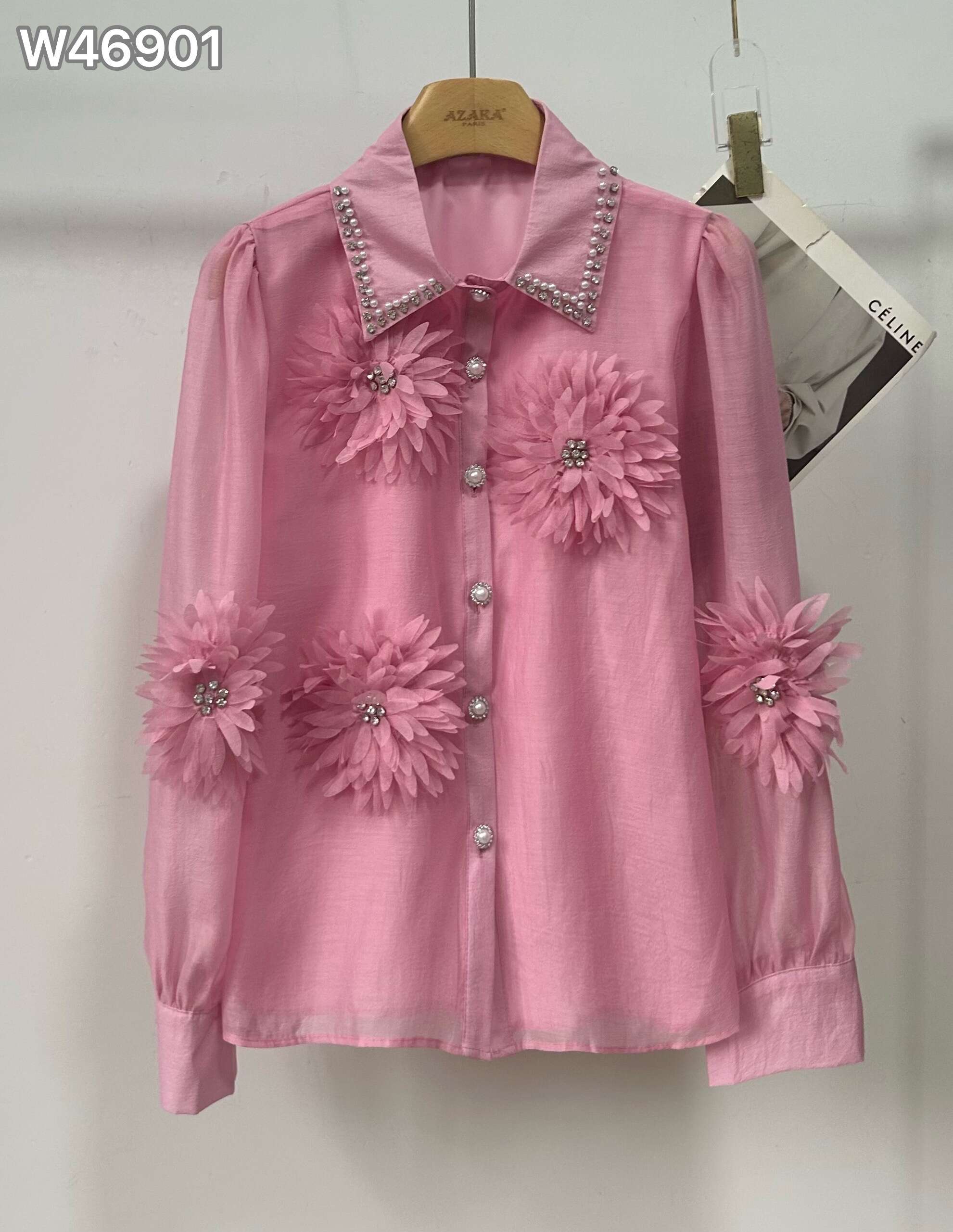 Przezroczysta koszula z perłowymi guzikami i kwiatowymi aplikacjami, ozdobiona kryształkami na kołnierzyku – wyjątkowa propozycja na wieczorne wyjścia i stylizacje premium.