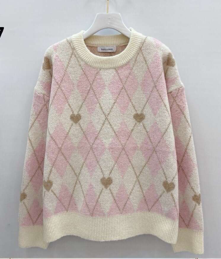 Ciepły, miękki sweter w kremowo-różową kratę z subtelnymi serduszkami, idealny na chłodniejsze dni.
