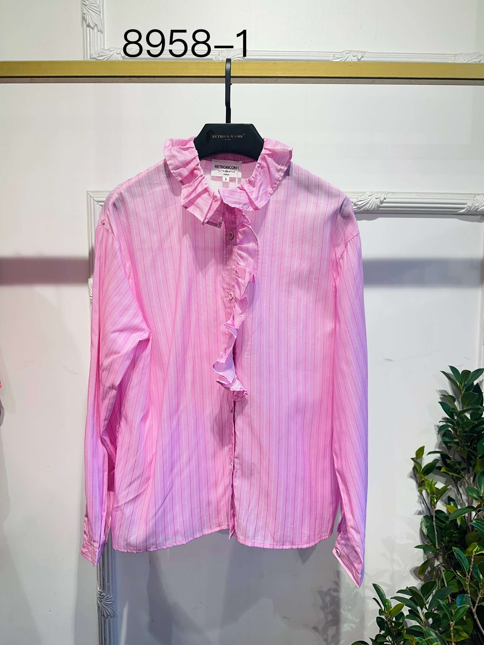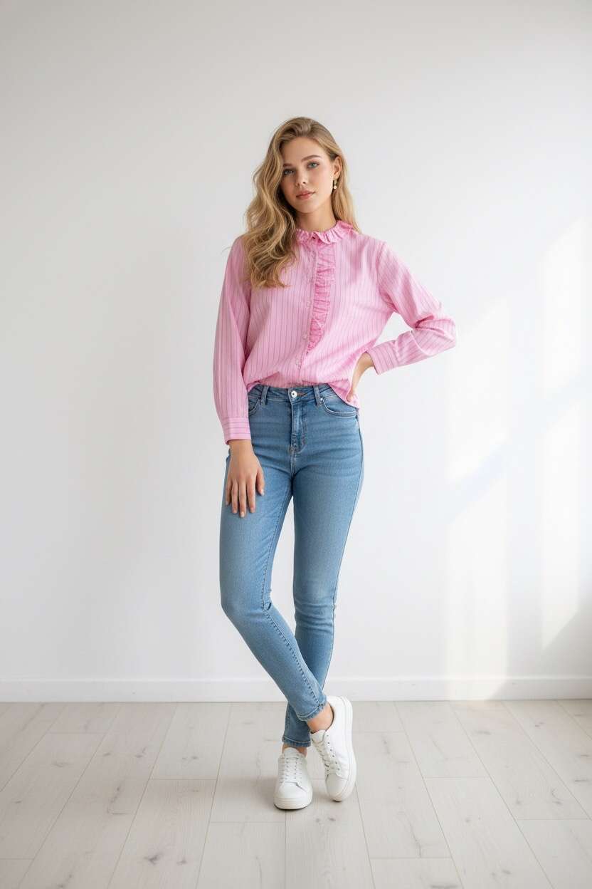 Subtelnie różowa koszula w paski z falbanką przy dekolcie, wykonana z lekkiego i przyjemnego materiału – idealna na co dzień i do pracy.