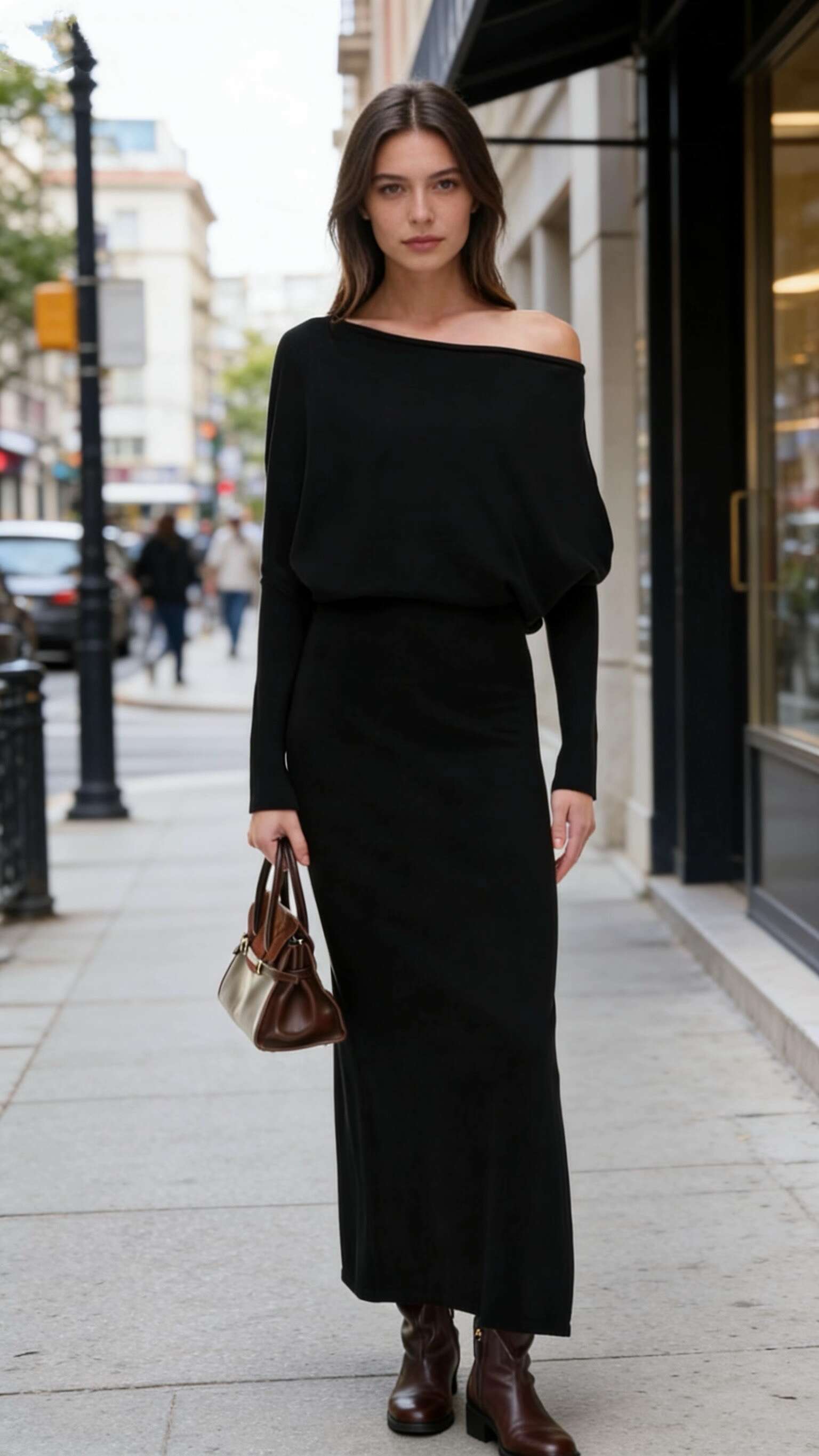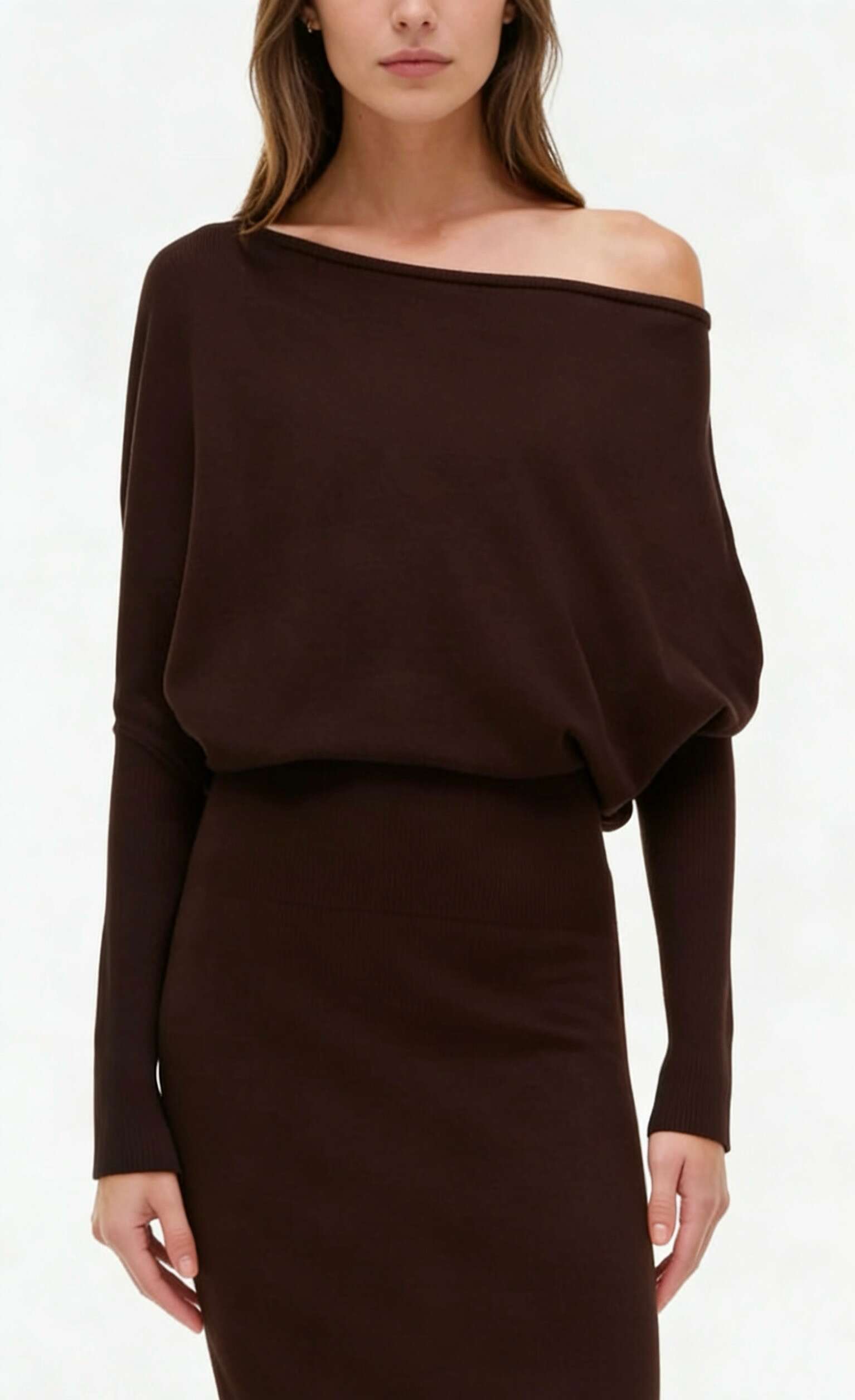 Elegancka, długa sukienka z miękkiego materiału, z opadającym ramieniem i subtelnym fasonem, który zapewnia wygodę i ponadczasowy styl.