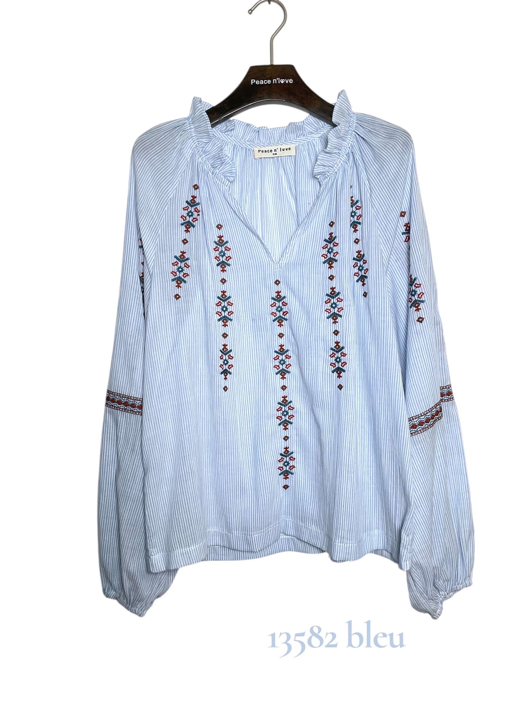 Lekka, błękitna koszula o luźnym kroju z subtelnym haftem na przodzie i rękawach, idealna na każdą okazję.