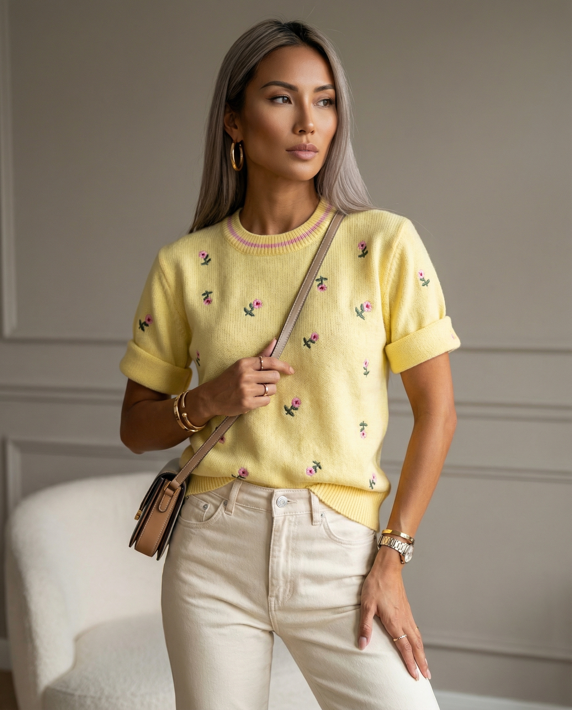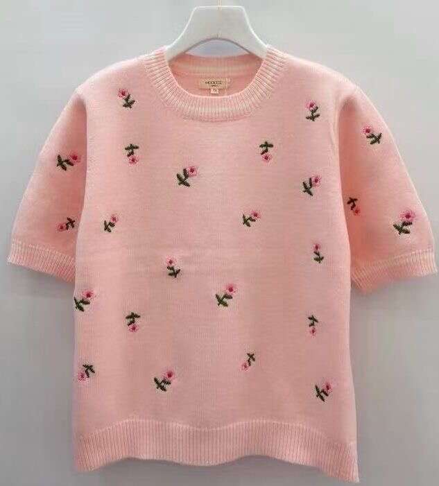 Krótki, ultrakobiecy sweter z haftem w kwiaty, wykonany z miękkiego, przyjaznego dla skóry materiału – idealny na wiosnę i lato.