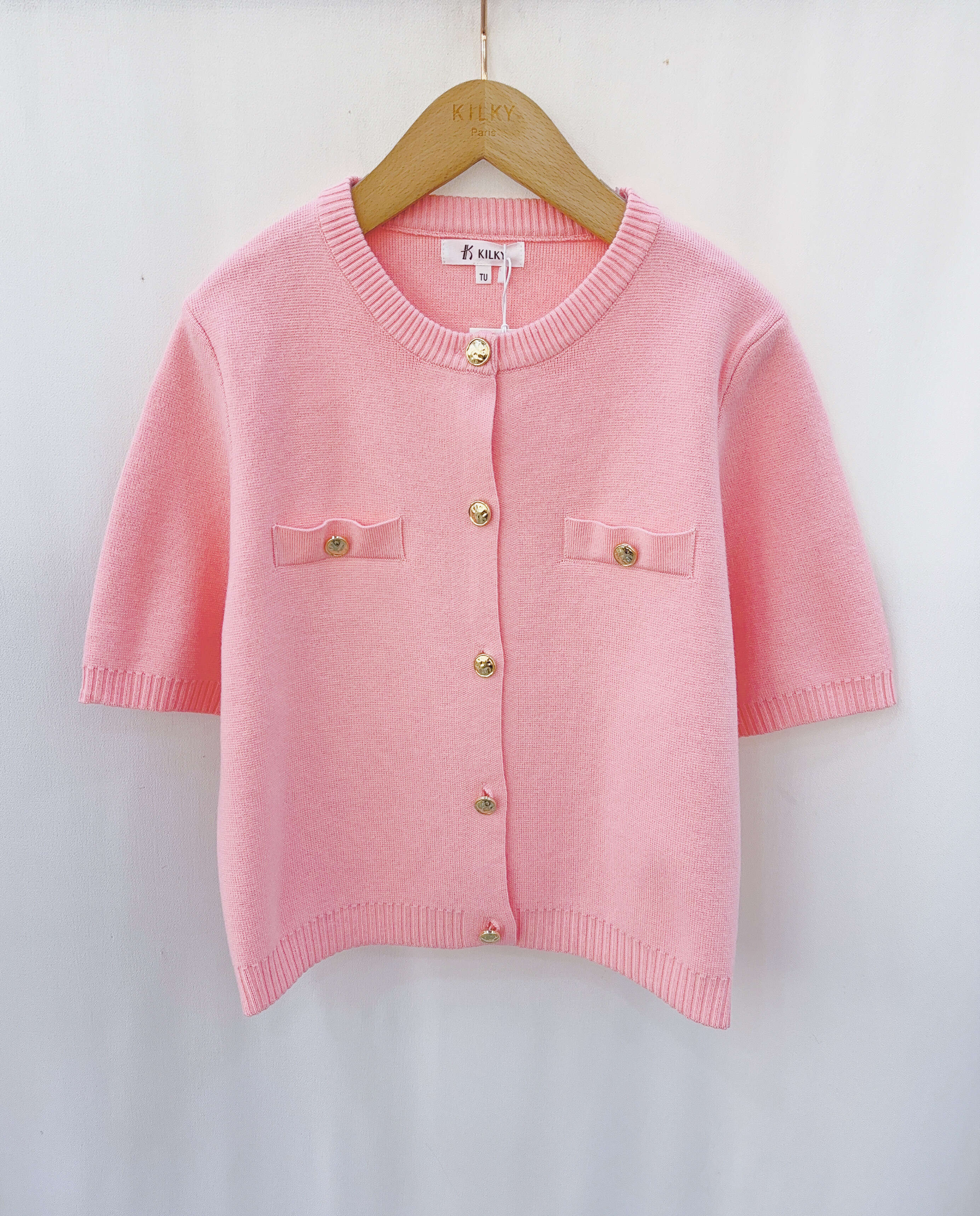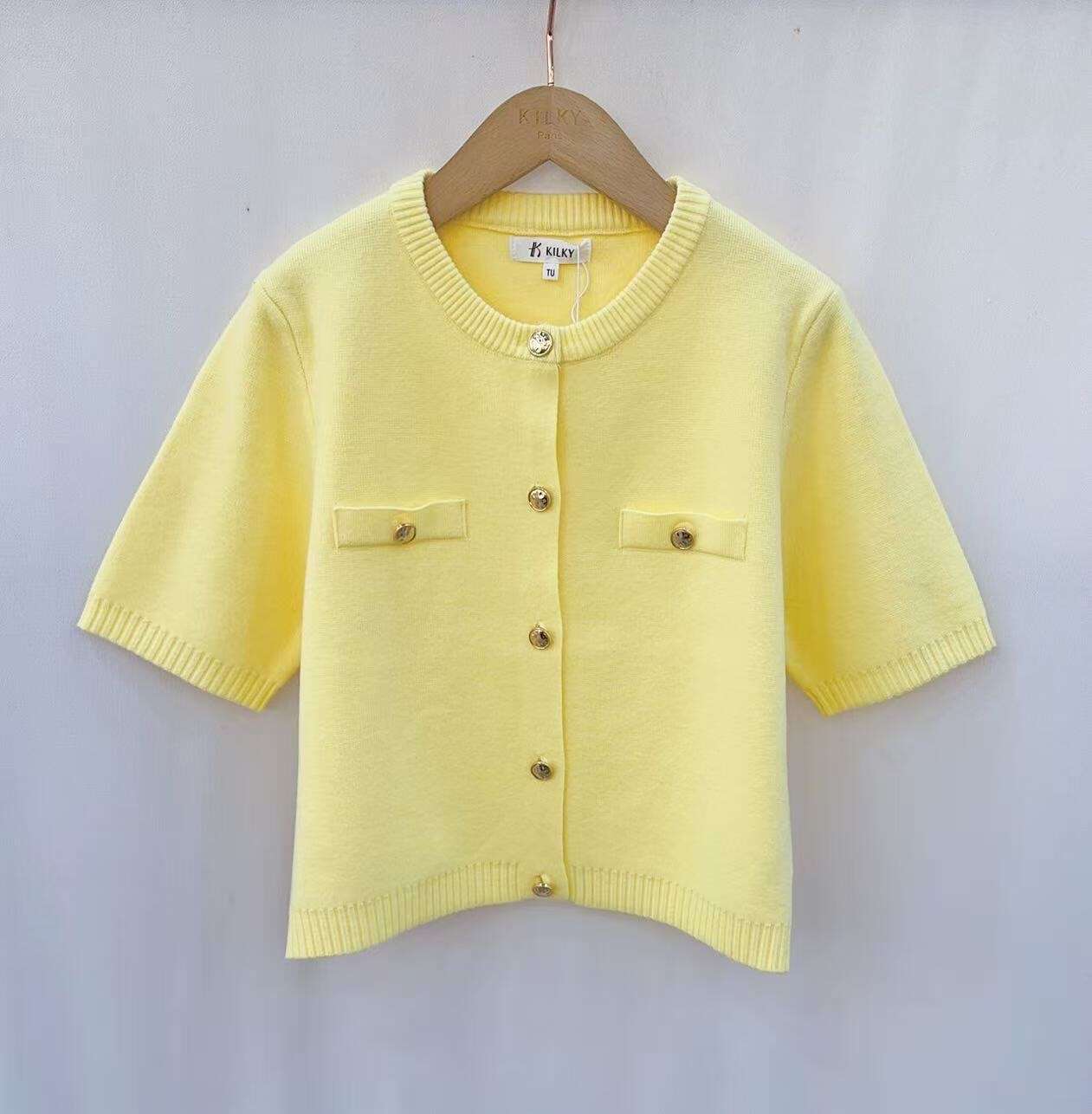 Krótki kardigan z okrągłym dekoltem, krótkim rękawem i złotymi guzikami. Miękki, wygodny i niezwykle stylowy – must have na nowy sezon!