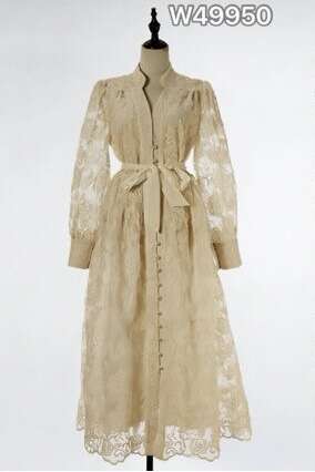 Elegancka sukienka z długim rękawem i wiązanym paskiem w talii, wykonana z delikatnej koronki.