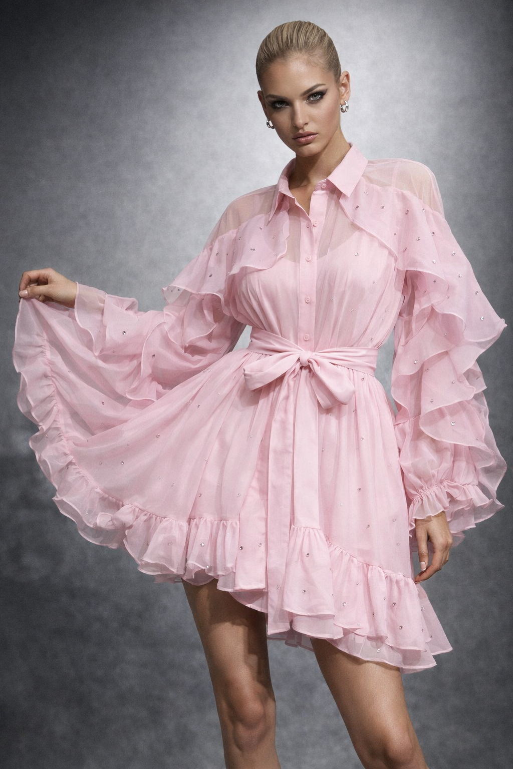 Zwiewna sukienka z falbanami i połyskującymi zdobieniami, z paskiem, idealna na wyjątkowe okazje.
