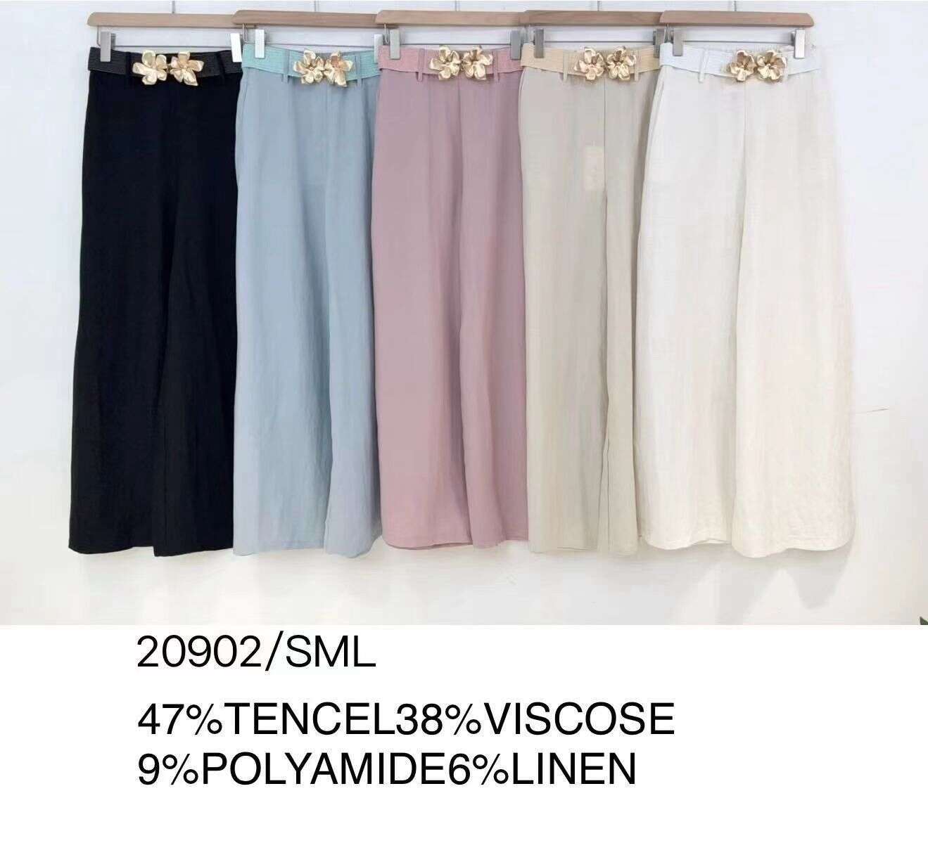 Wzbogać swoją ofertę o spodnie ARES – model, który zachwyca subtelną elegancją oraz lekkością. Szerokie nogawki sprawiają, że spodnie świetnie się układają i zapewniają maksymalny komfort noszenia nawet w ciepłe dni. Materiał to wysokiej jakości mieszanka: 47% tencel, 38% wiskoza, 9% poliamid i 6% len – dzięki temu są przewiewne, trwałe i przyjemne w dotyku. Stylowy detal w postaci ozdobnego paska podkreśla ich kobiecy charakter. Idealne do biura, na spotkania lub codzienne wyjścia. Dostępne w modnych kolorach: ecru, błękitny i beż, w rozmiarach S, M, L. To bestseller, który zainteresuje każdą klientkę szukającą modnych i wygodnych rozwiązań na nowy sezon.