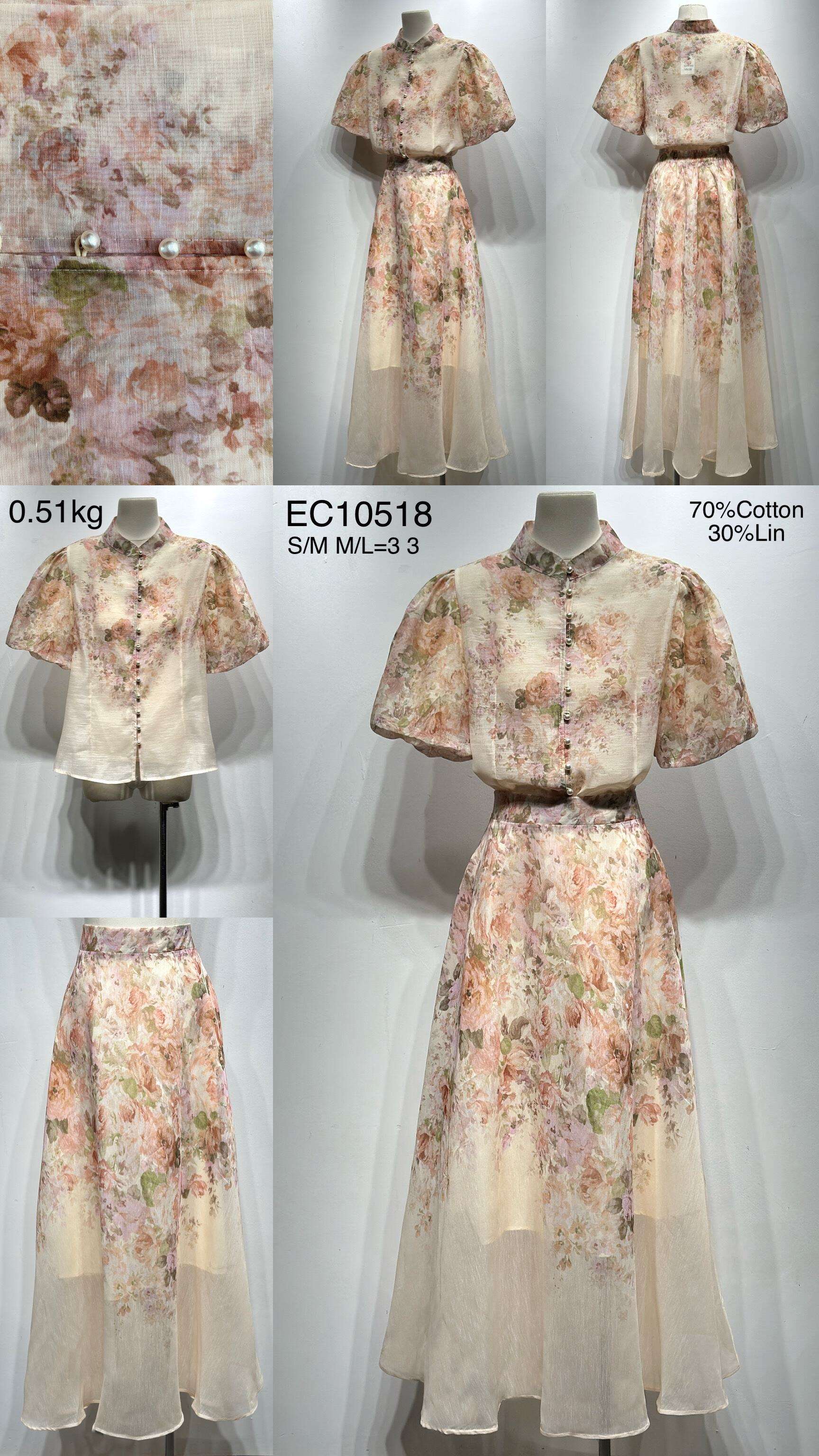 Komplet BLOSSOM to idealne połączenie subtelnej elegancji i komfortu na najwyższym poziomie. Dostępny w modnym, beżowym kolorze z kwiatowym printem, zachwyca lekkością oraz naturalnym składem: 70% bawełny i 30% lnu. Bluzka z krótkimi, szerokimi rękawami i perłowymi guzikami pięknie komponuje się z połyskującą, zwiewną spódnicą do połowy łydki. To wyjątkowa propozycja dla kobiet ceniących unikalny styl, wygodę i jakość materiału. Komplet doskonale sprawdzi się zarówno na wesele, komunię, jak i w codziennych stylizacjach butikowych. Dostępny w rozmiarach S/M oraz M/L – doskonały wybór do Twojej hurtowni!