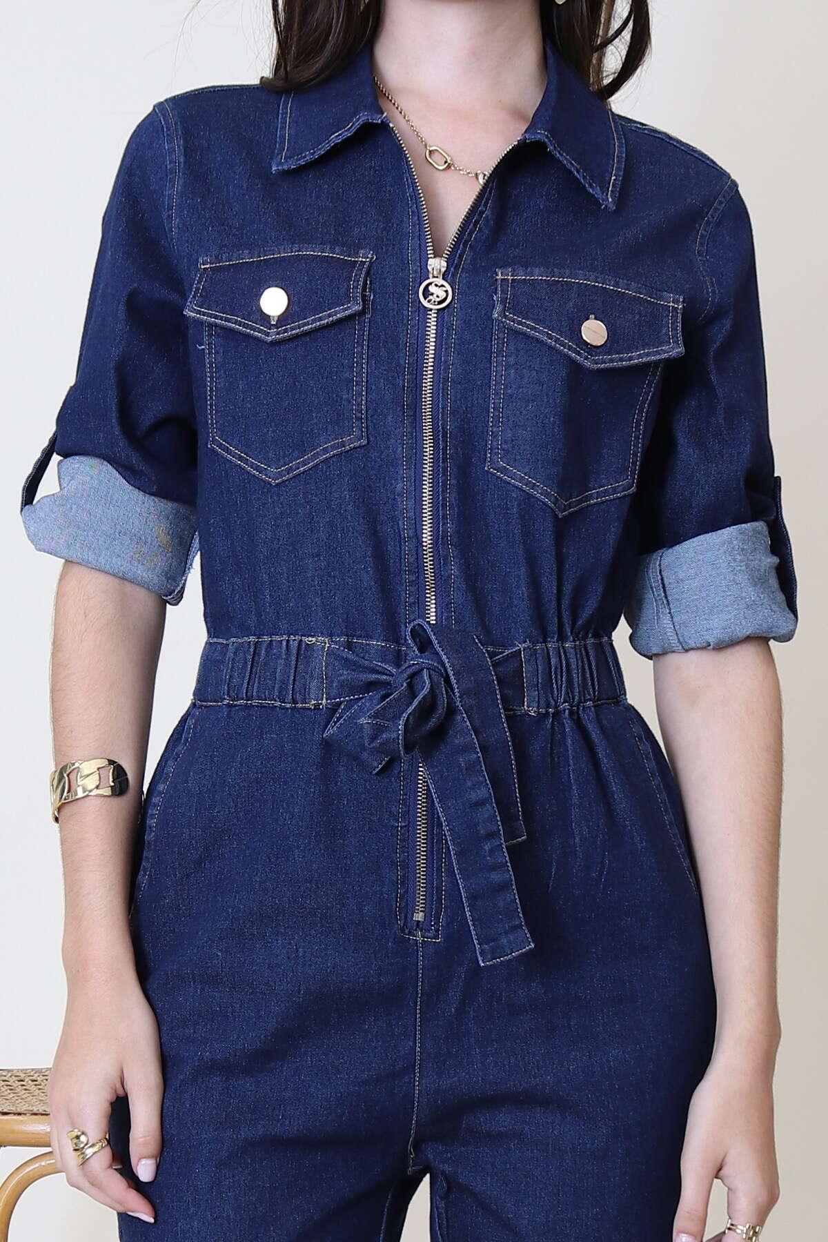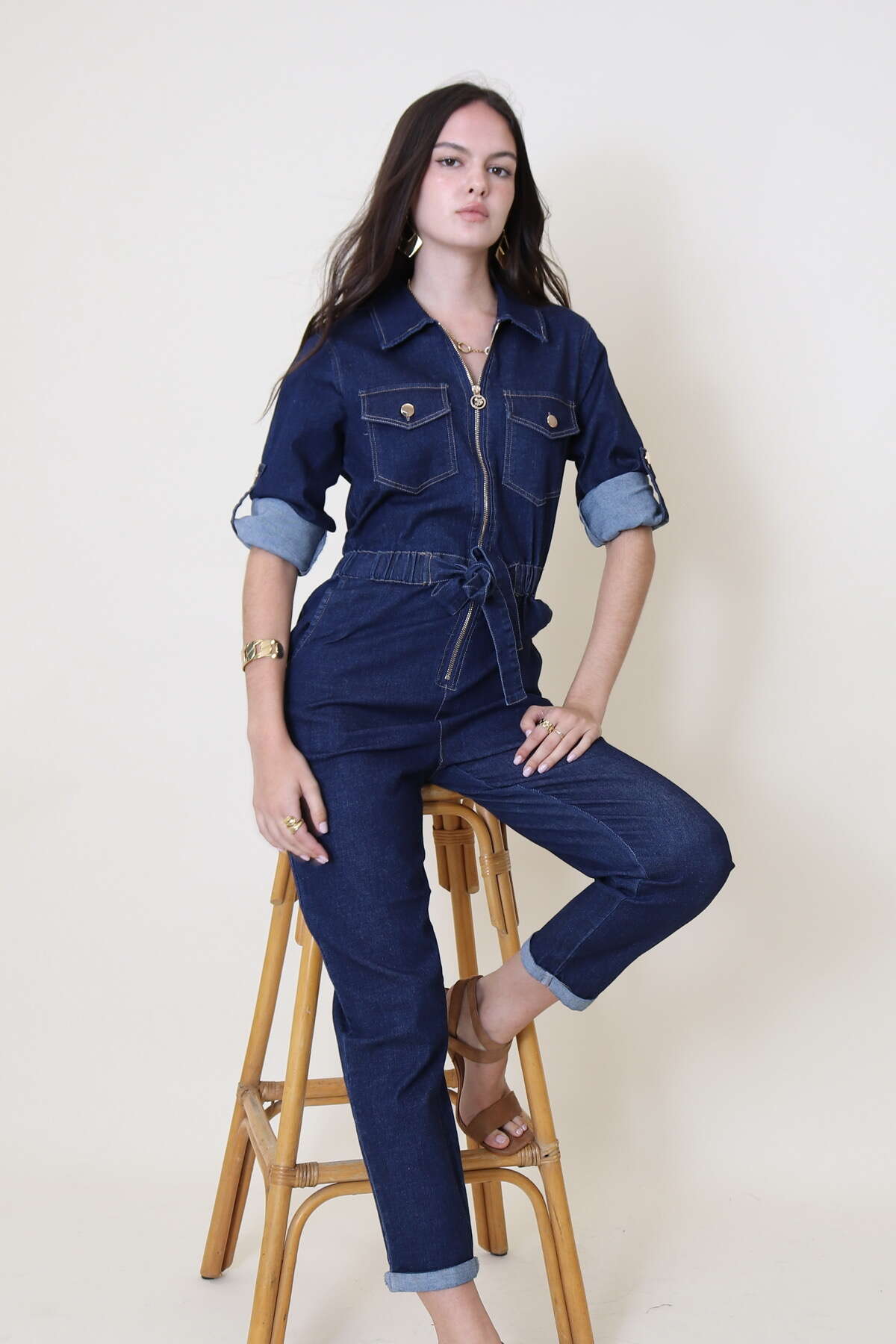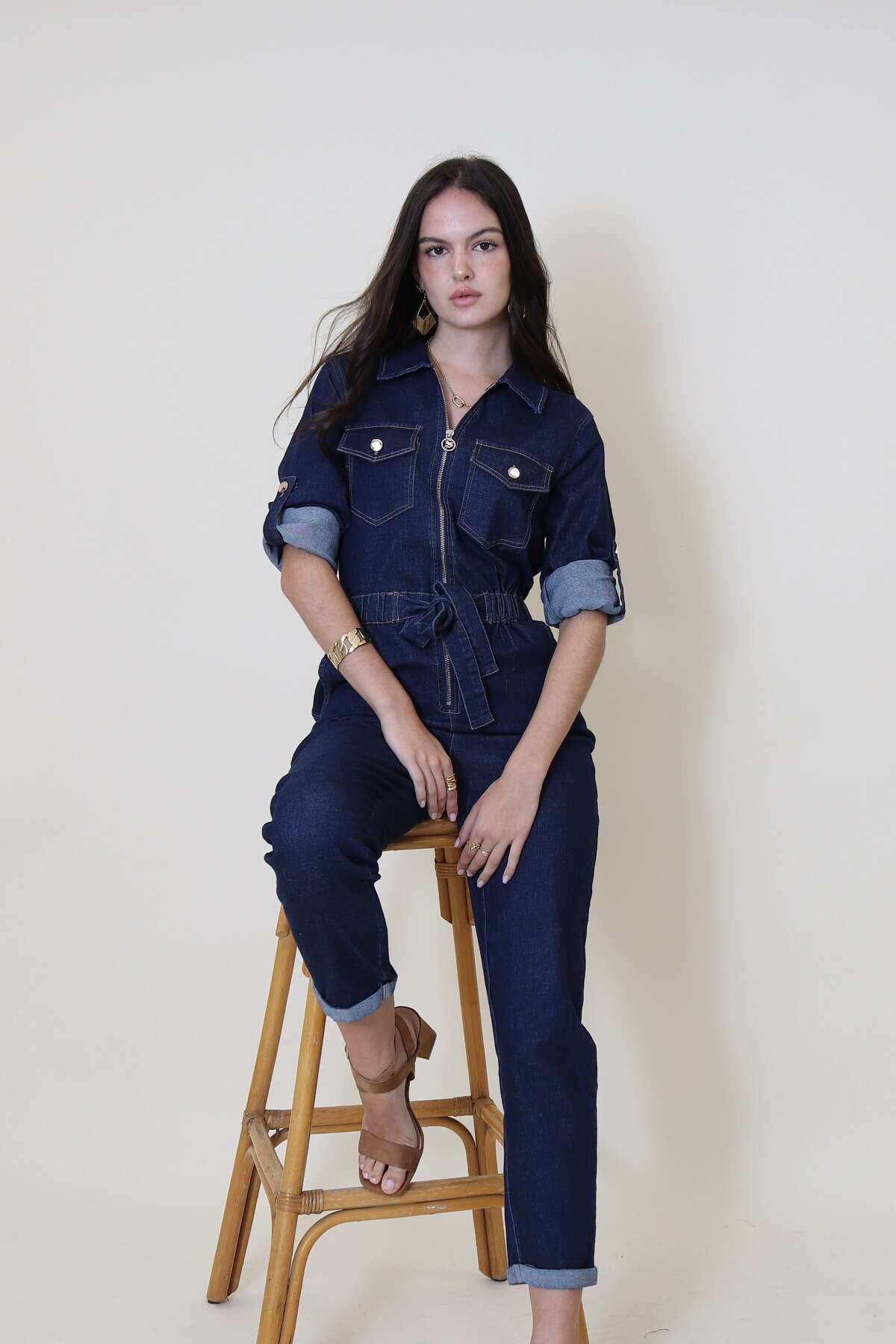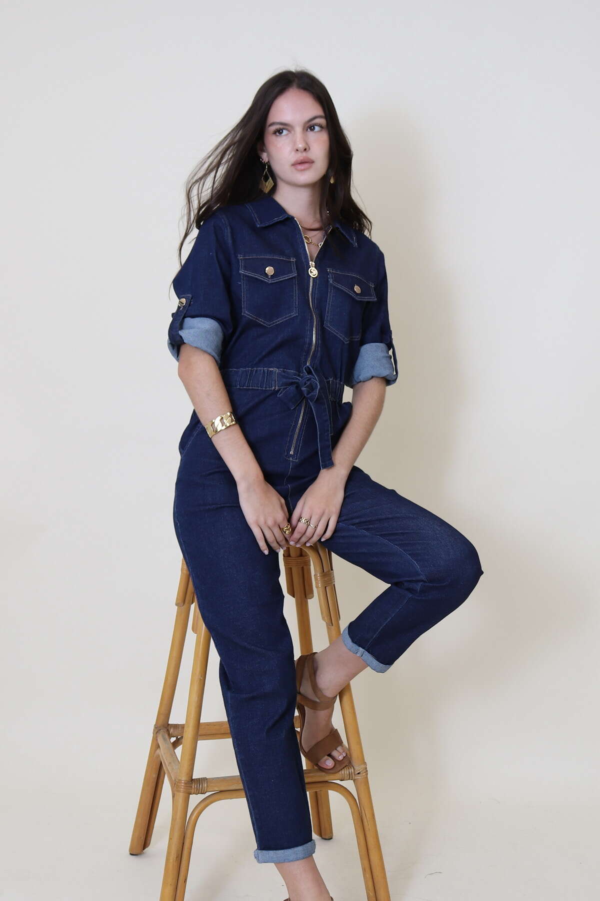 Jeansowy kombinezon z długimi nogawkami i praktycznymi kieszeniami, elastyczna talia gwarantuje komfort i świetne dopasowanie.