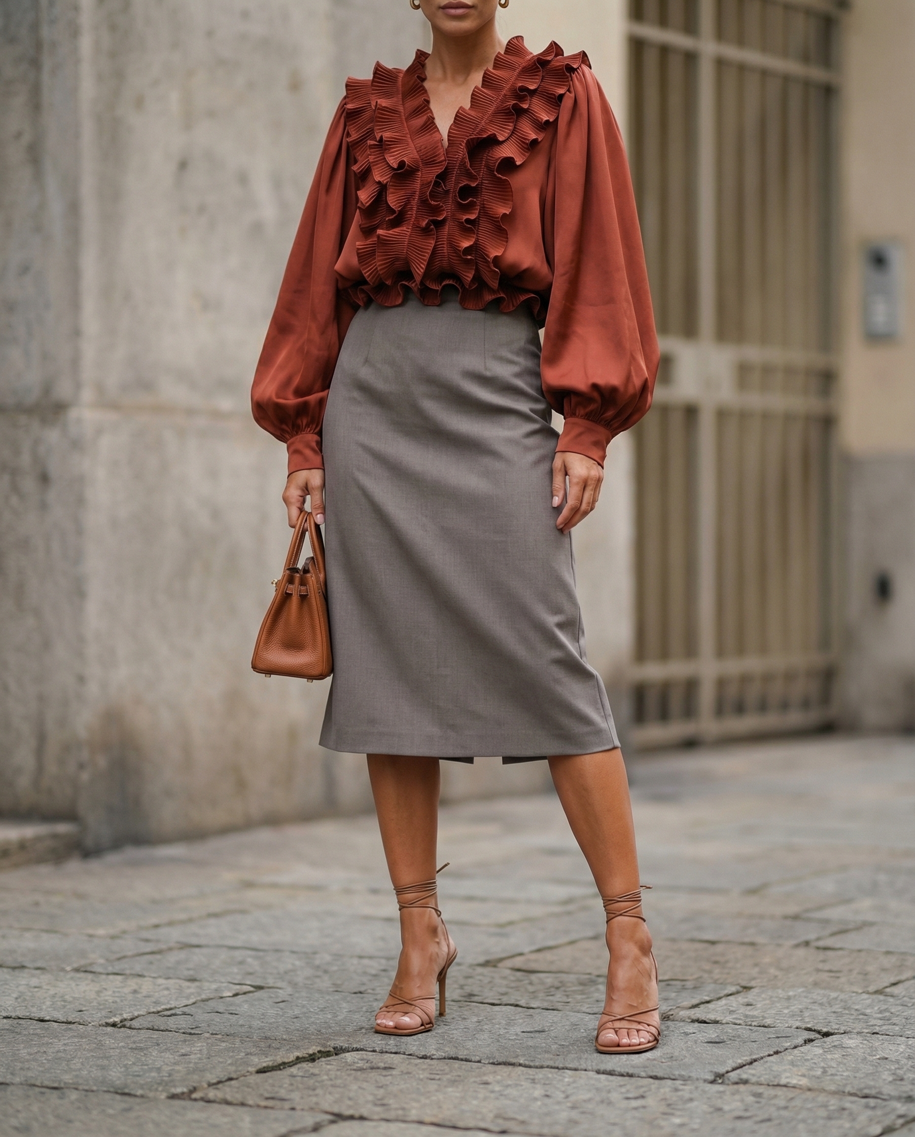 Elegancka bluzka z efektownymi falbanami, wykonana z lekkiego, przyjemnego w dotyku materiału. Dopasowany fason i bufiaste rękawy zapewniają wyjątkowy styl i komfort.