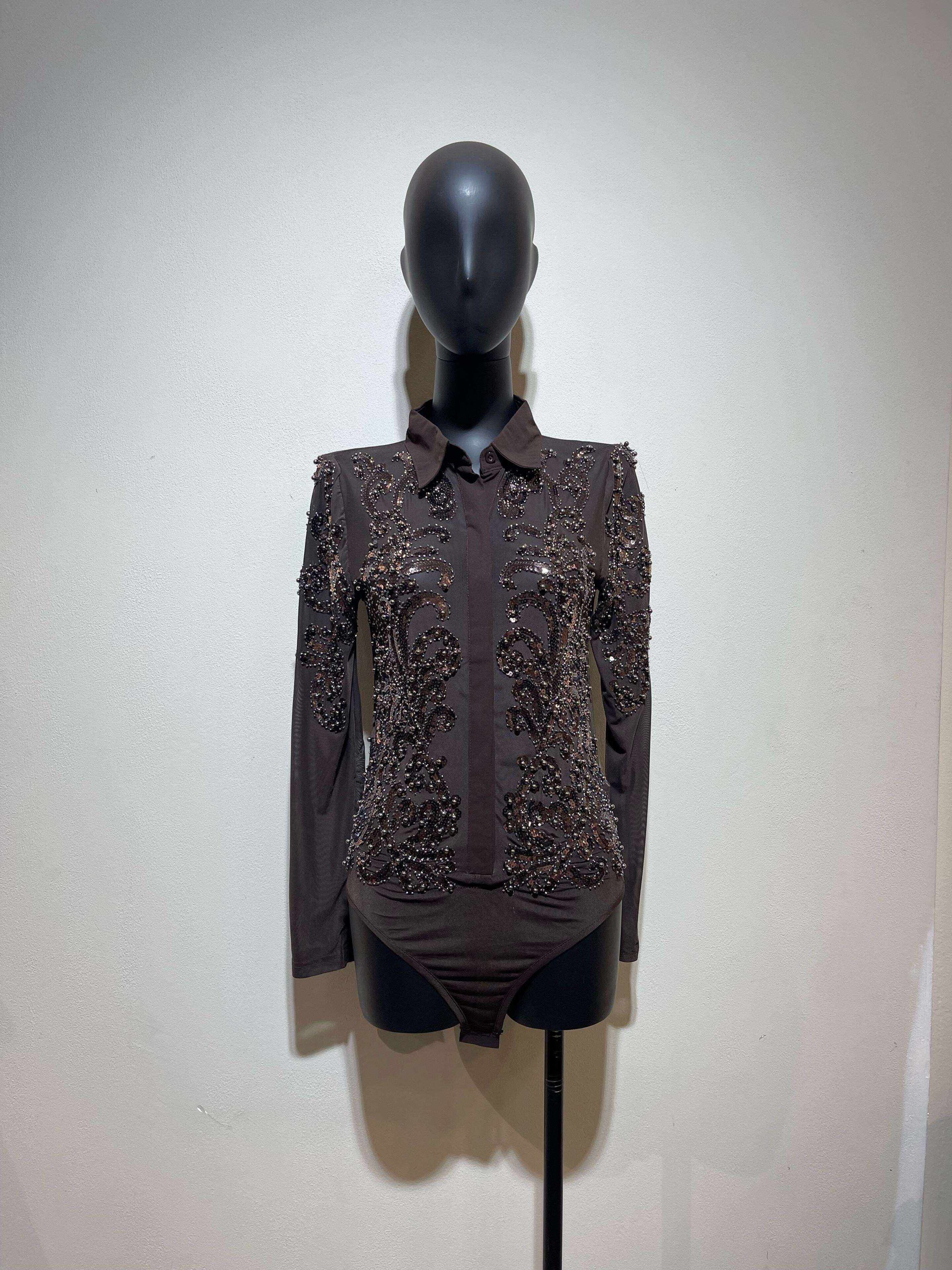 Eleganckie body z czarnej siateczki, zdobione połyskującymi cekinami i koralikami. Idealny krój podkreślający sylwetkę, świetnie sprawdzi się w stylizacjach wieczorowych.