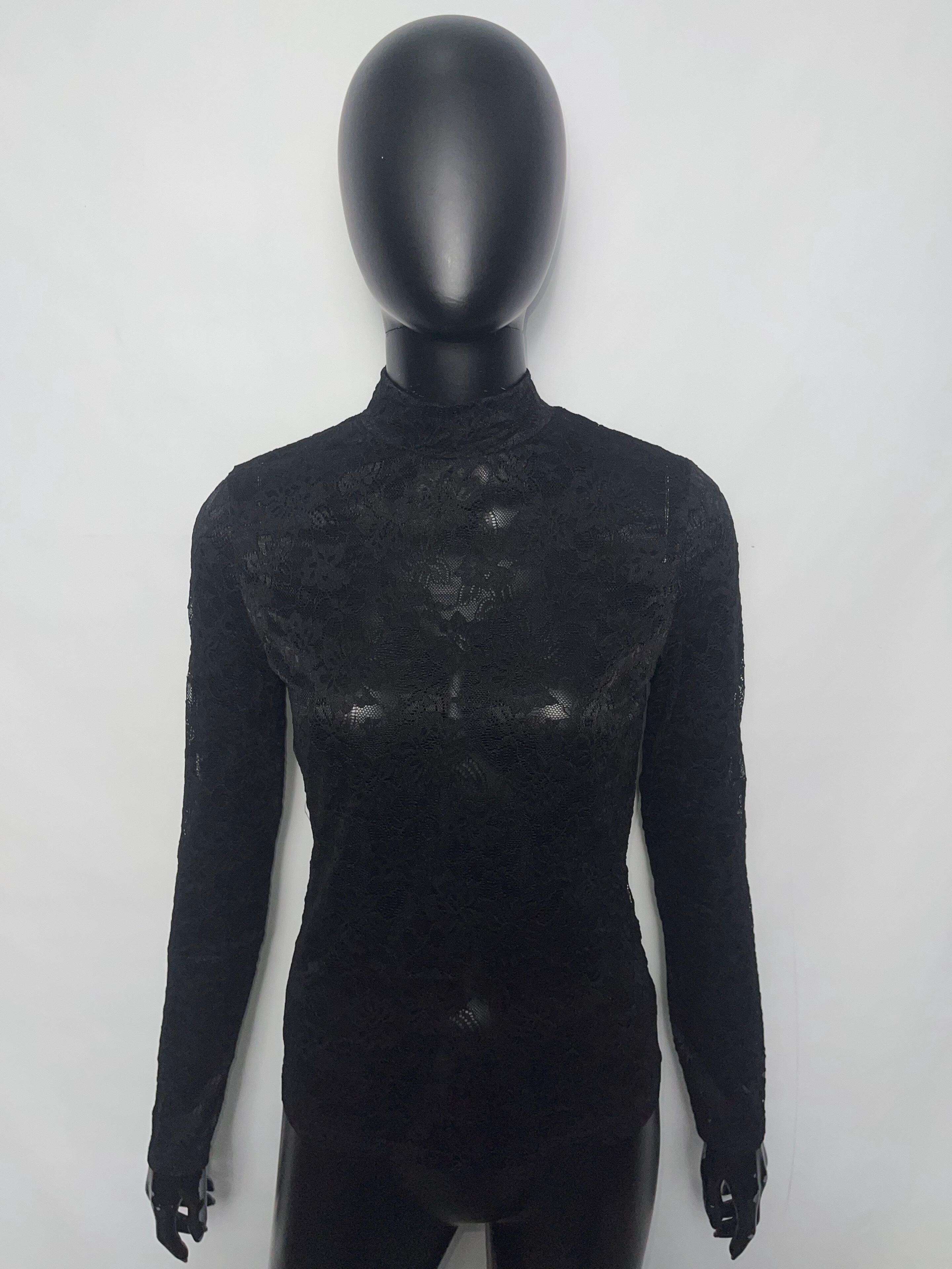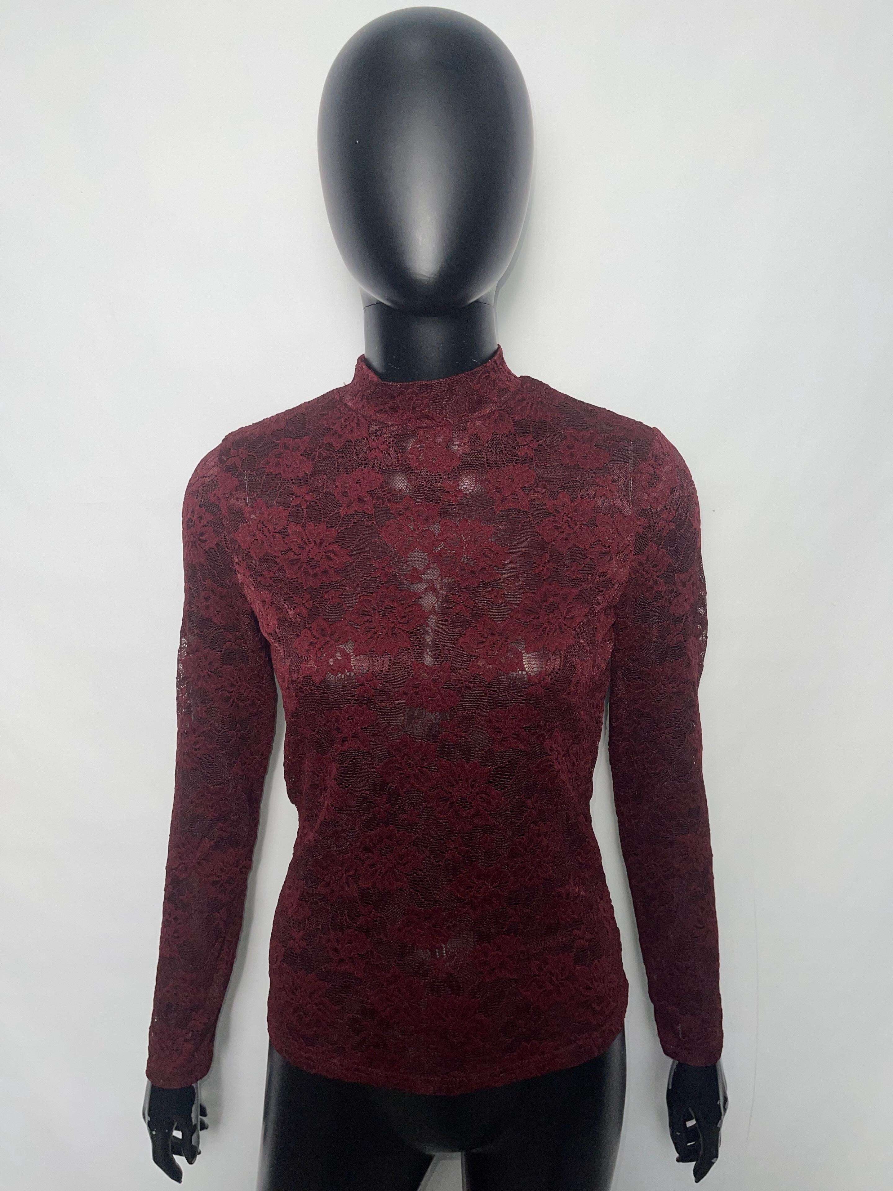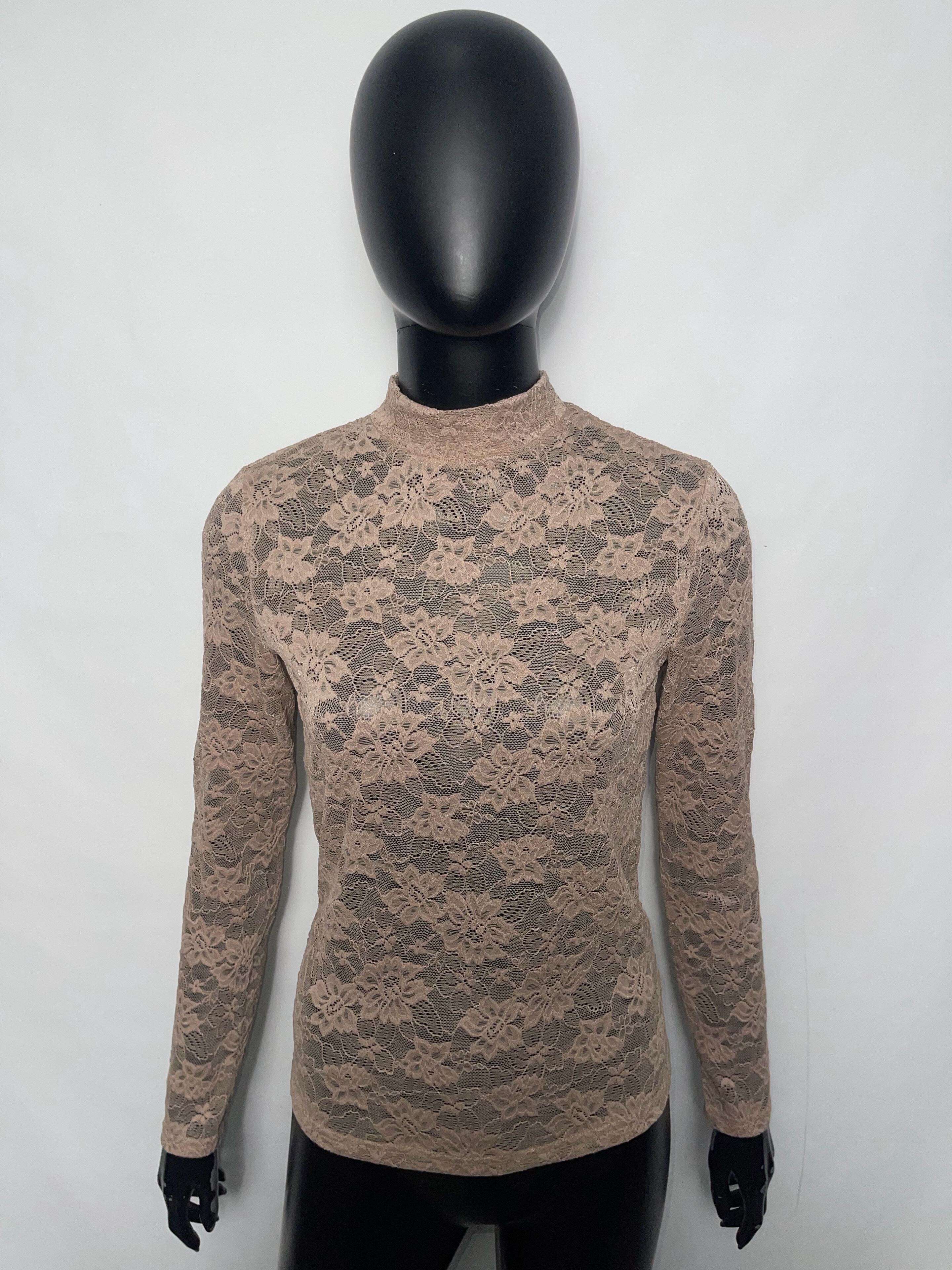 Koronkowa bluzka z długim rękawem i stójką, idealna na eleganckie stylizacje i wyjątkowe okazje.