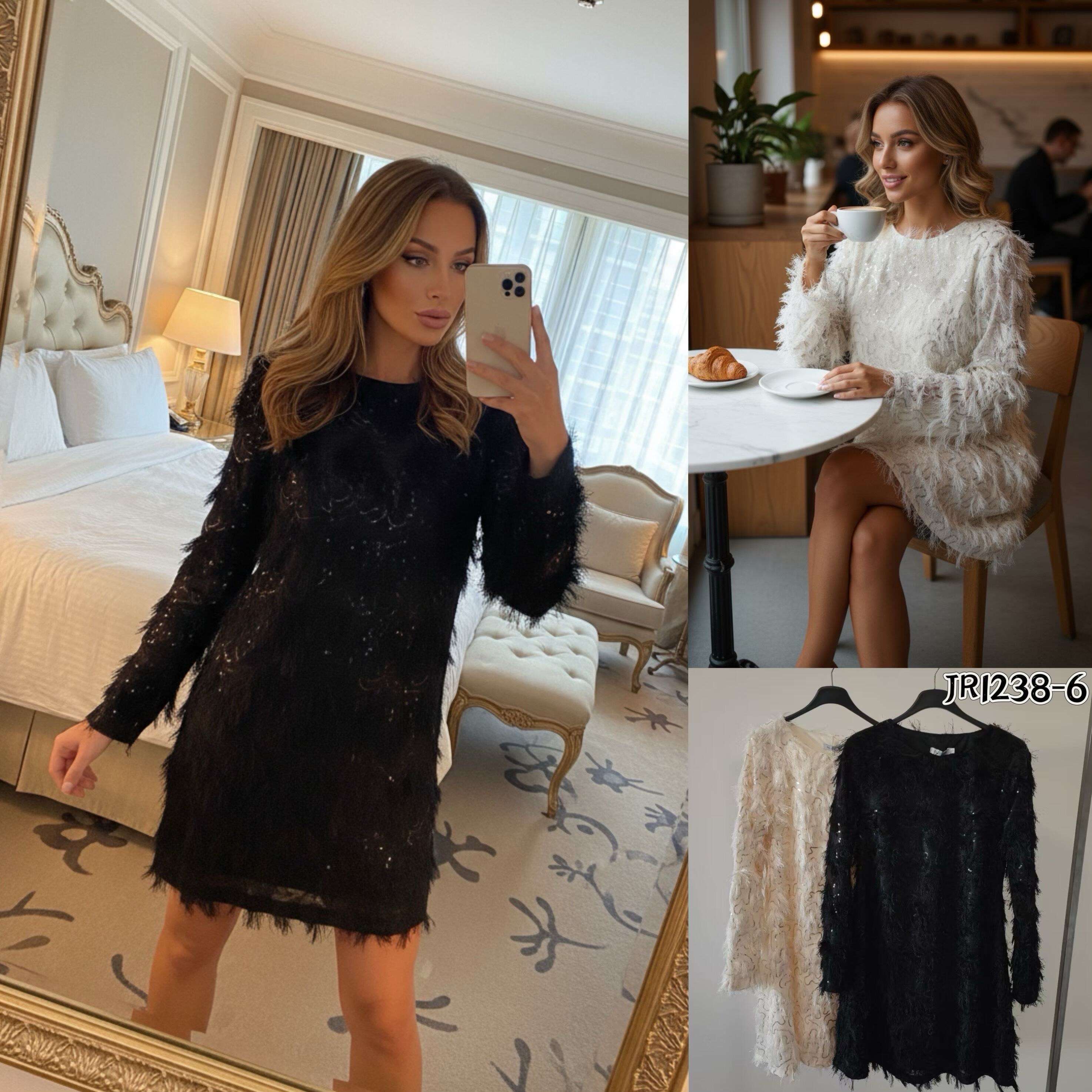 Sukienka GLAMMO to idealna propozycja dla klientek, które poszukują modnych i efektownych kreacji na wyjątkowe okazje. Model dostępny jest w dwóch topowych kolorach – klasyczna czerń oraz uniwersalny beż, dzięki czemu wpasuje się w różnorodne potrzeby hurtowe. Sukienka uszyta jest z wysokiej jakości materiału, który łączy wygodę noszenia z eleganckim wyglądem. Luźny krój mini zapewnia swobodę ruchów, a dekoracyjne piórka i połyskujące detale przyciągają wzrok i nadają niepowtarzalnego charakteru każdej stylizacji. Doskonale sprawdzi się zarówno na wieczorne wyjścia, eventy, jak i uroczystości rodzinne. Bogaty wybór rozmiarów umożliwia dopasowanie do różnych sylwetek, co czyni ten model bestsellerem w ofercie każdej hurtowni.