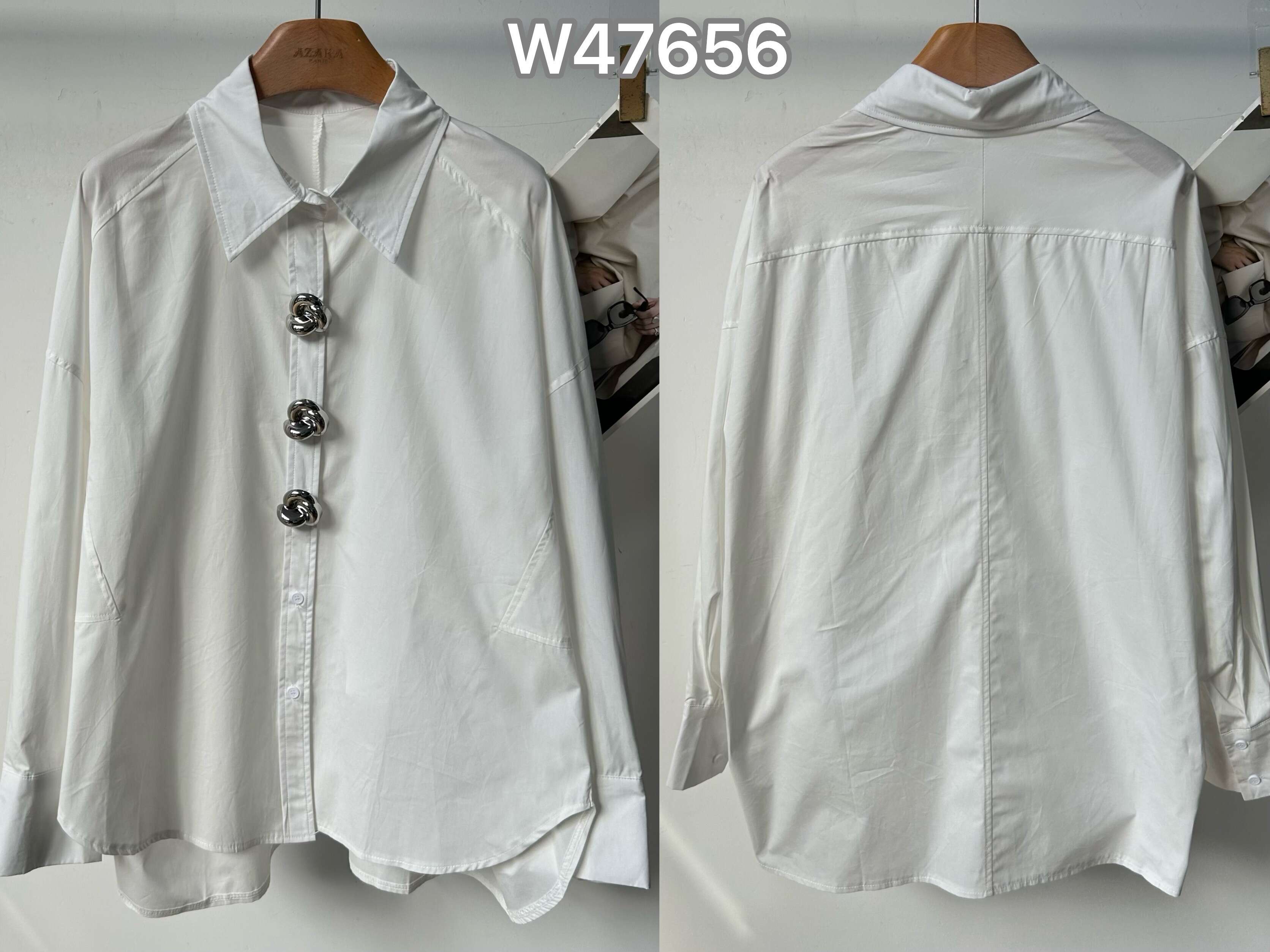 Klasyczna biała koszula z wyrazistymi, metalicznymi guzikami – ponadczasowy fason i modny detal.