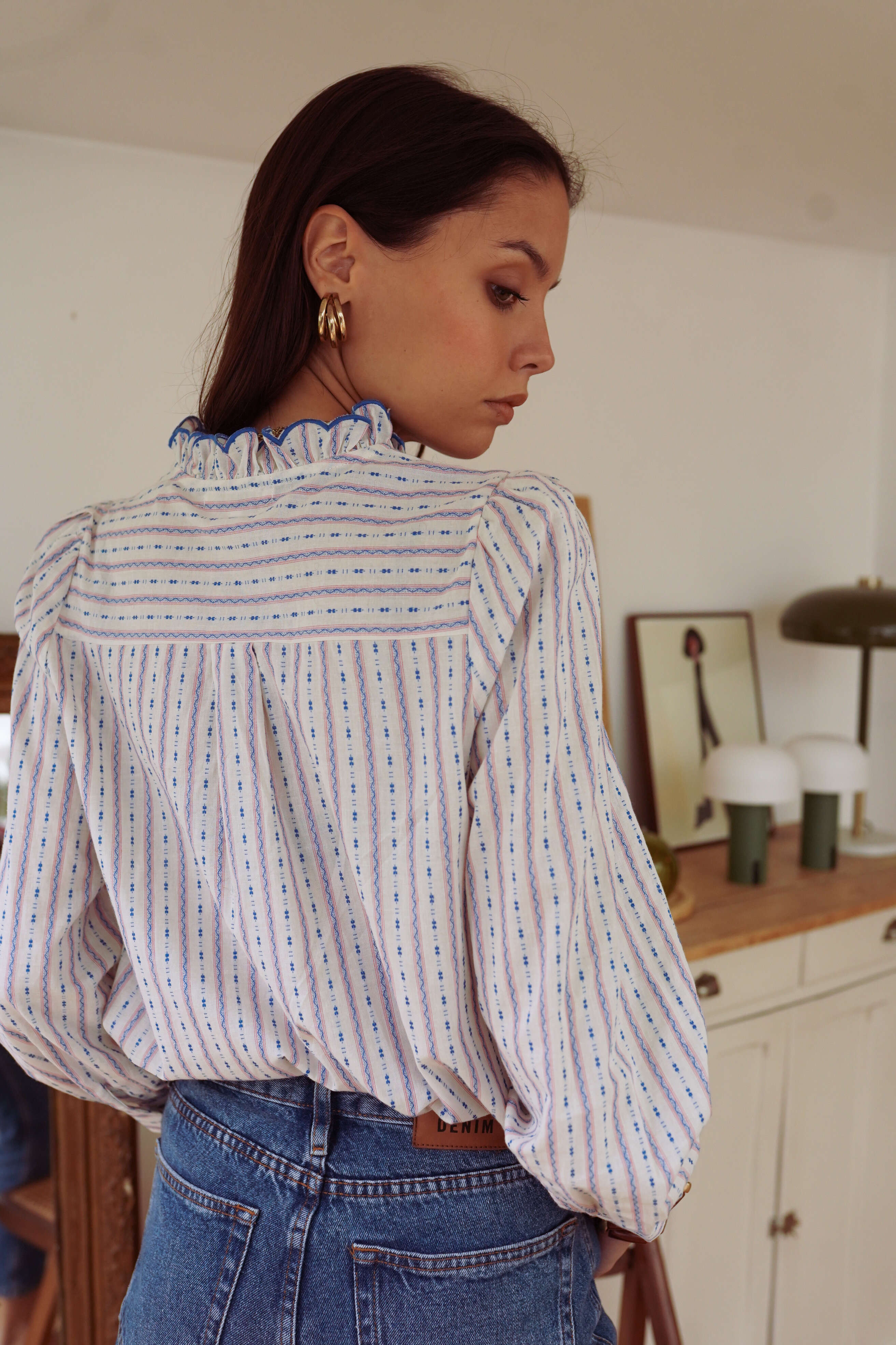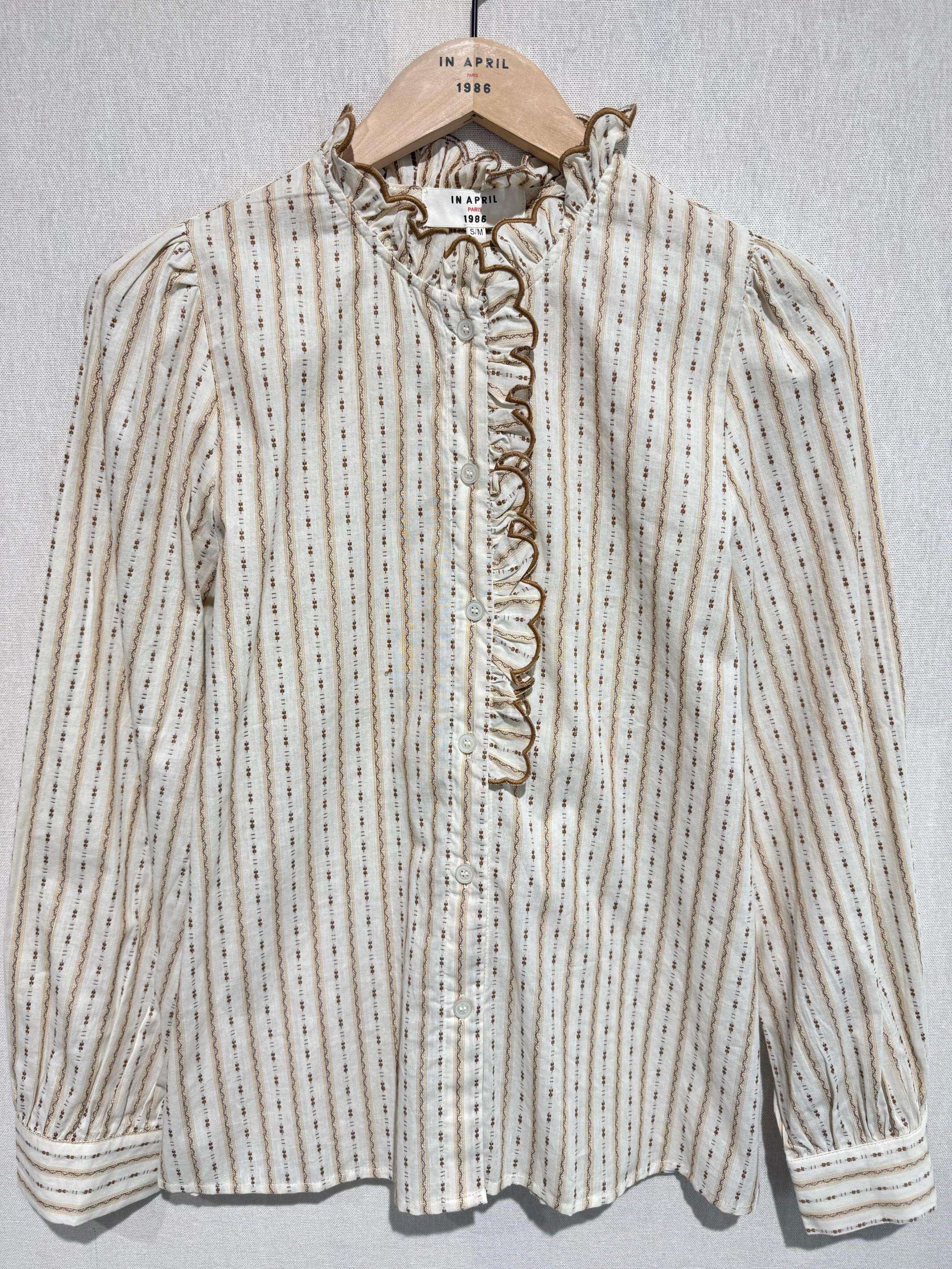 Subtelne falbanki, lekki materiał i wyjątkowy wzór sprawiają, że ta koszula doskonale łączy elegancję z wygodą na co dzień.