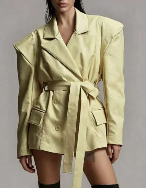 Modna, oversize'owa kurtka z paskiem, podkreślająca talię, idealna na chłodniejsze dni. Wykonana z wysokiej jakości materiału, dostępna w trzech modnych kolorach: żółtym, różowym i czarnym.