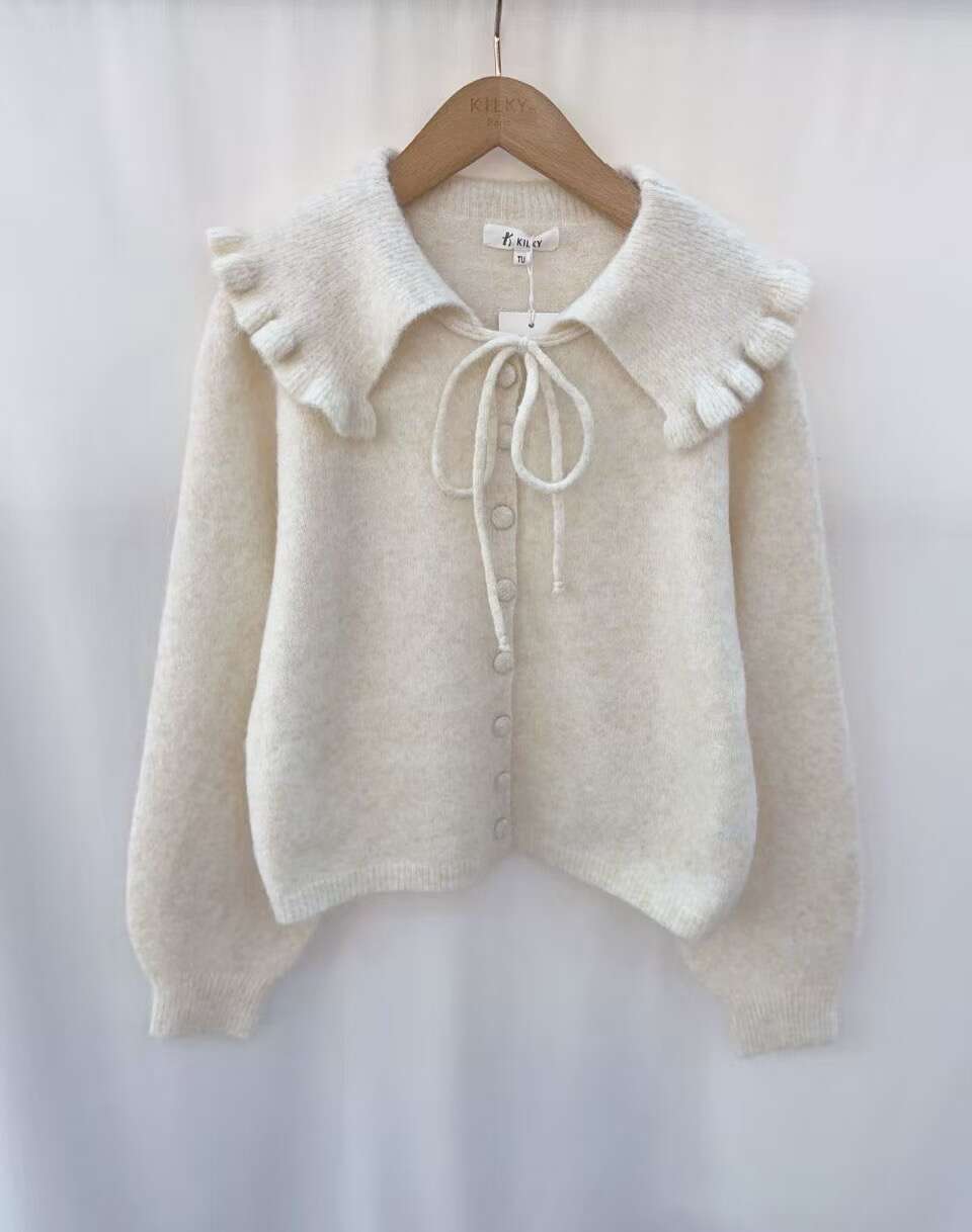 Dziewczęcy sweter z ozdobnym kołnierzem i falbanką. Miękki materiał i wygodny, lekko oversize’owy krój podkreślają codzienny styl.