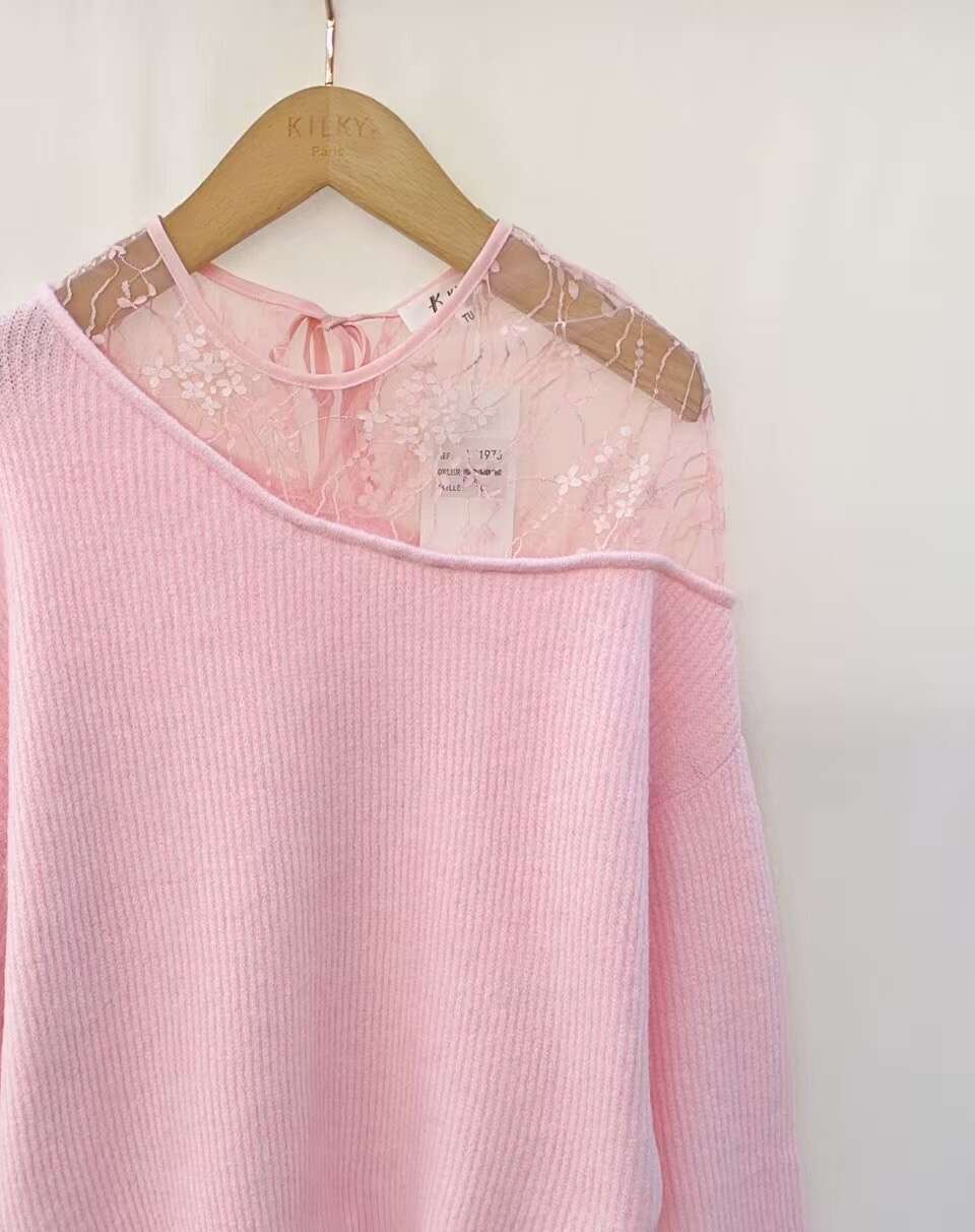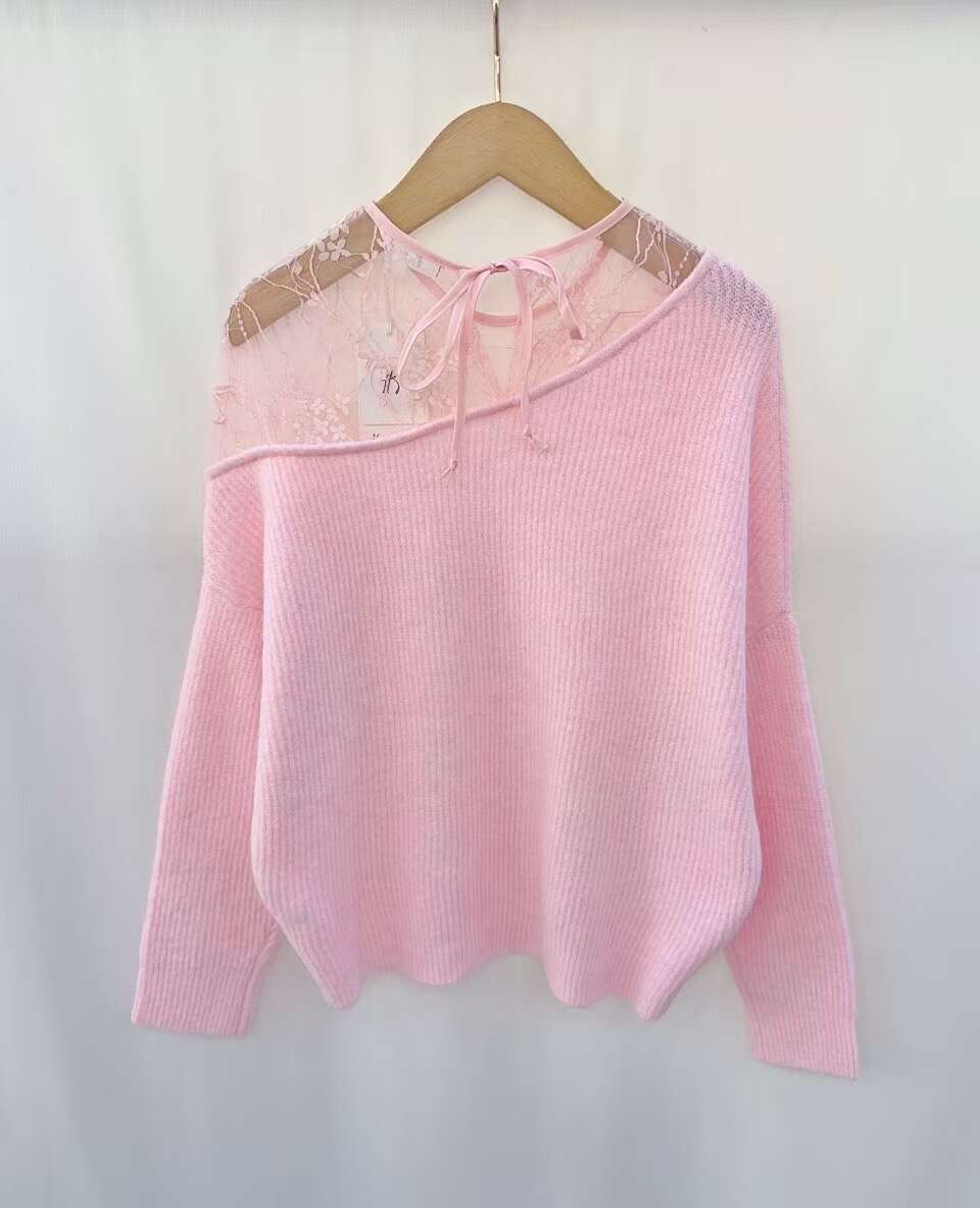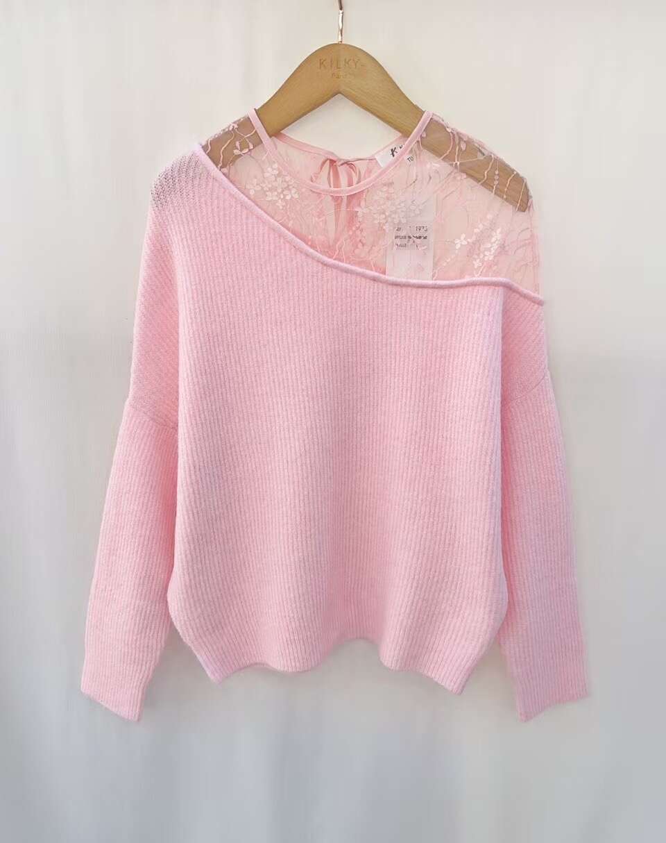 Sweter z dziewczęcą koronką przy dekolcie, delikatny i stylowy, w pastelowych kolorach, o swobodnym kroju.