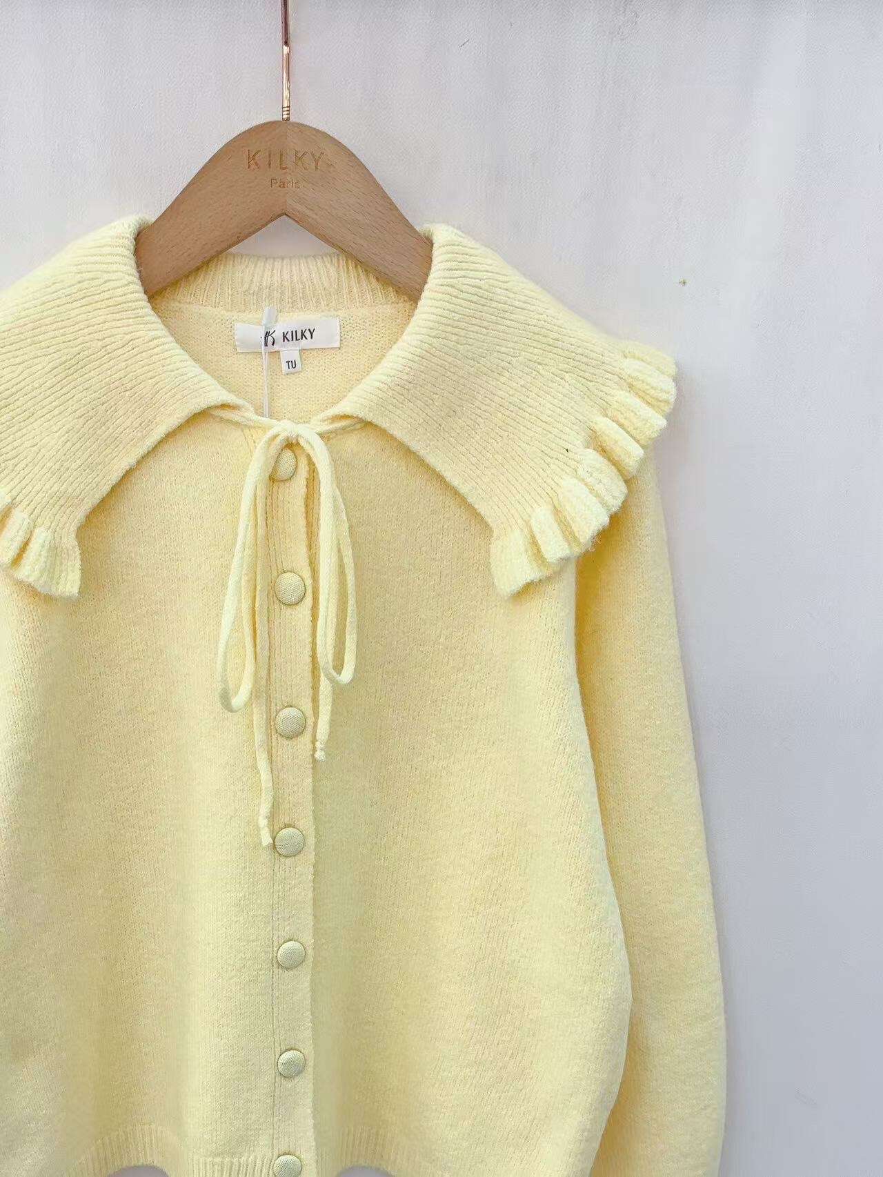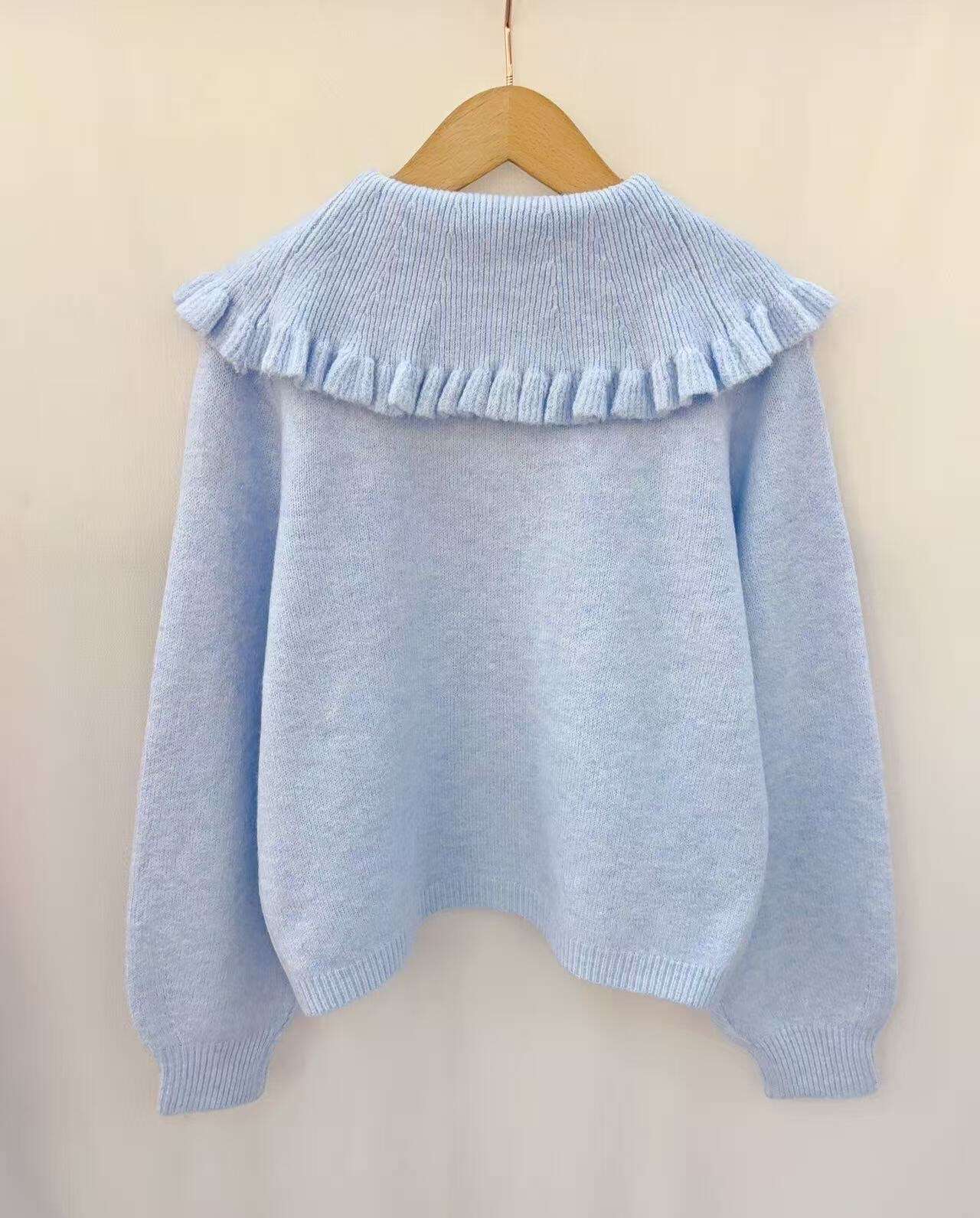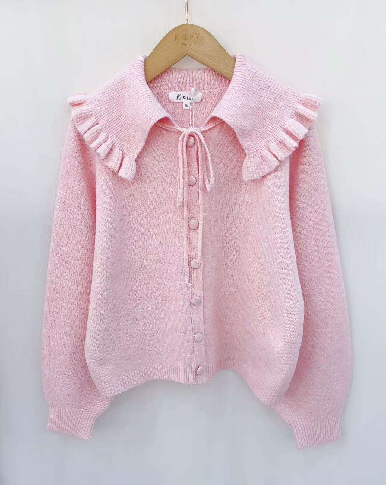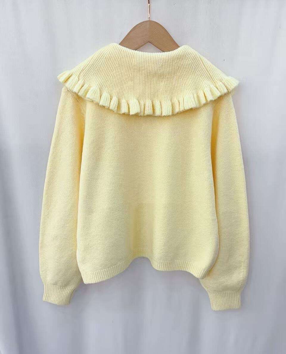 Sweter o klasycznym kroju z modnym, dużym kołnierzem i dekoracyjną falbaną. Zapinany na guziki, wykonany z miękkiego, przyjemnego materiału.