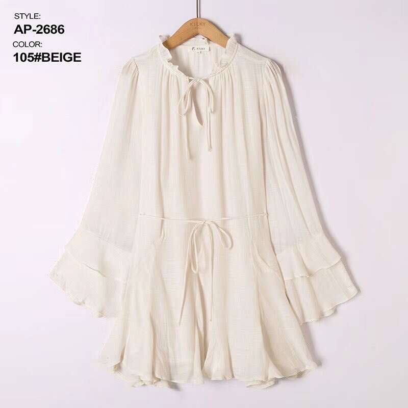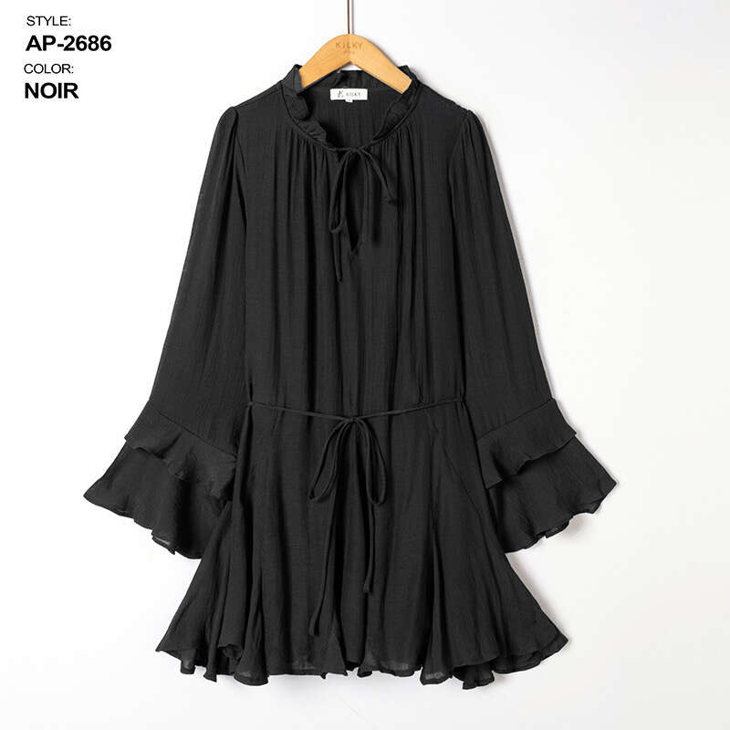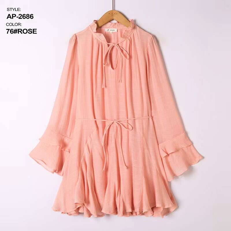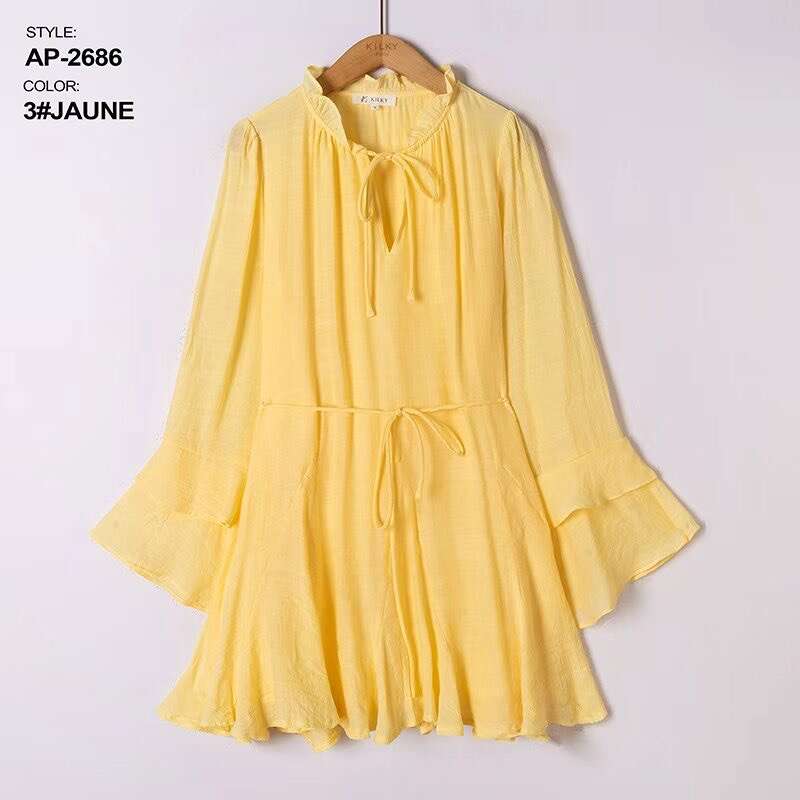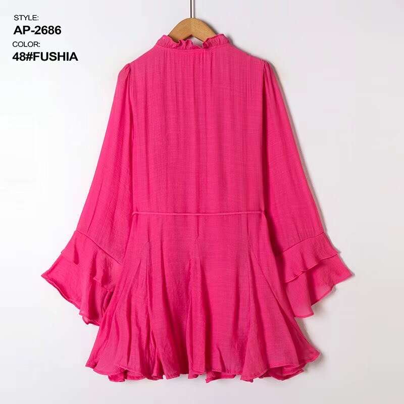 Sukienka dostępna w aż ośmiu modnych kolorach: żółtym, zielonym, różowym, beżowym, czarnym, fuksji, koralowym oraz pomarańczowym, pozwala na szeroki wybór dla różnych gustów klientek. Model zachwyca lekkością i swobodnym krojem, który pięknie podkreśla sylwetkę, a elastyczny pasek w talii dodatkowo ją modeluje. Wysokiej jakości, przewiewny materiał gwarantuje komfort noszenia przez cały dzień, a falbaniaste rękawy oraz stójka z wiązaniem dodają całości kobiecego uroku. Sukienka doskonale sprawdzi się zarówno na co dzień, do pracy, jak i na specjalne okazje. W asortymencie dostępne są różne rozmiary – idealne do sprzedaży hurtowej dla sklepów z modą damską.