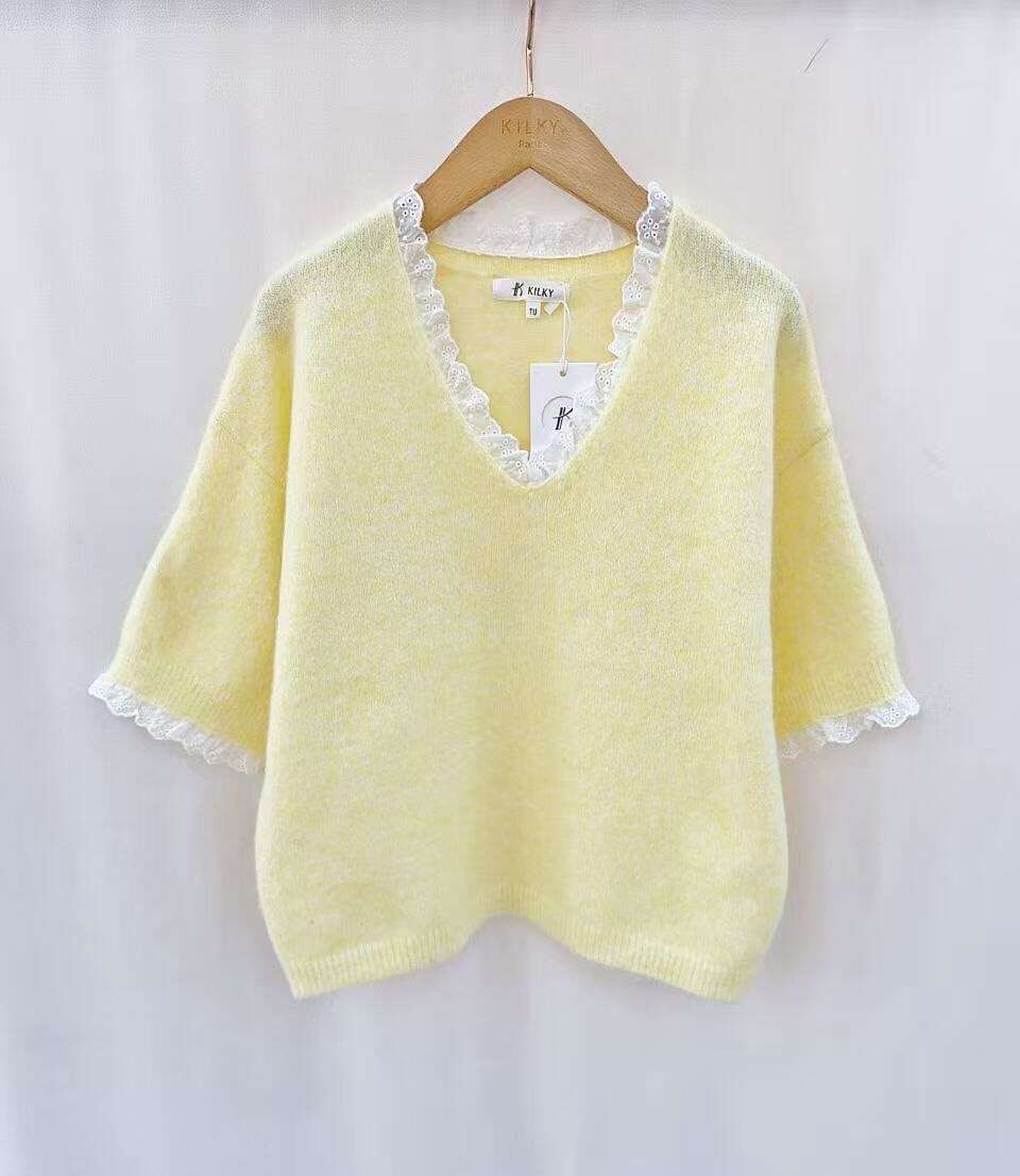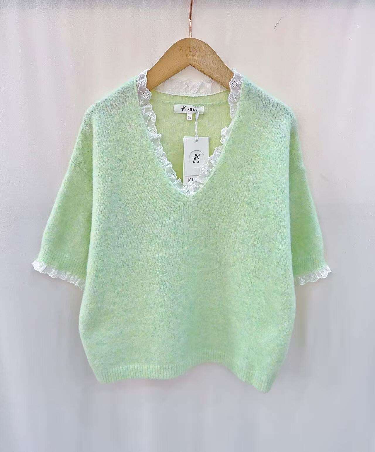 Sweter o luźnym kroju z delikatnej dzianiny, ozdobiony koronką przy dekolcie i rękawach. Miękkość materiału gwarantuje wygodę na co dzień, a pastelowe kolory wprowadzają świeżość do garderoby.