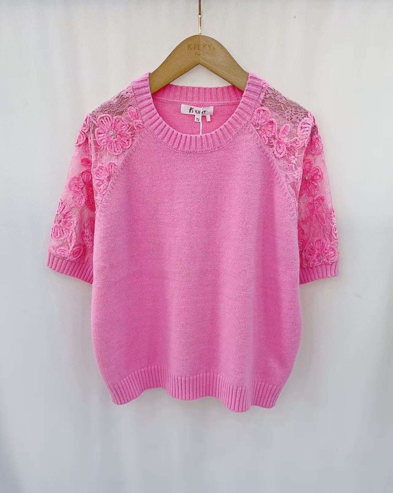 Sweter ANDROMEDA to propozycja idealna do hurtowej sprzedaży – zachwyca nie tylko jakością wykonania, ale także wyjątkowym stylem. Model wyróżnia się krótkim rękawem wykończonym kwiatową koronką, która dodaje mu lekkości i romantycznego charakteru. Dostępny w sześciu modnych kolorach: żółty, różowy, miętowy, fuksja, ecru, błękitny oraz beż – pozwala na stworzenie atrakcyjnej, różnorodnej kolekcji w Twoim sklepie. Miękki, przyjemny w dotyku materiał gwarantuje komfort noszenia przez cały dzień. Sweter doskonale sprawdza się w codziennych, miejskich stylizacjach oraz jako uzupełnienie eleganckiego looku. Świetny wybór na sezon wiosenno-letni!
