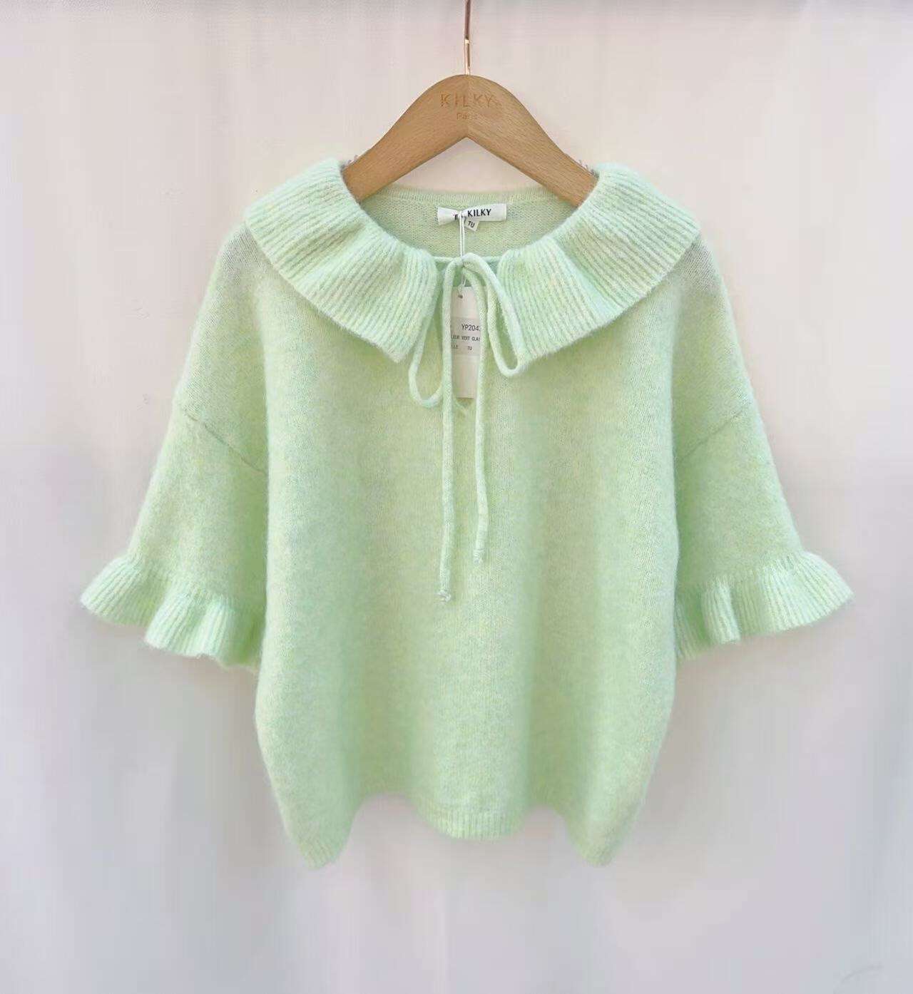Uroczy sweter z bufiastymi rękawami i szerokim, wiązanym kołnierzem. Delikatny materiał zapewnia komfort i styl na co dzień.