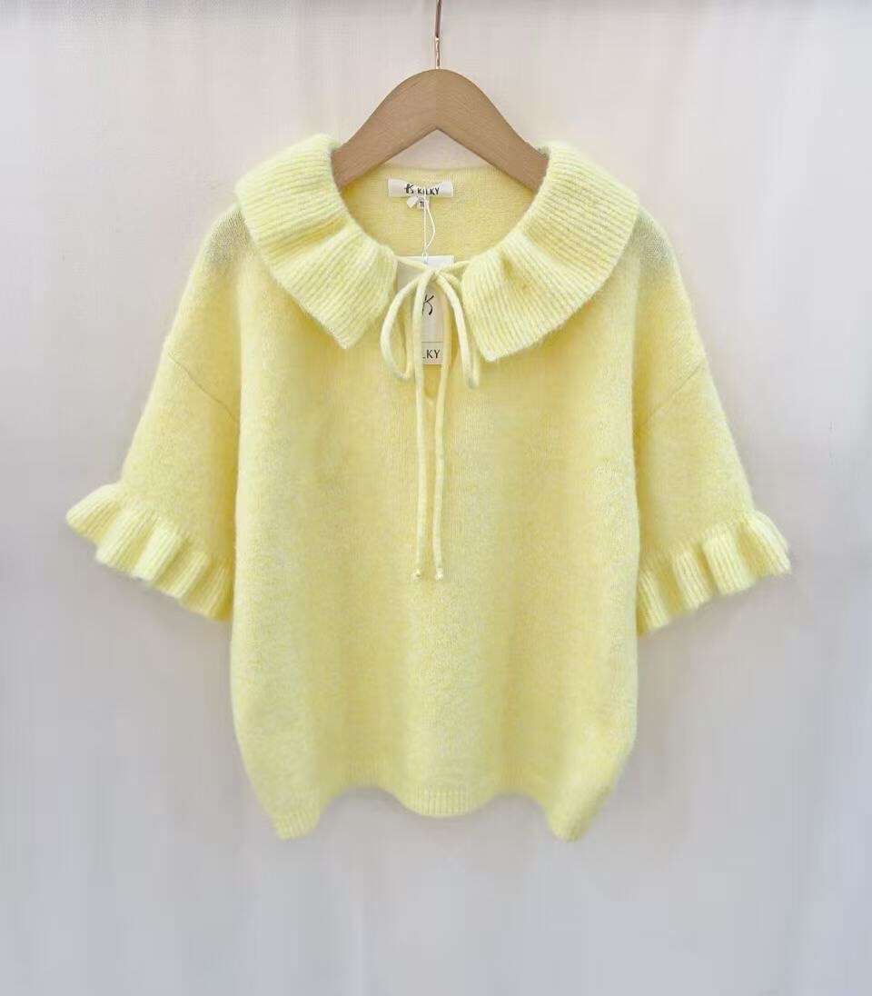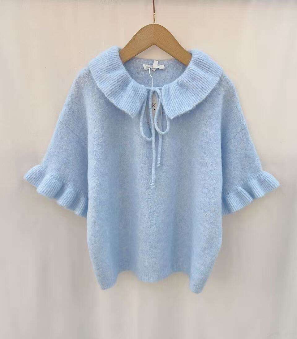 Uroczy sweter z bufiastymi rękawami i szerokim, wiązanym kołnierzem. Delikatny materiał zapewnia komfort i styl na co dzień.