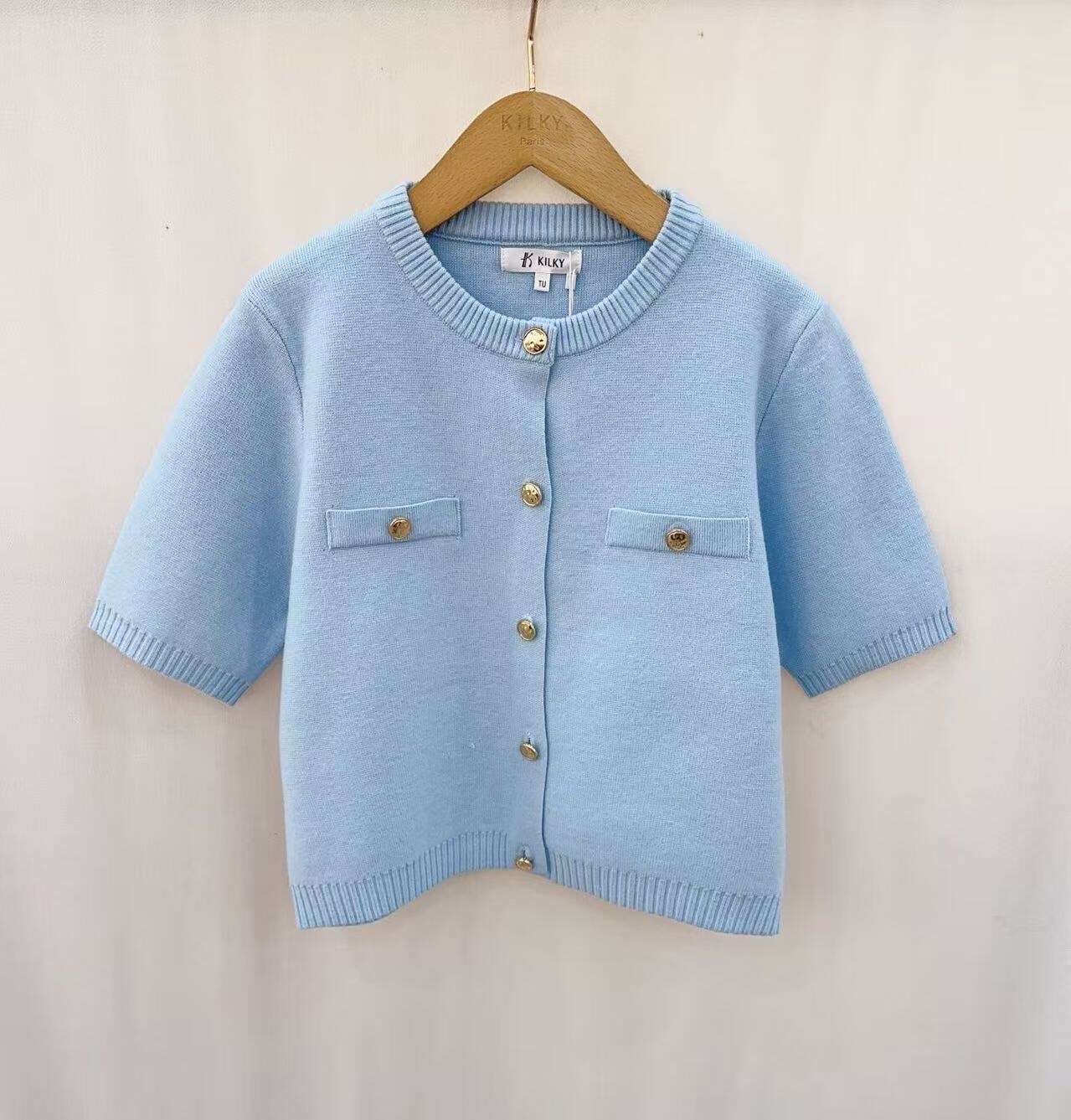 Krótki kardigan z okrągłym dekoltem, krótkim rękawem i złotymi guzikami. Miękki, wygodny i niezwykle stylowy – must have na nowy sezon!