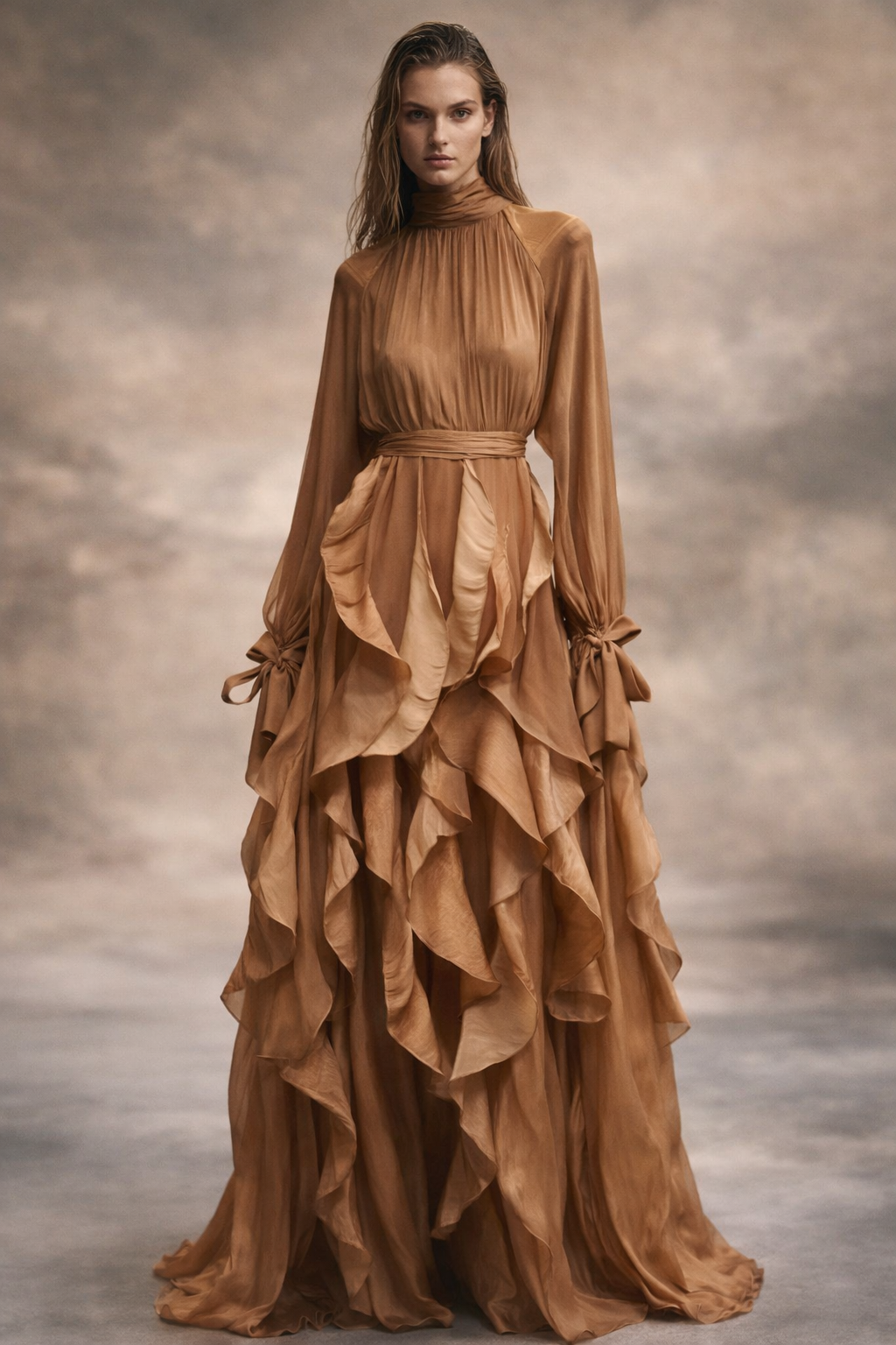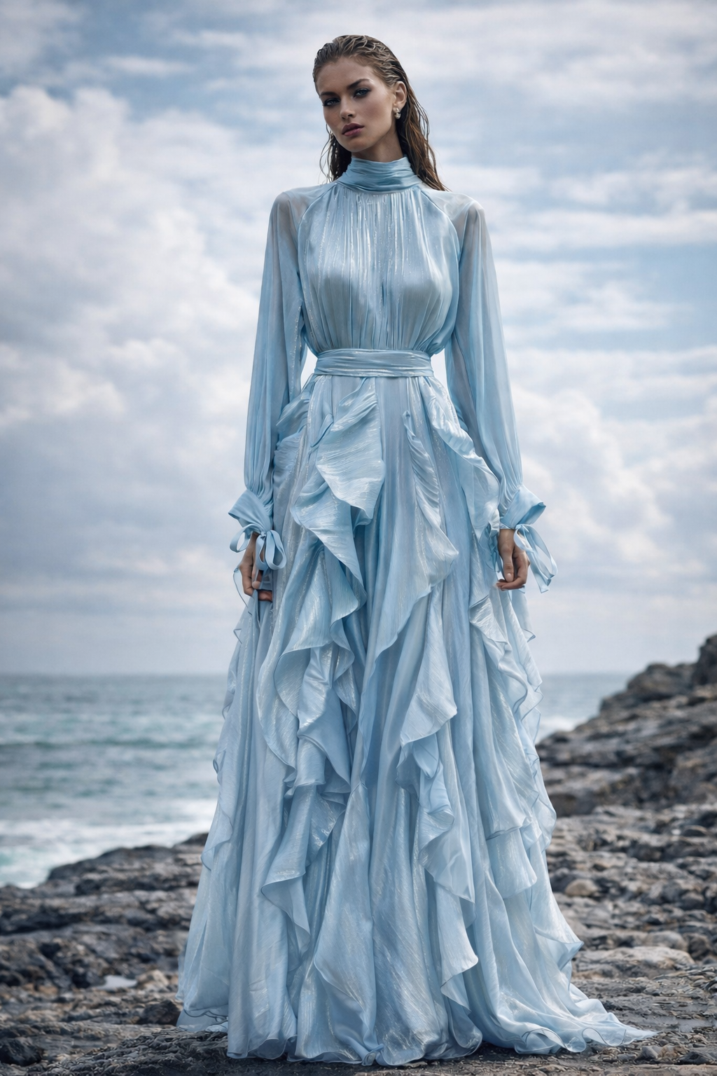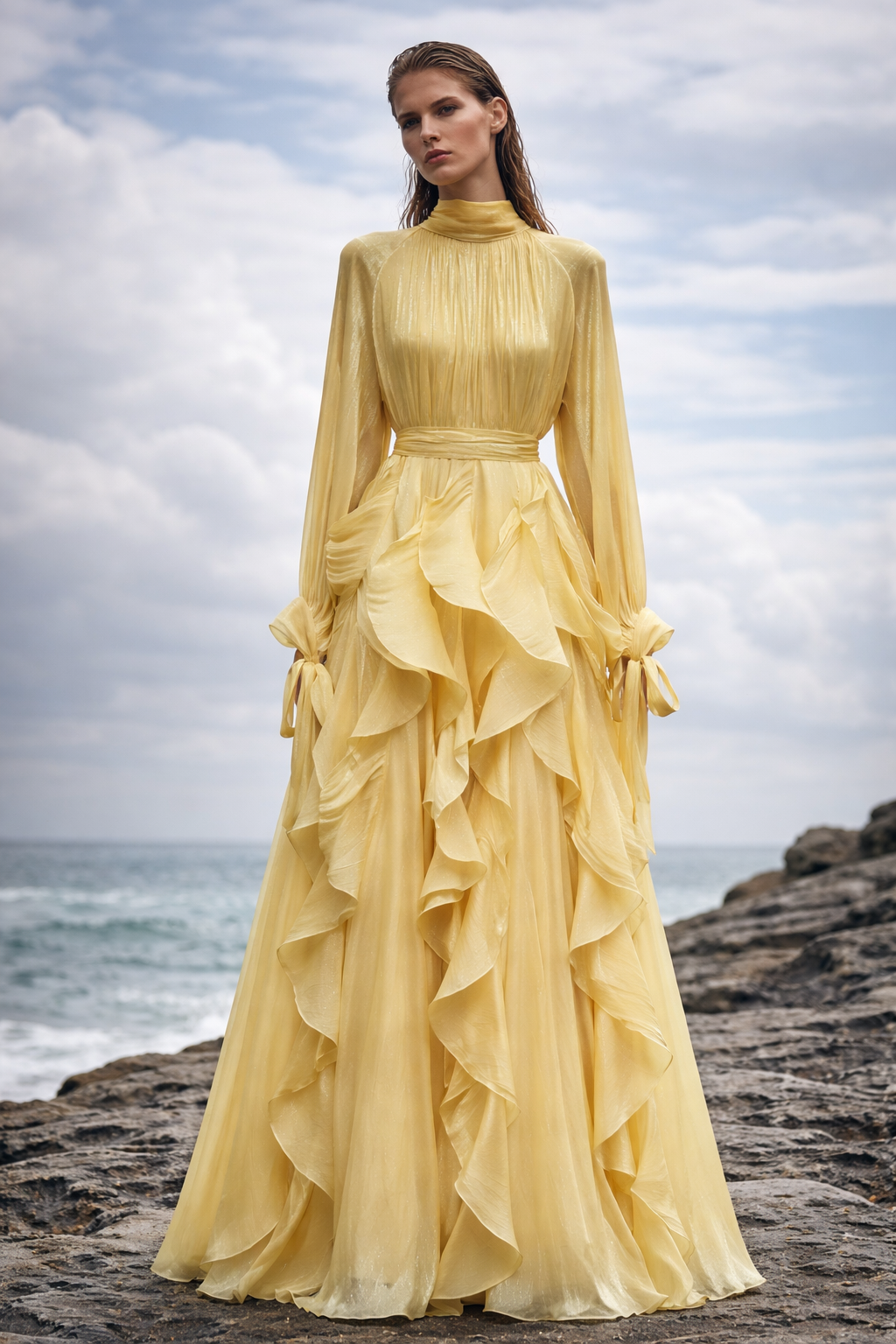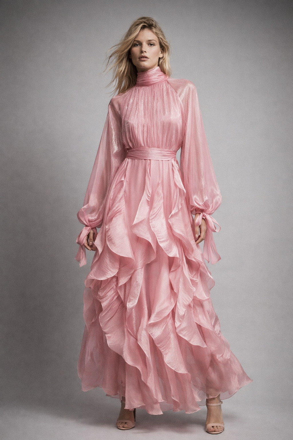 Zwiewna maxi z falbanami, wiązane mankiety, podkreślona talia, kobiecy styl i komfort noszenia.