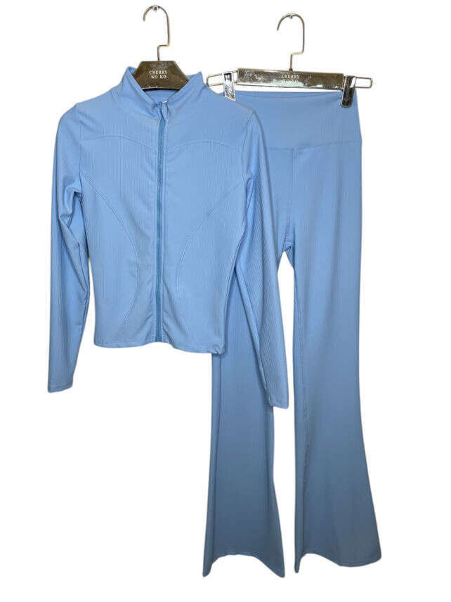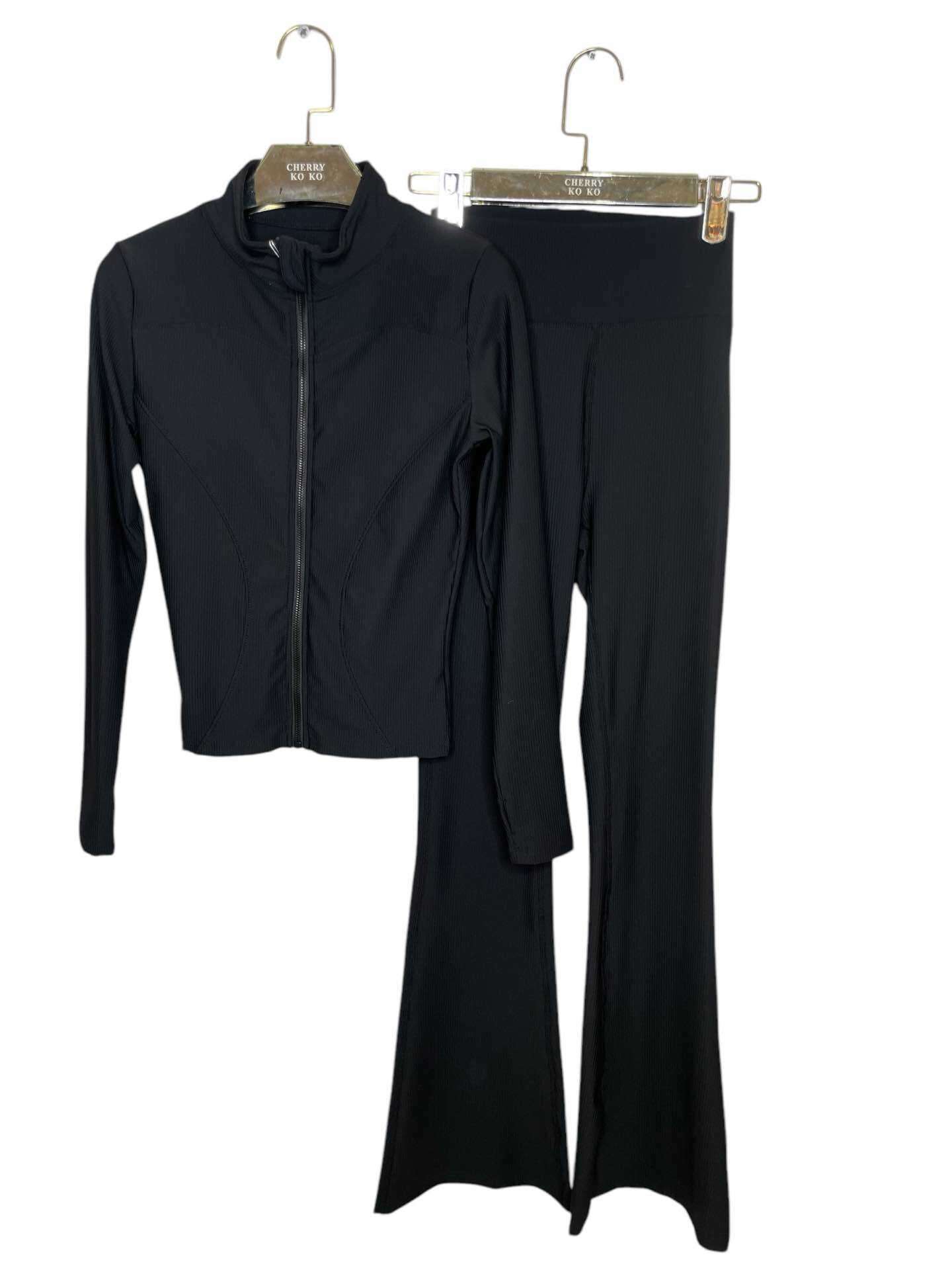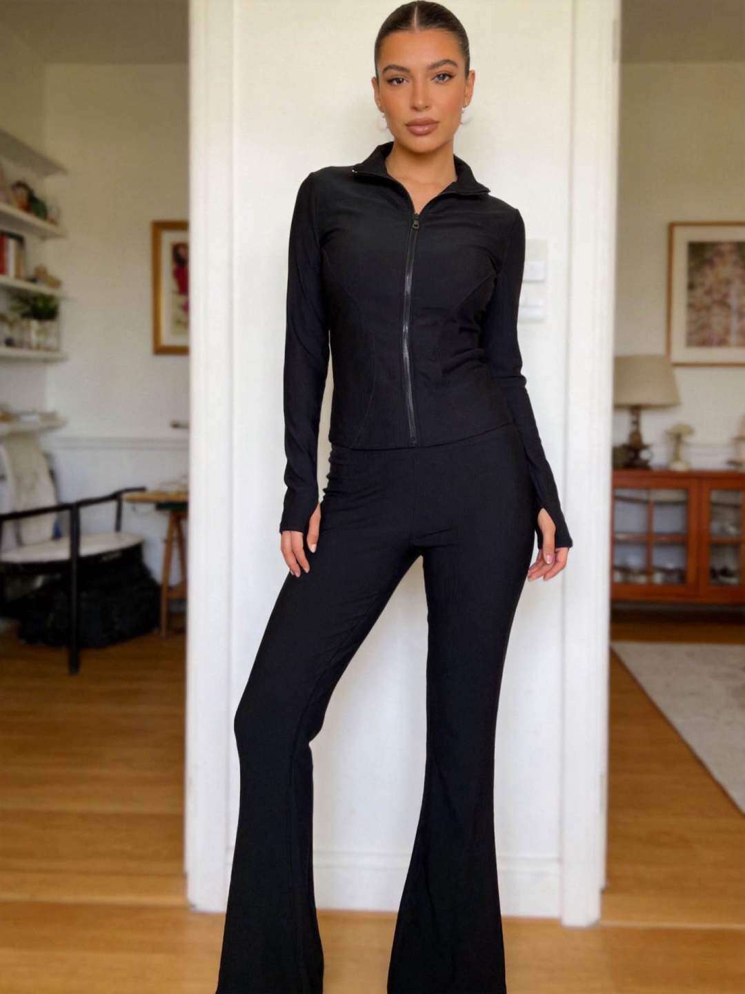 Stylowy komplet z rozkloszowanymi spodniami i dopasowaną bluzą na suwak – idealny na co dzień i wyjątkowe okazje.