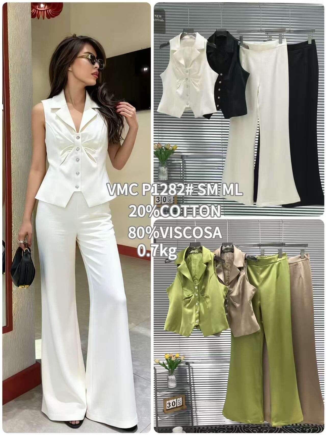 Komplet ANASTAZJA to propozycja dla kobiet ceniących klasyczny styl z nowoczesnym akcentem. Kamizelka z efektownym wiązaniem i szerokie, lekko rozszerzane spodnie prezentują się niezwykle szykownie – zarówno w zieleni, czerni, beżu, jak i cappuccino. Uszyty z wysokogatunkowej mieszanki bawełny i wiskozy (20% cotton, 80% viscosa), zapewnia komfort noszenia i doskonałe dopasowanie. Dostępny w rozmiarach S/M oraz M/L, sprawdzi się zarówno w codziennych stylizacjach do pracy, jak i na wyjątkowe okazje. Idealny wybór do hurtowej sprzedaży – niezbędny w każdej kolekcji modnej odzieży damskiej!