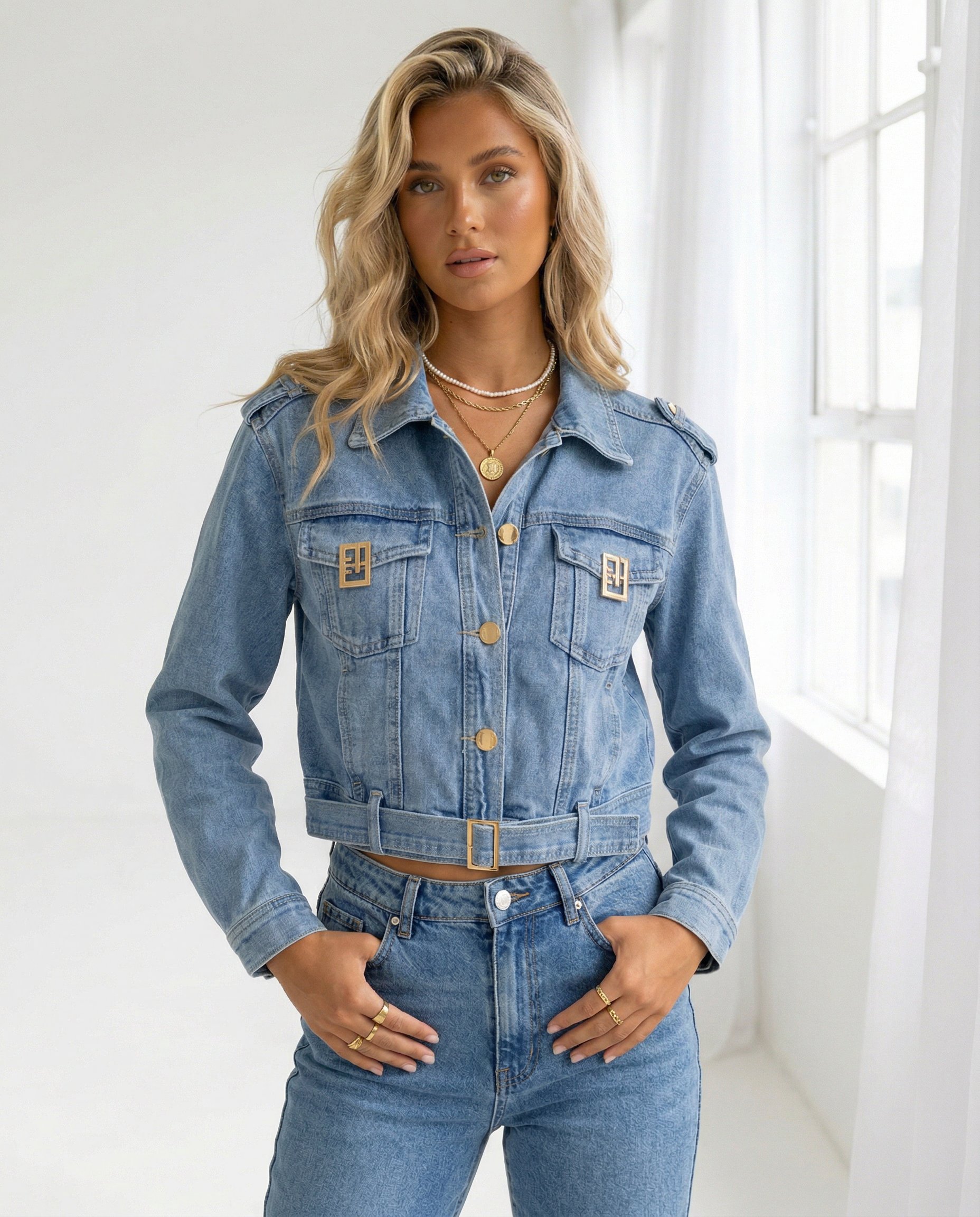 Kurtka jeansowa w kolorze jasny jeans to must-have w każdej kolekcji hurtowej. Uniwersalny model łączy modny styl z wygodą, dzięki krojowi regulowanemu paskiem i praktycznym kieszeniom ozdobionym złotymi elementami. Wysokiej jakości denim zapewnia komfort noszenia i trwałość, a ponadczasowy odcień sprawia, że kurtka łatwo komponuje się zarówno ze sportowymi, jak i casualowymi stylizacjami. Doskonały wybór na wiosnę, jesień czy chłodniejsze letnie wieczory. Dostępność różnych rozmiarów pozwala dopasować produkt do potrzeb szerokiego grona klientek.