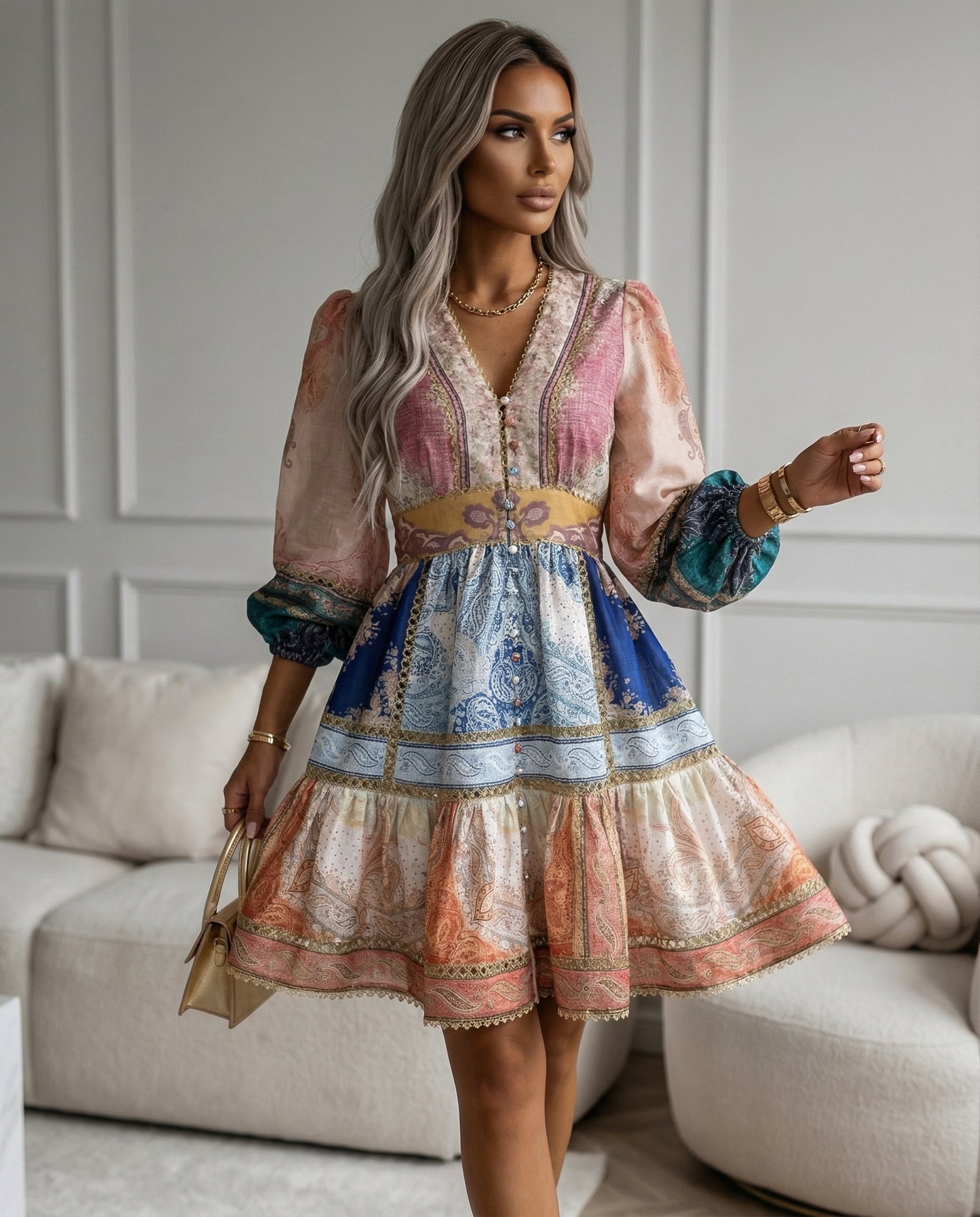 Sukienka PENELOPA to propozycja, która zachwyci każdą klientkę szukającą wyjątkowego stylu. Model o rozkloszowanym fasonie pięknie podkreśla sylwetkę, a lekki materiał zapewnia komfort noszenia przez cały dzień. Bufiaste rękawy, efektowne złote lamówki i bogata, multikolorowa kolorystyka sprawiają, że każda stylizacja nabiera niepowtarzalnego charakteru. Sukienka idealnie sprawdzi się zarówno na wyjątkowe okazje, jak i w stylizacjach codziennych — wystarczy zmienić dodatki! Dostępna w szerokiej gamie rozmiarów, doskonale wpisuje się w aktualne trendy, gwarantując duże zainteresowanie wśród klientek hurtowych.