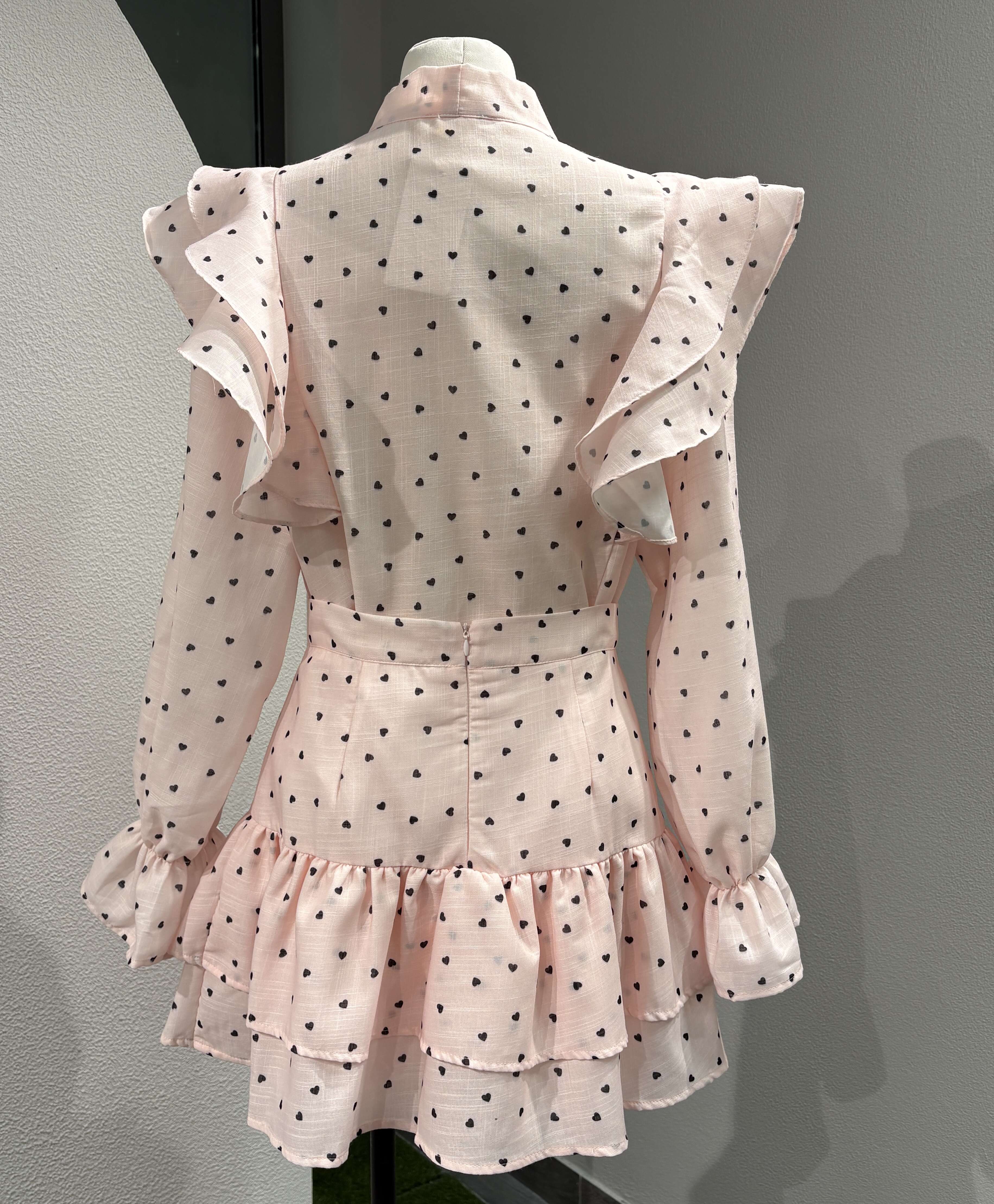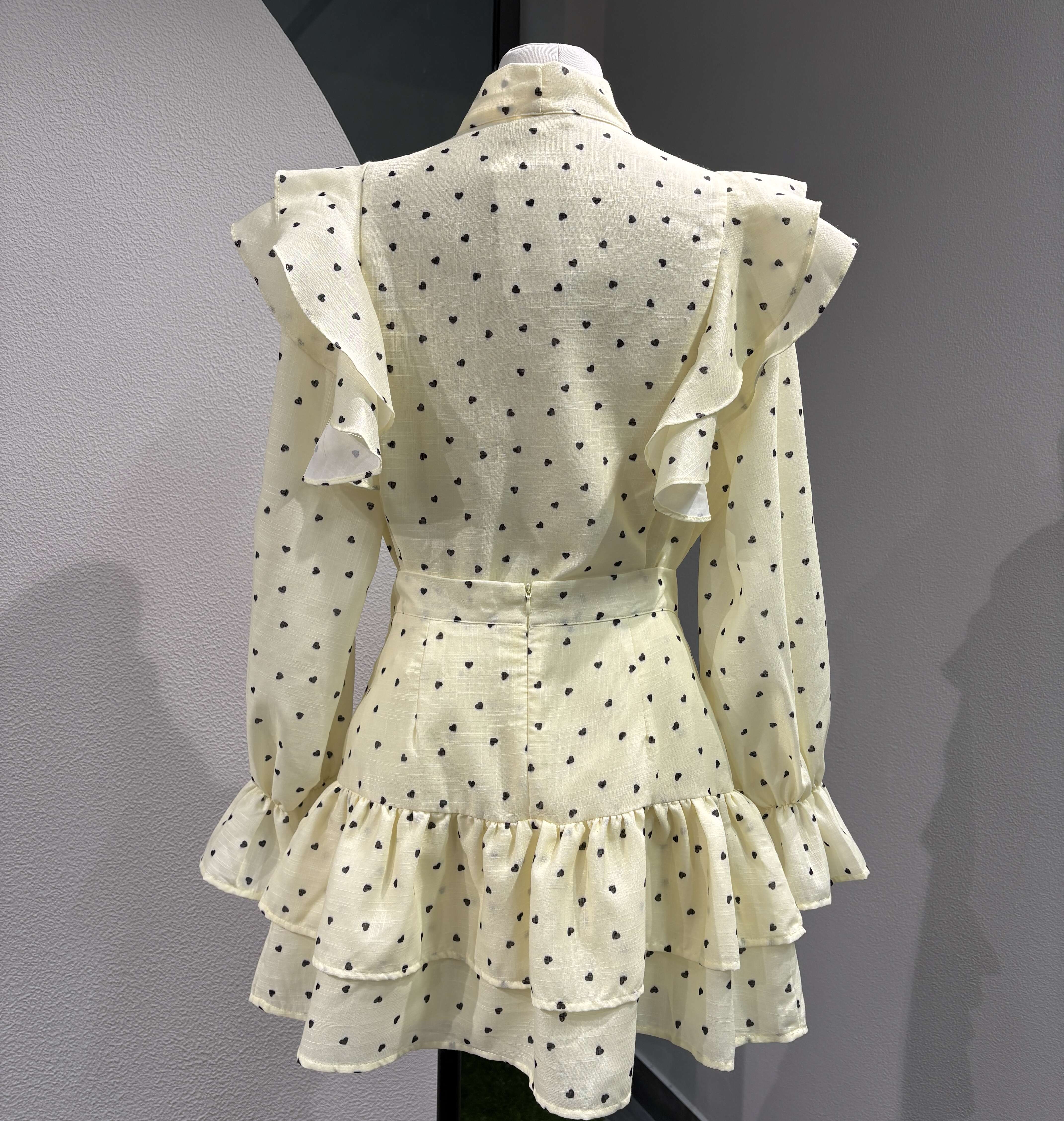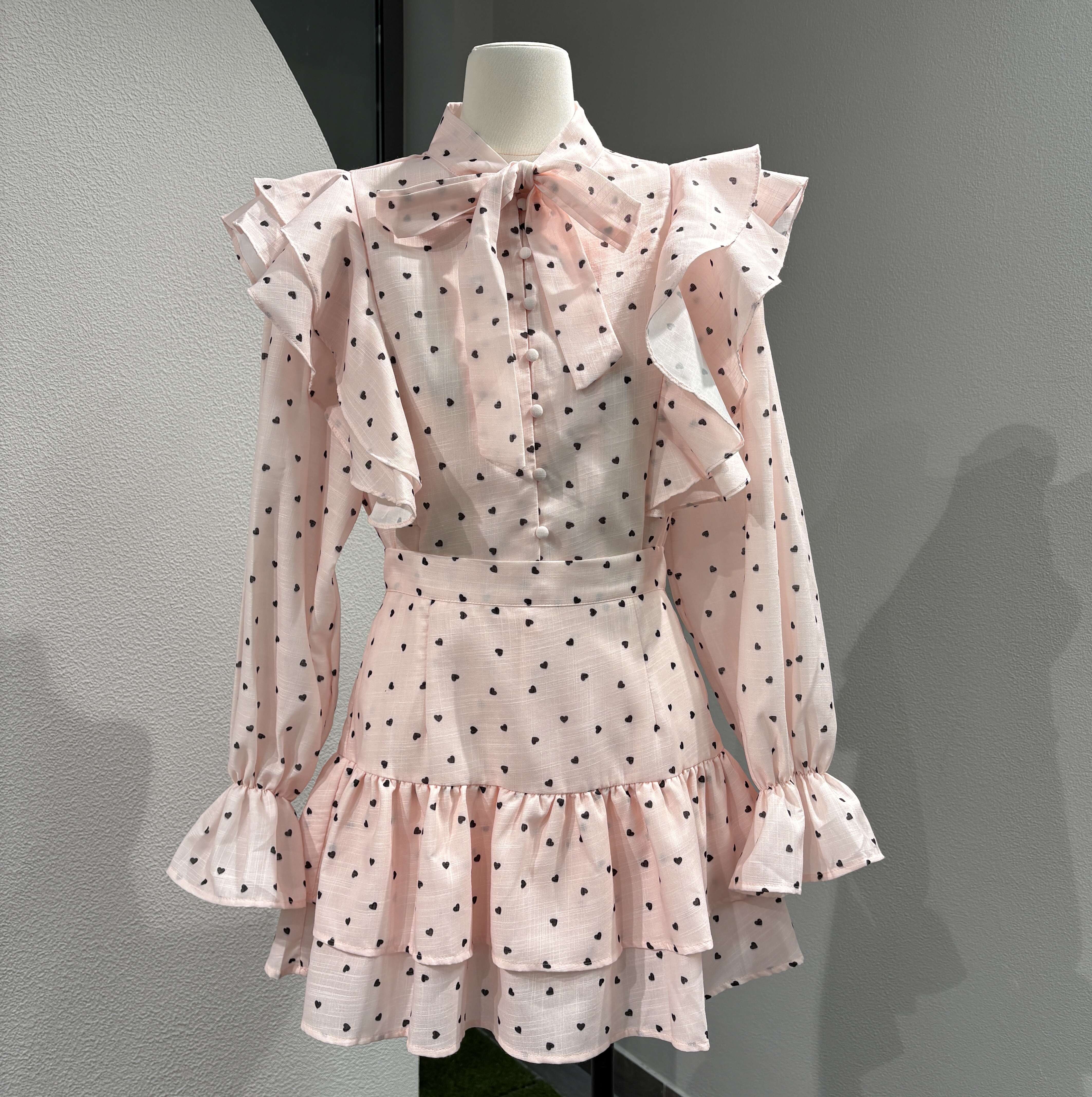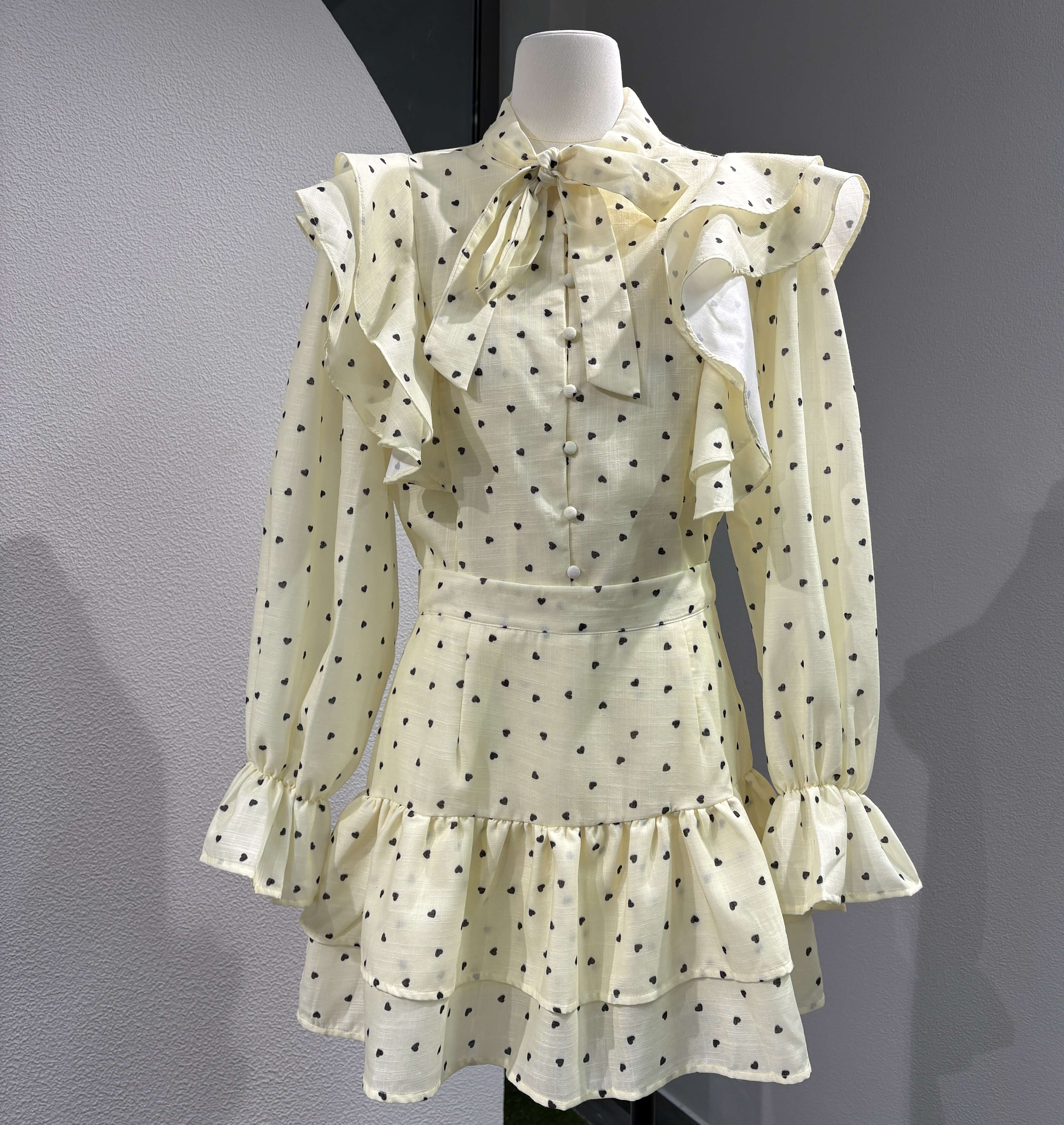 Stylowy komplet z falbanami, kokardą pod szyją i delikatnym printem. Subtelny krój podkreślający sylwetkę zapewnia wygodę i szyk na co dzień i specjalne okazje.