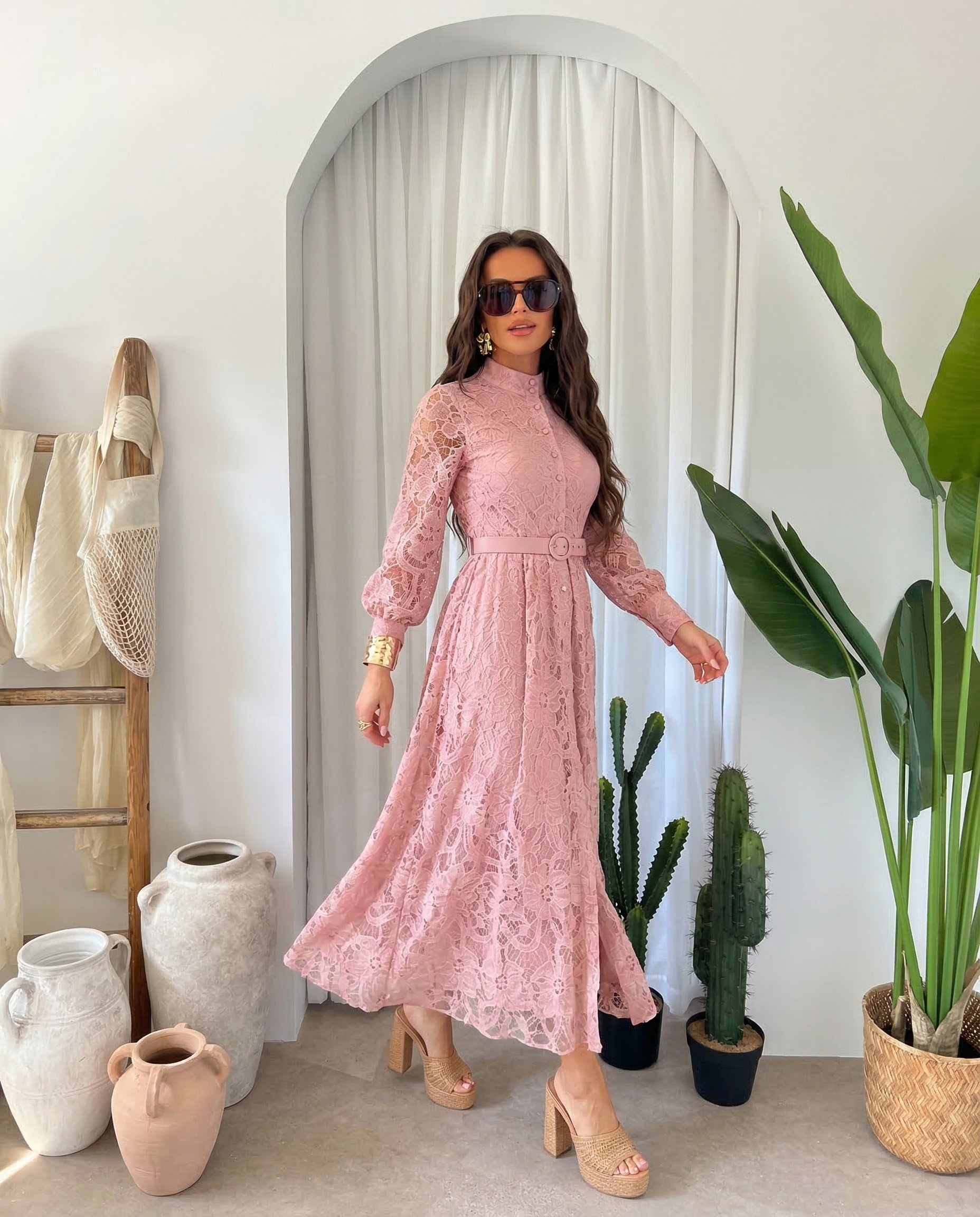 Długa, koronkowa sukienka z wysokim kołnierzem, eleganckimi rękawami i paskiem w talii. Delikatna, przewiewna tkanina i subtelne zdobienia na całej powierzchni.