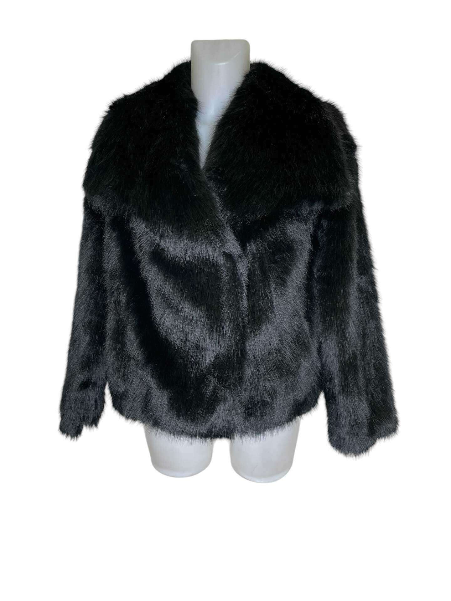 Miękka, elegancka kurtka z futerka, krótki fason, szeroki kołnierz, ciepła i stylowa propozycja na chłodne dni.