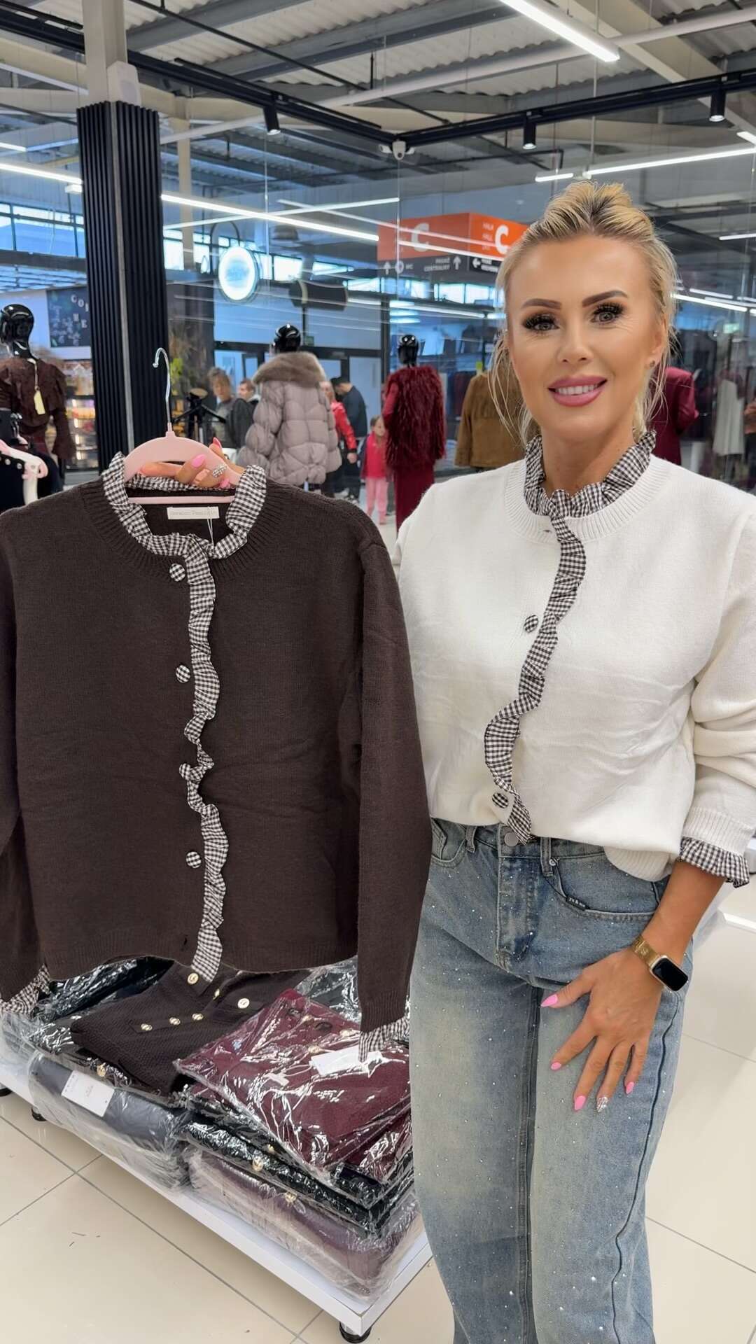 Sweter APRES to propozycja dla miłośniczek wygody połączonej z oryginalnym stylem. Oferowany w odcieniach czekoladowym oraz beżowym, doskonale komponuje się zarówno z eleganckimi, jak i codziennymi stylizacjami. Wykonany z wysokogatunkowej dzianiny, zachwyca detalem - falbankami i modnymi guzikami w kratkę, które przyciągają wzrok. Elastyczny i miękki materiał gwarantuje komfort noszenia przez cały dzień. Dostępny w różnych rozmiarach, idealny na sezon jesień-zima, sprawdzi się na spotkania biznesowe, do pracy czy na co dzień. Doskonała opcja dla sklepów szukających swetrów z modowym twistem w atrakcyjnej cenie hurtowej.