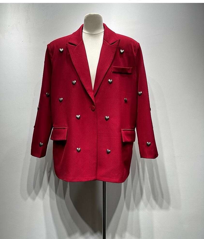 Nowoczesny żakiet z dekoracyjnymi aplikacjami w kształcie serc, prosty fason i efektowny look na każdą okazję.