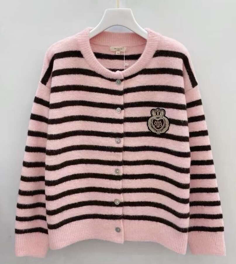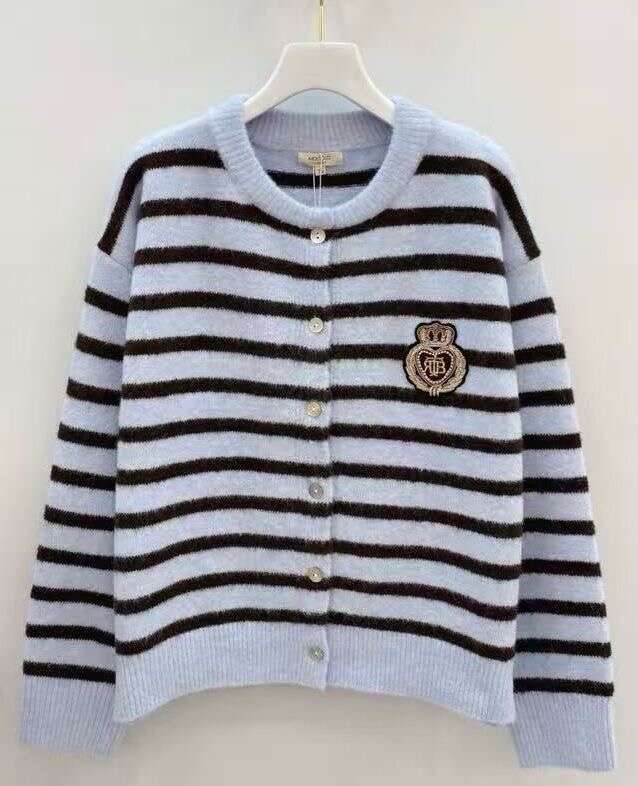 Modny sweter w paski, miękki materiał, naszywka z logo, klasyczny krój, zapinany na guziki.