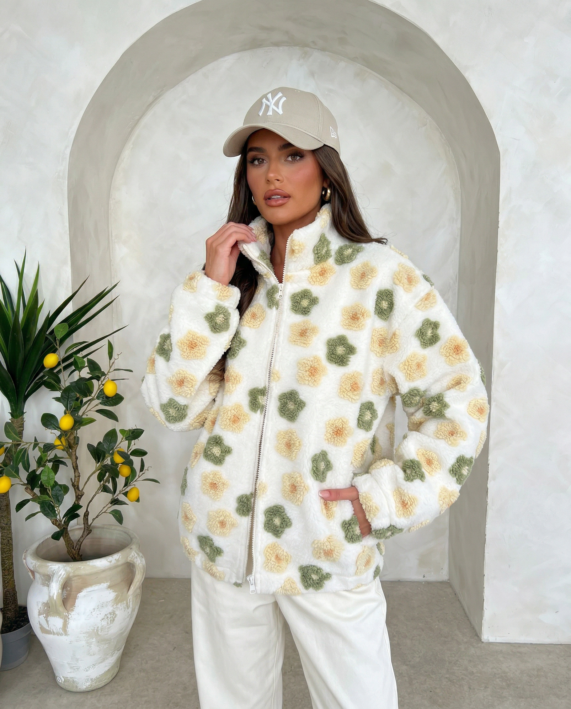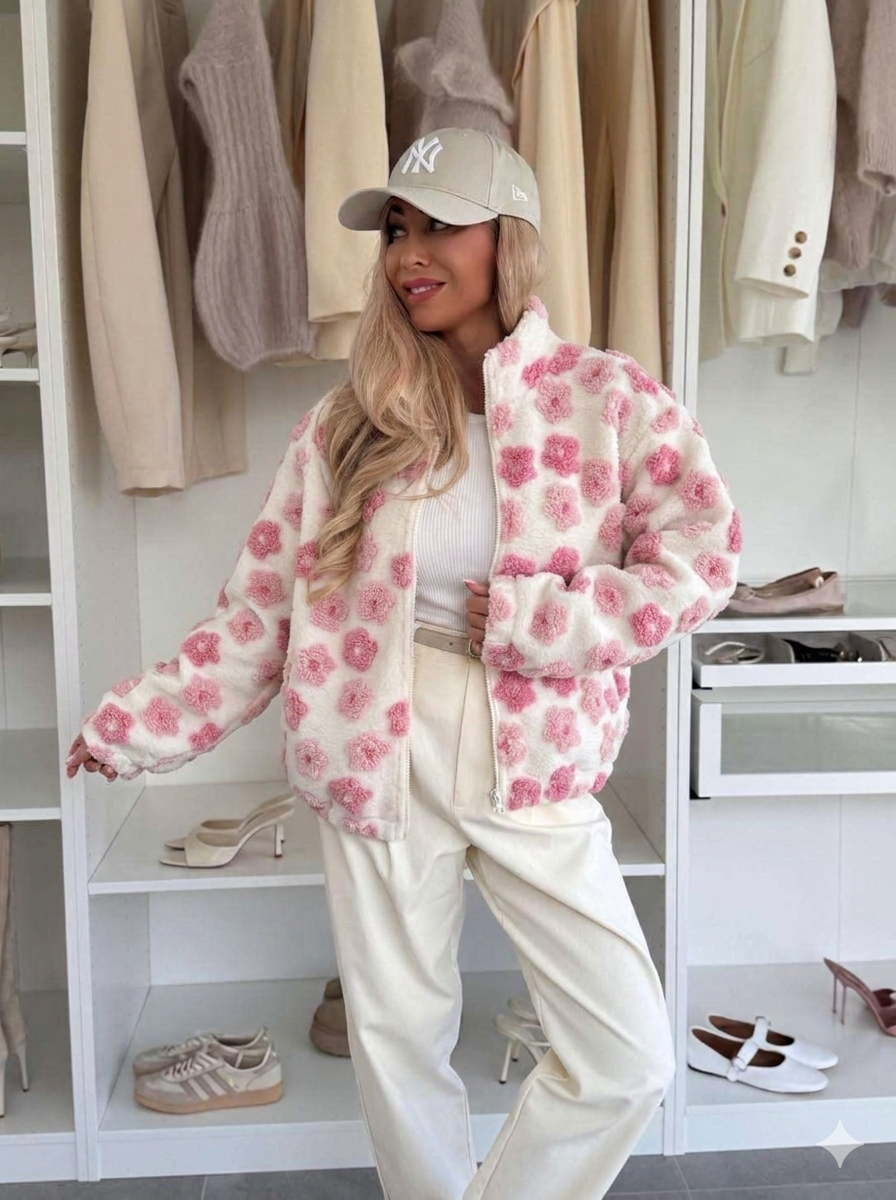 Modna kurtka o luźnym kroju z przyjemnego w dotyku materiału, ozdobiona kwiatowym wzorem. Idealna na chłodniejsze dni – zapewnia styl i komfort.