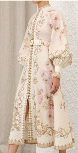 Elegancka sukienka midi w kolorze beżowym, z bufiastymi rękawami i misternymi złotymi wzorami, uszyta z przewiewnej mieszanki bawełny i lnu.